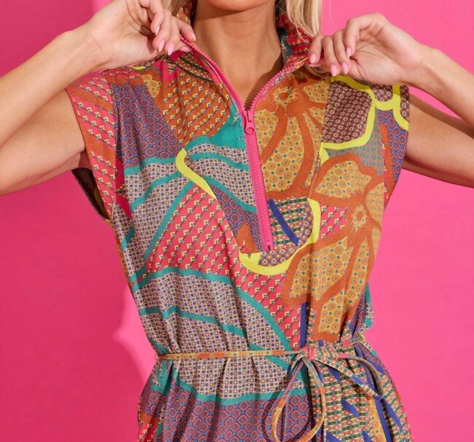 The kind of easy and flattering dress you'll be reaching for all season long. Discover the Alden Adair Leigh Mini Dress, a lively addition to your wardrobe adorned with a vibrant Geo Floral pattern. This A-line dress features short sleeves and a practical zip closure for easy wear, while being crafted from a comfortable cotton blend of 79% Cotton and 21% Polyester. With functional pockets and a stylish collar neckline, this dress originates from a machine washable and tumble dry-friendly fabric. Perfect for vacation or any occasion, this maximalist piece will keep you feeling confident and charming.