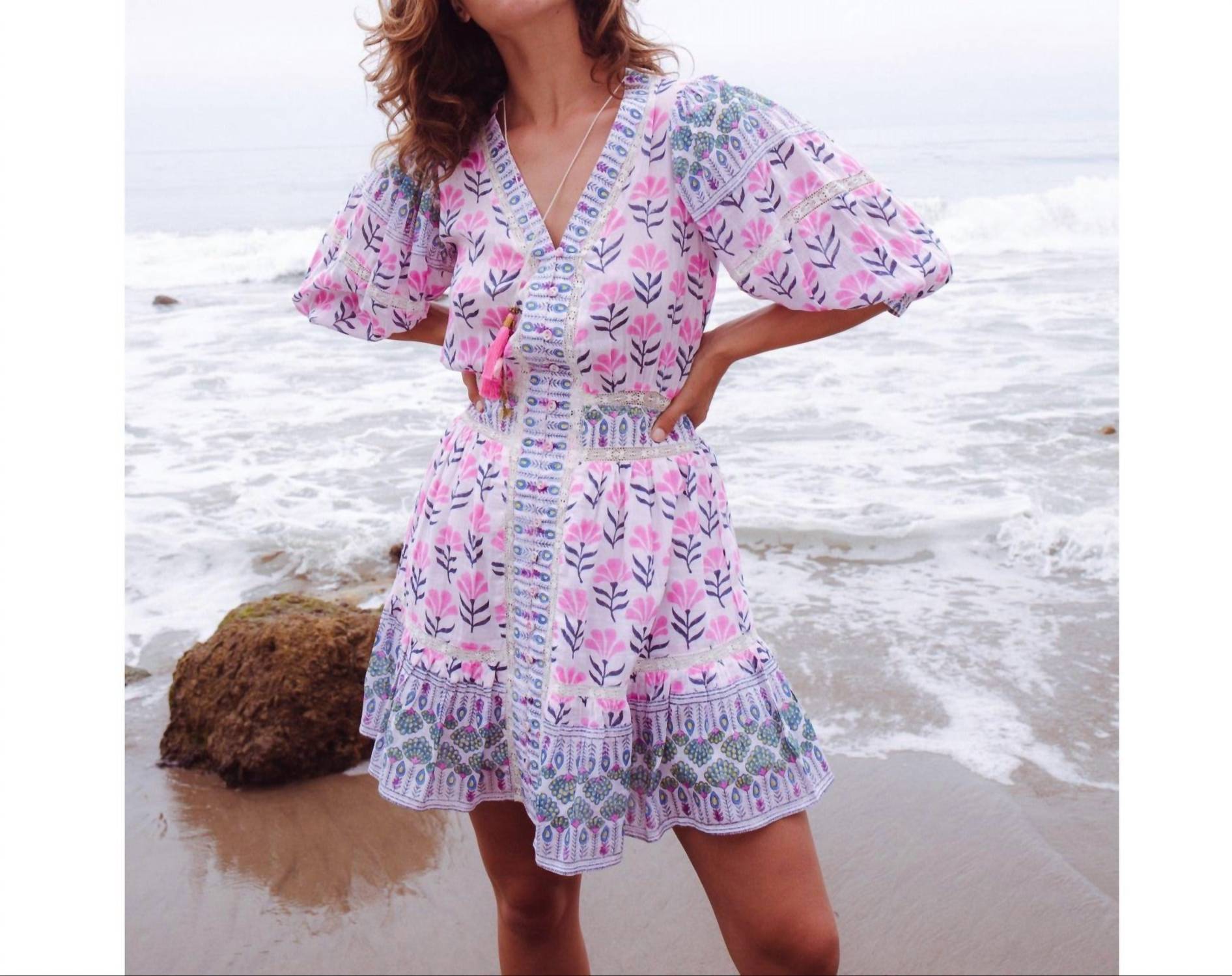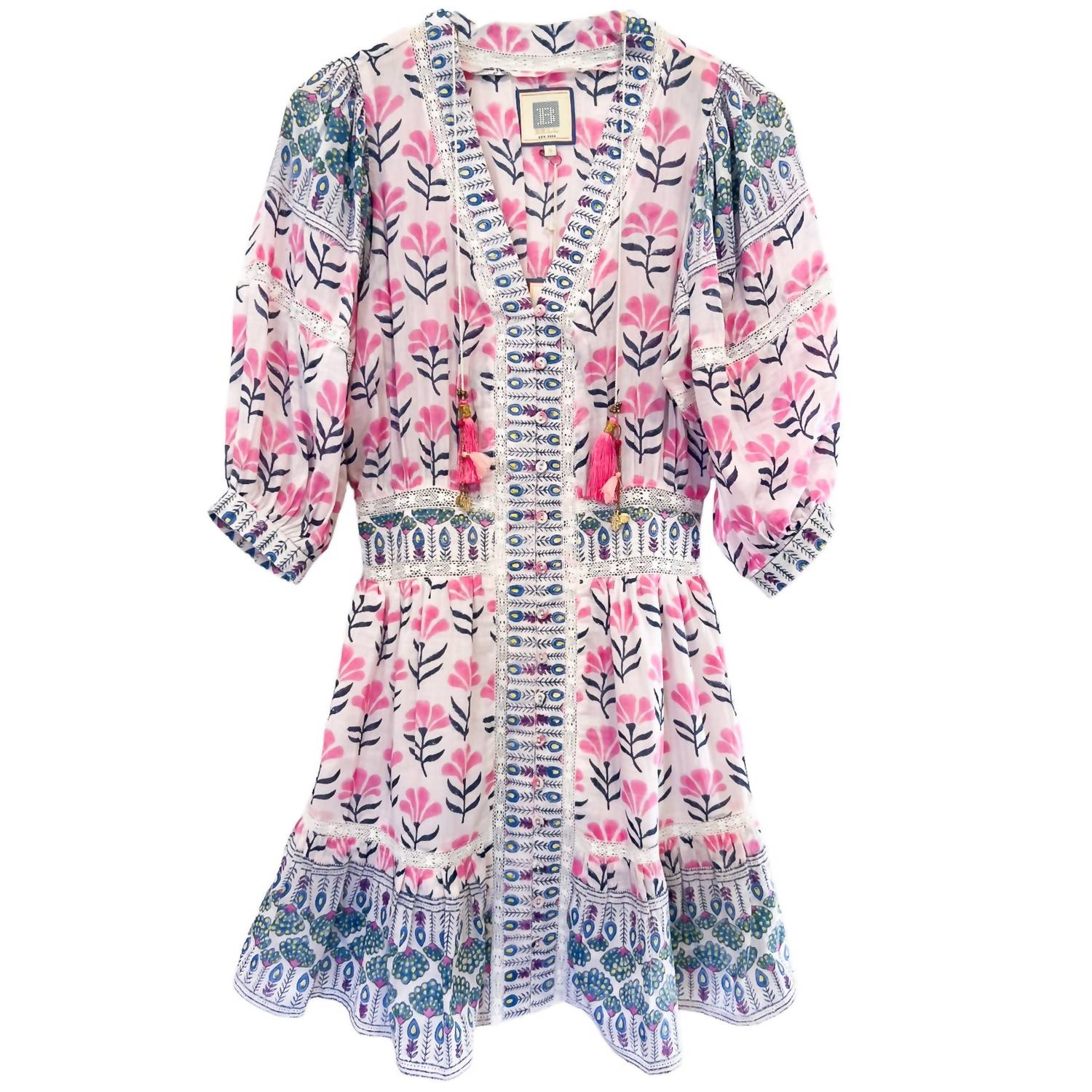 A short and breezy dress for those warmer days. Introducing the Ann Mini Dress by Bell by Alicia Bell, a charming piece with three-quarter puff sleeves perfect for any occasion. Crafted from a luxurious blend of 30% Silk and 70% Cotton, this dress features a captivating Fuschia Navy Flower floral pattern. Designed as an A-line silhouette, it includes button-up detailing with a tassel tie V-neckline. Hand wash only.