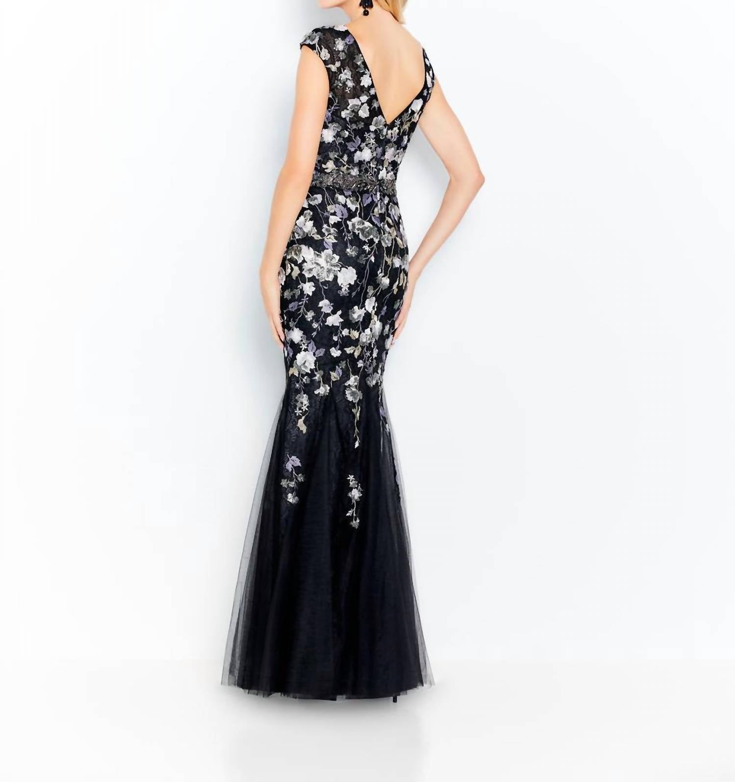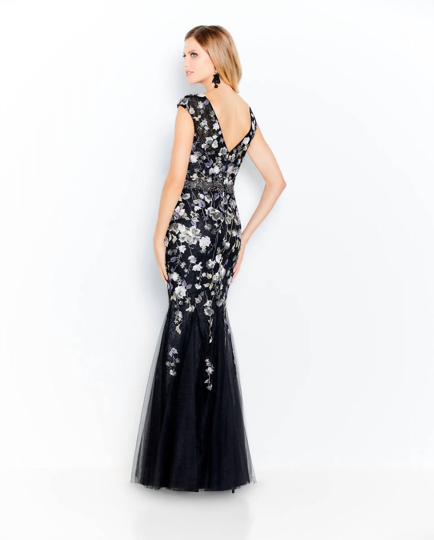 Turn heads in the cutest and most flattering evening dress. Elevate your spring prom look with the Tulle Trumpet Dress by Cameron Blake in a chic black multi floral pattern. Cap sleeve embroidery and tulle trumpet gown, illusion V-Neckline and back, beaded natural waistline, tulle godets create flared skirt. Matching tulle shawl included. This embodies the effortless boho chic trend. Closure: Zip closure. Perfect for a night of celebration, this dress promises to make you the center of attention.