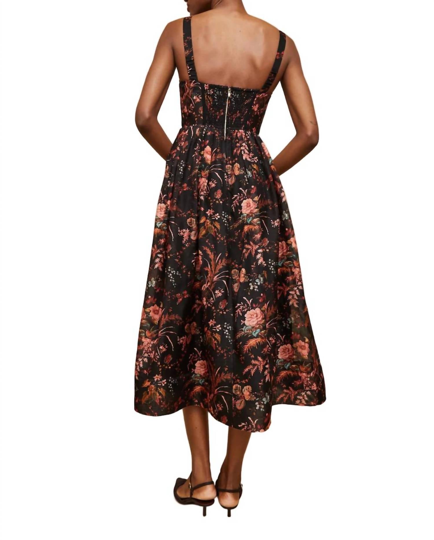 The perfect length dress does exist. Introducing the Phoebe Floral Midi Dress by Cara Cara, an exquisite piece perfect for your evening events. Sleeveless with a sweetheart neckline, this fit and flare silhouette dress features a bustier-style bodice with exposed boning and a puff skirt adorned with a lively floral pattern in Pindell Black. Made from a luxurious linen blend of 52% Linen and 48% Silk, it offers practical side seam pockets and a comfortable smocked back panel. Closure: Zip closure. Care: Dry clean only or hand wash cold, line dry.