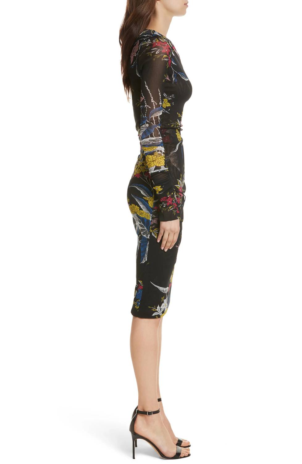 Cute and comfortable, this long sleeve dress has it all. Introducing the Ruched Floral Dress by Diane von Furstenberg, a striking piece in a floral-printed mesh perfect for any dinner party. This dress features sheer long sleeves and a flattering bodycon silhouette with drawstring ruching along the sleeves and a partially slit side, all in an elegant 50" length. Made from 100% nylon, this dress effortlessly embodies 90s fashion trends. Originating from China, it has a chic surplice V-neck and requires dry cleaning.