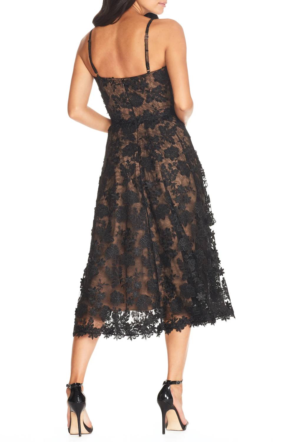 The perfect length dress does exist. Step into the spotlight at your next cocktail party with the Tahani Floral Midi Cocktail Dress from Dress the Population. This exquisite piece features a deep V-neck and charming spaghetti straps, showcasing a trendy 90s flair with its floral embroidered lace. Made from 100% nylon, the dress offers a voluminous fit-and-flare silhouette with a 35" center front length, perfect for summer occasions. Enjoy the convenience of a hidden back-zip closure, and maintain its beauty with hand washing and laying flat to dry.