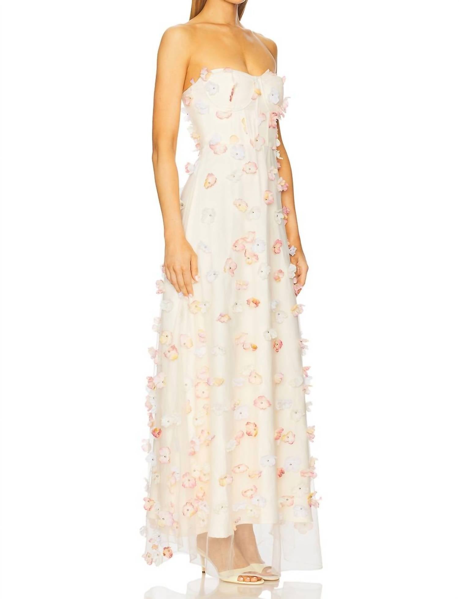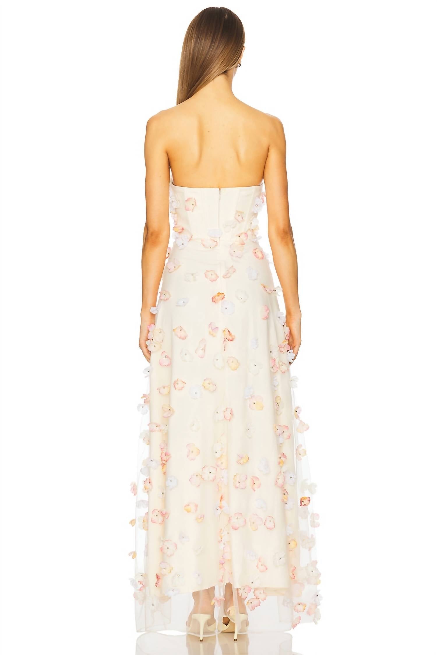 No straps necessary! Introducing the Livia Strapless Maxi Dress by ELLIATT, a stunning choice for summer's cocktail parties and special events. This multi-colored dress is meticulously crafted from 100% Polyester with a flowing 54-inch A-line silhouette, ideal for creating an elegant entrance. Showcasing a sweetheart neckline, it features bust cups and boning detailing for essential structure and support, while the 3D floral tulle fabrication adds a dreamy, sophisticated finish. Made with a zip closure and recommended for dry cleaning, it ensures a seamless and polished appearance suitable for any refined occasion.