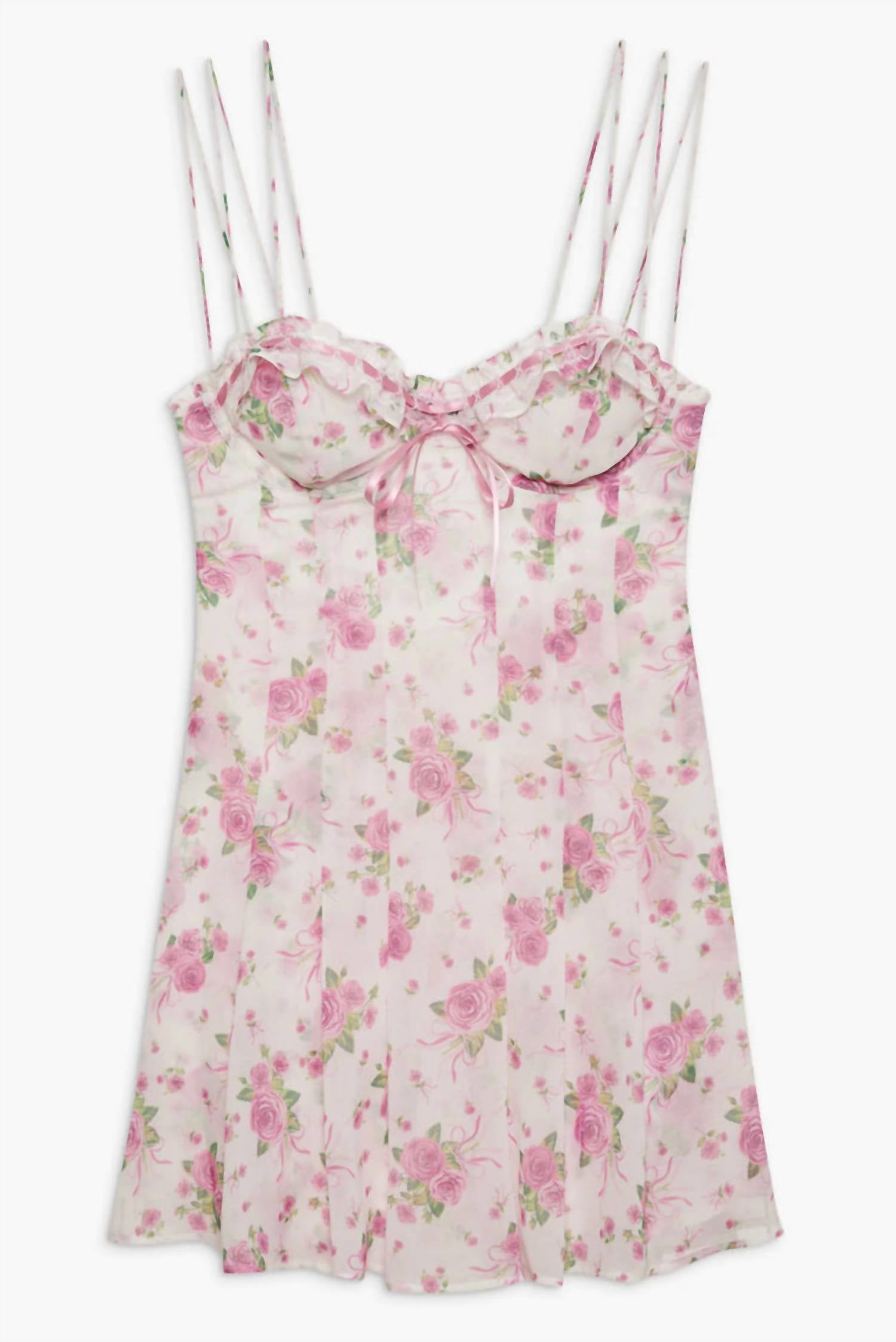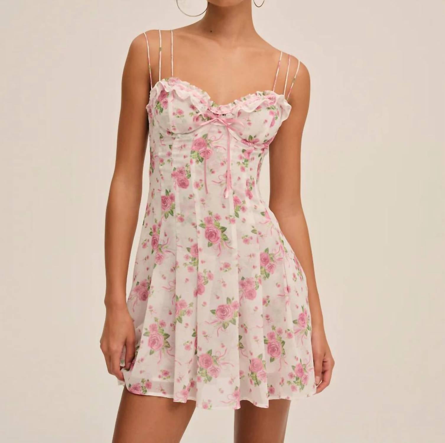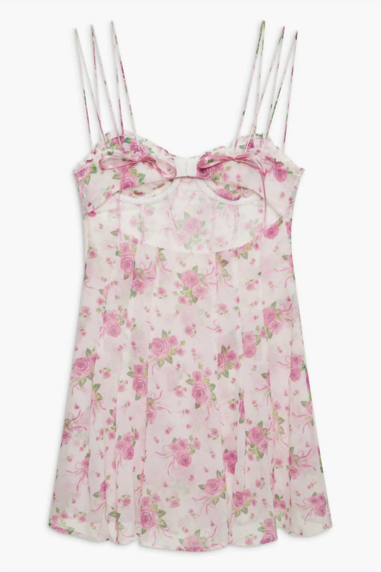 A short and breezy dress for those warmer days. Introducing the Kate Mini Dress by For Love & Lemons, a playful embodiment of romance in floral pink. This summer-ready mini dress features delicate spaghetti straps and a dreamy chiffon fabric crafted from 60% cotton and 40% nylon. With a fitted bust, it flares out into a charming pleated skirt, complemented by a seductive low-cut open back. The dress includes an invisible zip closure and hook-and-eye fastening at the center back, and should be dry cleaned only. Length: 32.5" (Size Small(