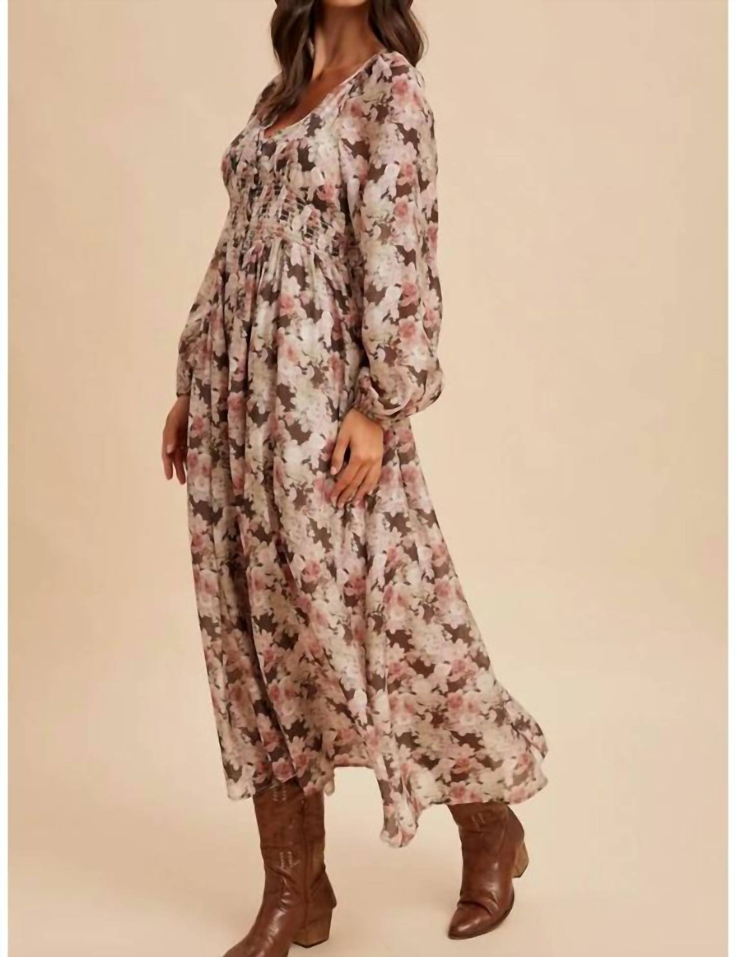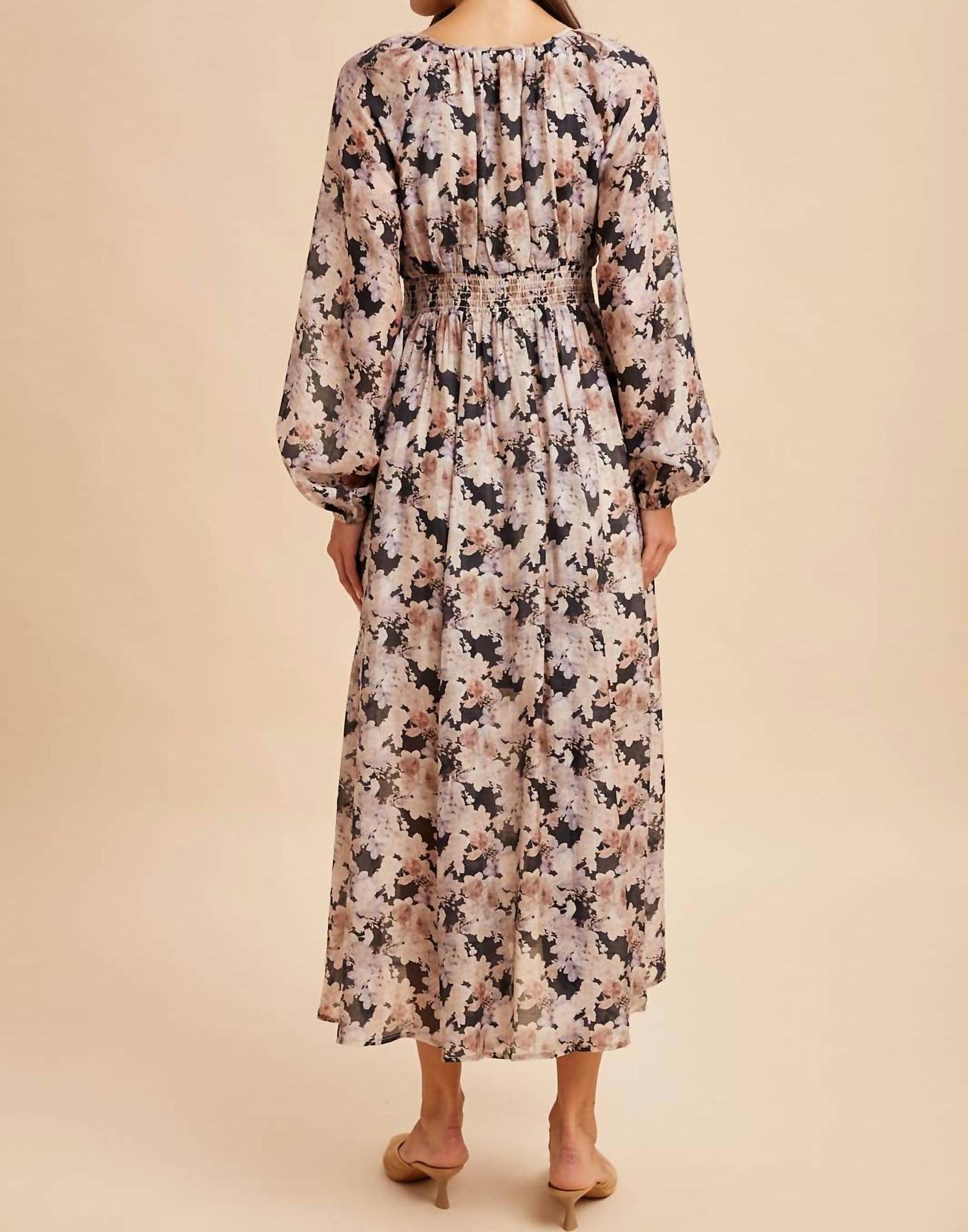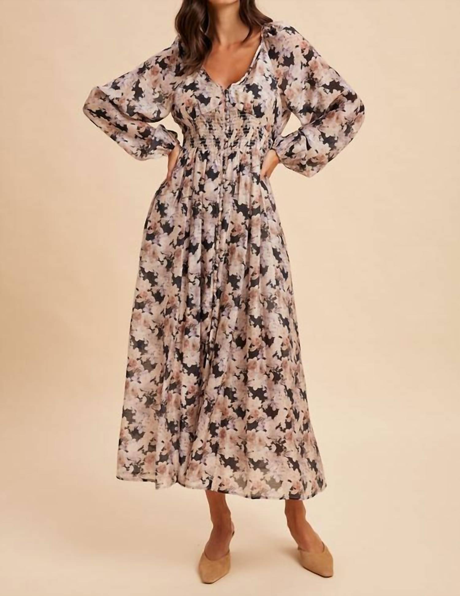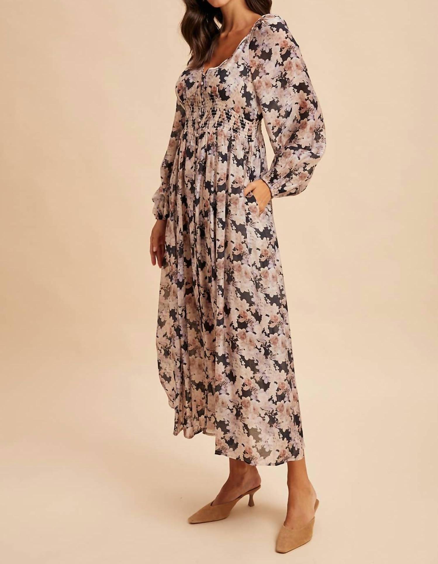 Who doesn't love a good maxi dress? This one you'll be reaching for season after season. Introducing the Bloom Maxi Dress by IN-LOOM, a captivating floral piece in Midnight perfect for any occasion. This dress features long raglan sleeves that flow gracefully into an A-line silhouette. Crafted from a Tencel-blend floral fabric with a smocked elastic waistband, it includes practical side pockets for added convenience. Closure: Functional button front. The self fabric is composed of 82% Tencel and 18% Nylon, with a 100% Rayon lining. Ideal for spring events, this dress effortlessly embodies the Boho Chic trend.