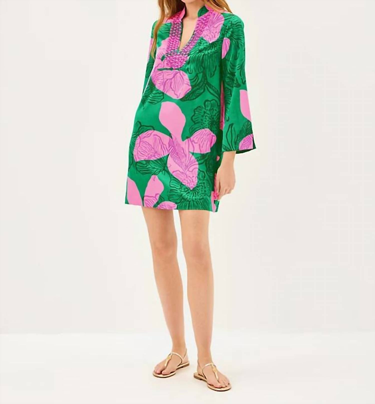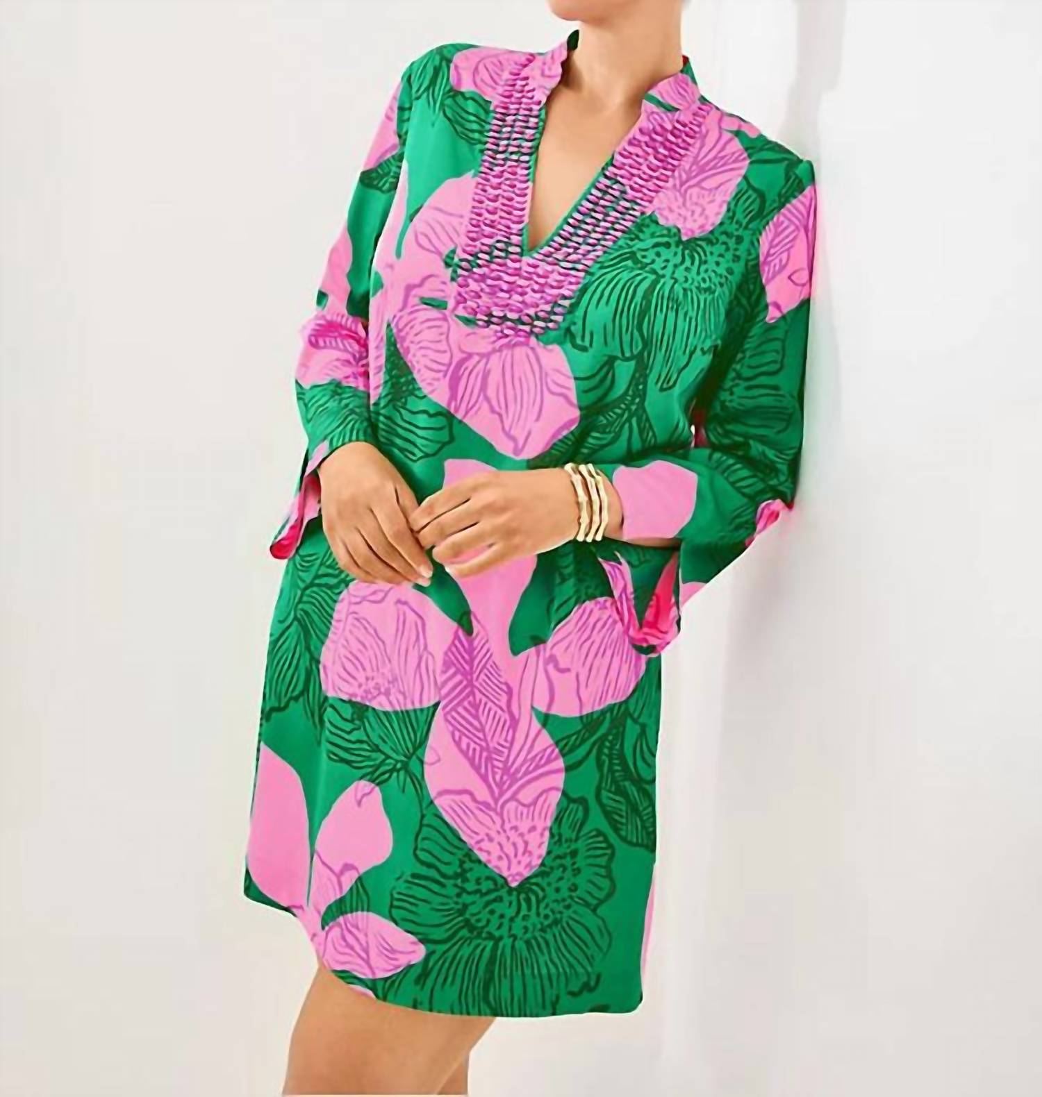 The pefect long sleeve dress for those cooler months. Discover the Irella Caftan Dress by Lilly Pulitzer, a vibrant choice in Kitts Green that radiates summer vibes with its floral pattern. Featuring long sleeves and a stand collar with delicate beaded details, this dress skims the body for a relaxed, roomier fit. Measuring 36 inches from shoulder to hem, it's a versatile piece made for vacations and can be adjusted for extra length as needed. This imported dress offers easy pull-on closure, embodying a boho chic trend perfect for casual outings.