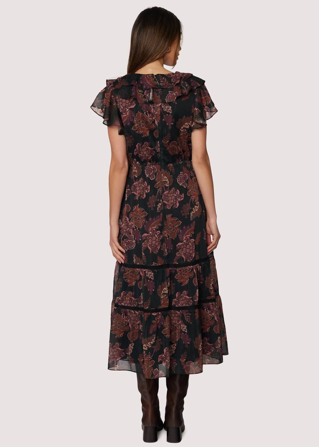 Pair with your favorite sandals for an effortlessly chic look. Introducing the Whispers of Bohemia Midi Dress by Lost + Wander, a stunning addition to your fall wardrobe with its black plum floral print. This evening-ready piece features short sleeves and an A-line silhouette crafted from 100% rayon for a soft, flowy feel. Designed with a V-neckline and convenient pull-on closure, it's perfect for any festive occasion, from Thanksgiving to evening events. Care instructions: Machine wash and lay flat to dry. Model is wearing a size small; item runs true to size.
