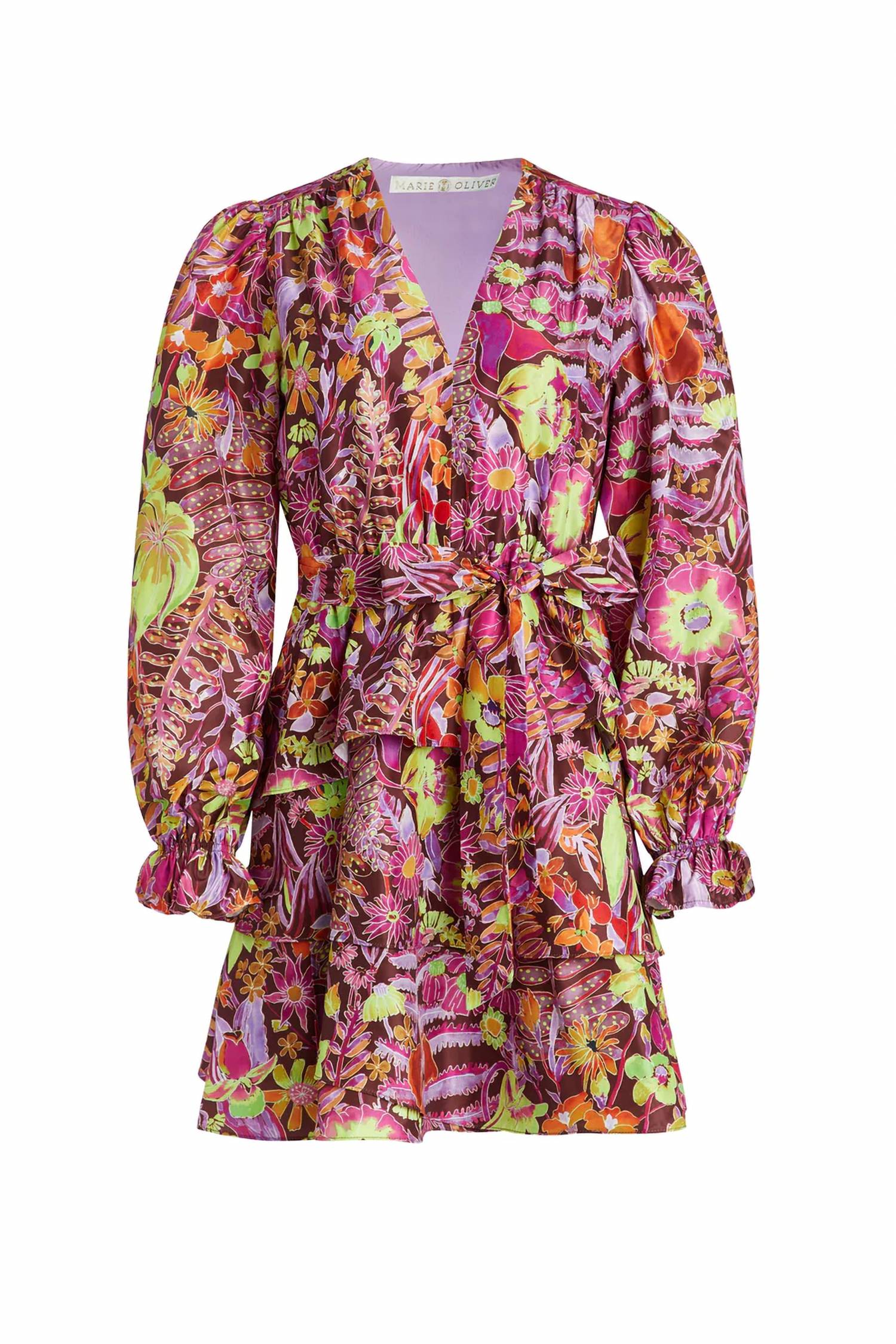 The pefect long sleeve dress for those cooler months. Elevate your evening wardrobe with the Marie Oliver Umbra Mini Dress, a stunning choice for dinner parties and Easter celebrations. Crafted in 100% polyester, this dress boasts a Firefly Floral print featuring a burgundy background with pops of periwinkle, fuschia, and chartreuse. The long sleeves have a ruffle cuff, while the dress itself features an elegant v-neck, fitted elastic waist, and layered tiered skirt, enhanced by an optional tie belt for added flair. Care instructions recommend hand washing and hang drying or opting for dry cleaning to maintain its Boho Chic charm.