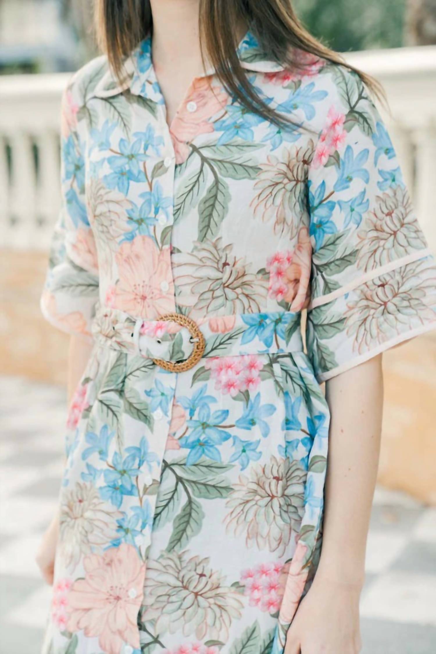 The perfect length dress does exist. The Flora Begonia Dress by Marigold is a chic choice for a summer vacation. Crafted from 100% linen and featuring a lined design, this beige midi dress boasts a collared neckline and a stylish A-line silhouette, enhanced by its elegant short bell sleeves. With convenient side pockets and a front button closure, it offers practicality alongside its floral boho chic charm. Care for your dress with a gentle hand wash and line dry to maintain its quality.