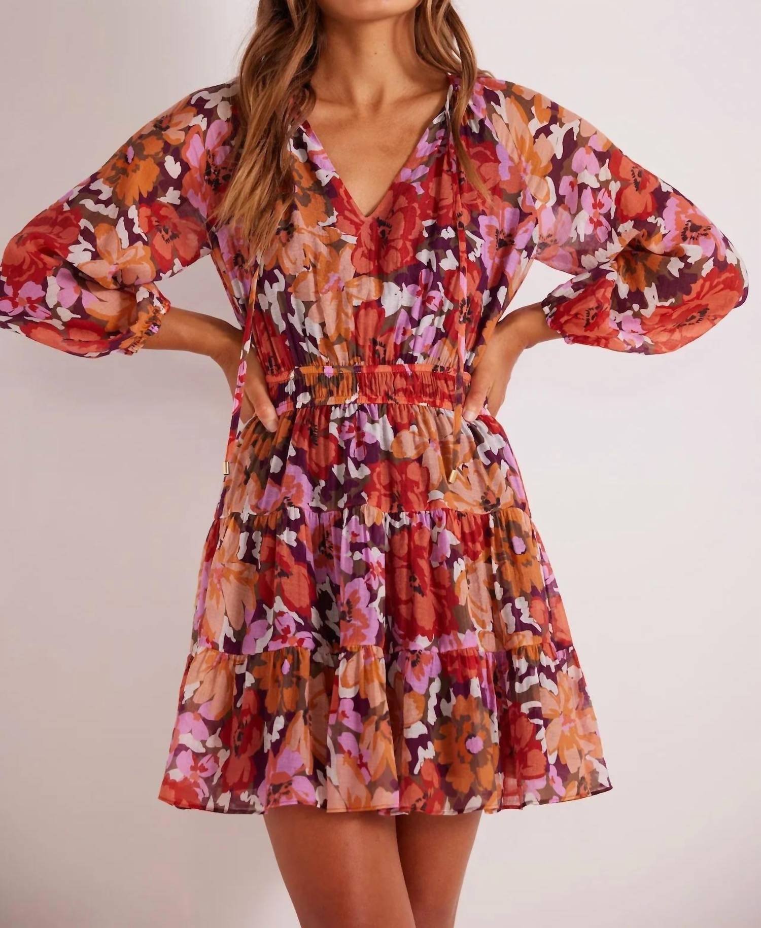 The kind of easy and flattering dress you'll be reaching for all season long. Elevate your wardrobe with the Zanita Mini Dress by MINKPINK, a chic choice for springtime events. This bright floral dress features full-length blouson sleeves with elasticized cuffs for an easy fit and a flattering V-neck with ties and gold toggles. Crafted from a viscose blend, it has a tiered, gathered waist and a 3-tier mini skirt, offering an A-line silhouette perfect for Easter and vacation settings. Care for this beauty by handwashing with mild soap in cold water, keeping it flat and shaded to dry, and ironing warmly on the reverse if necessary.