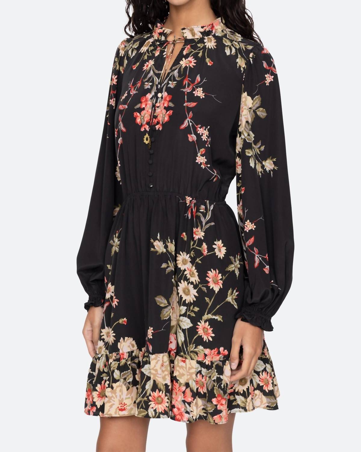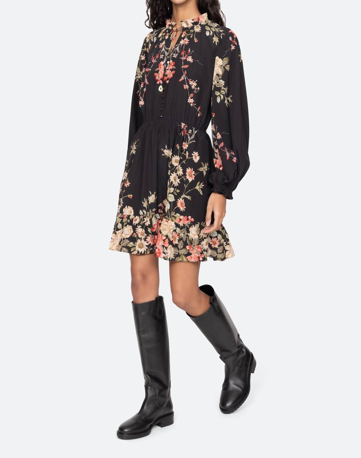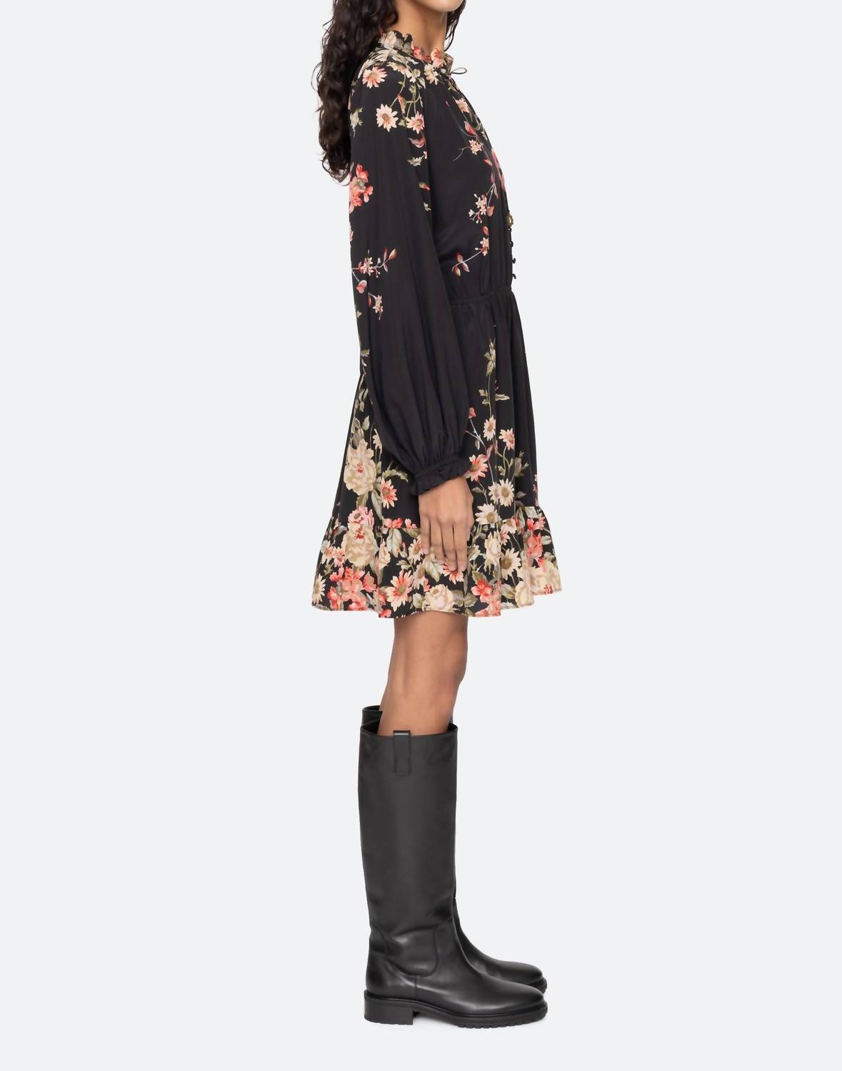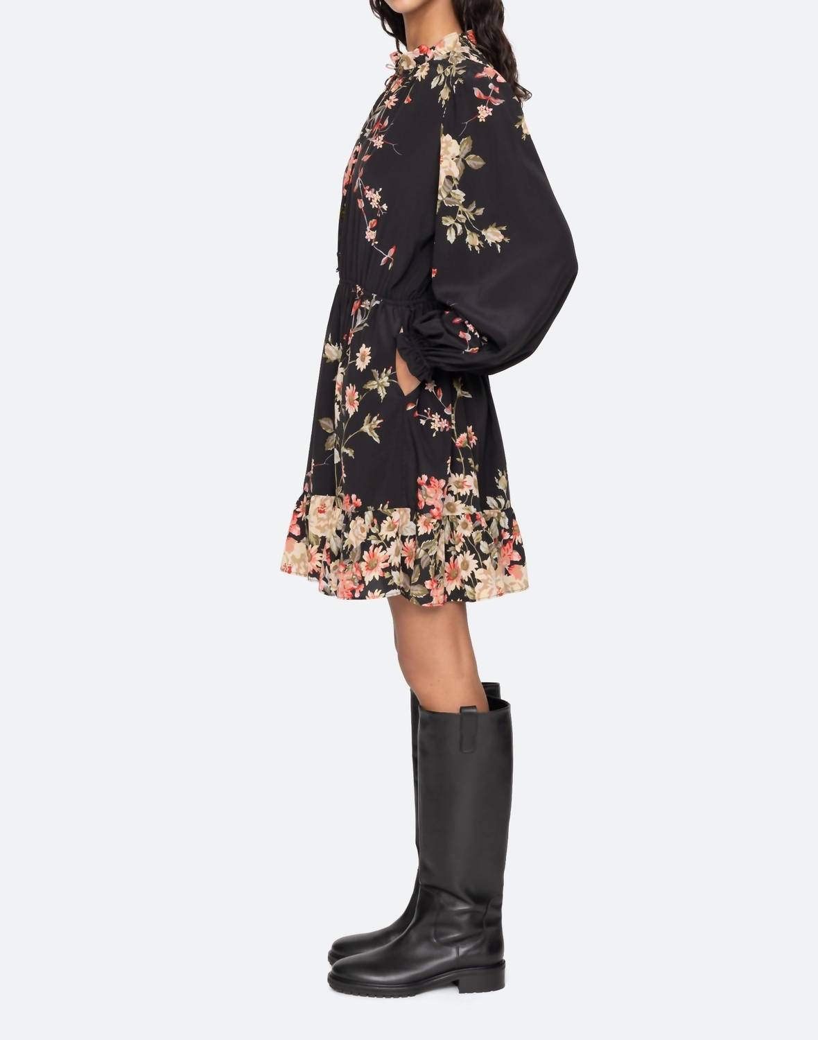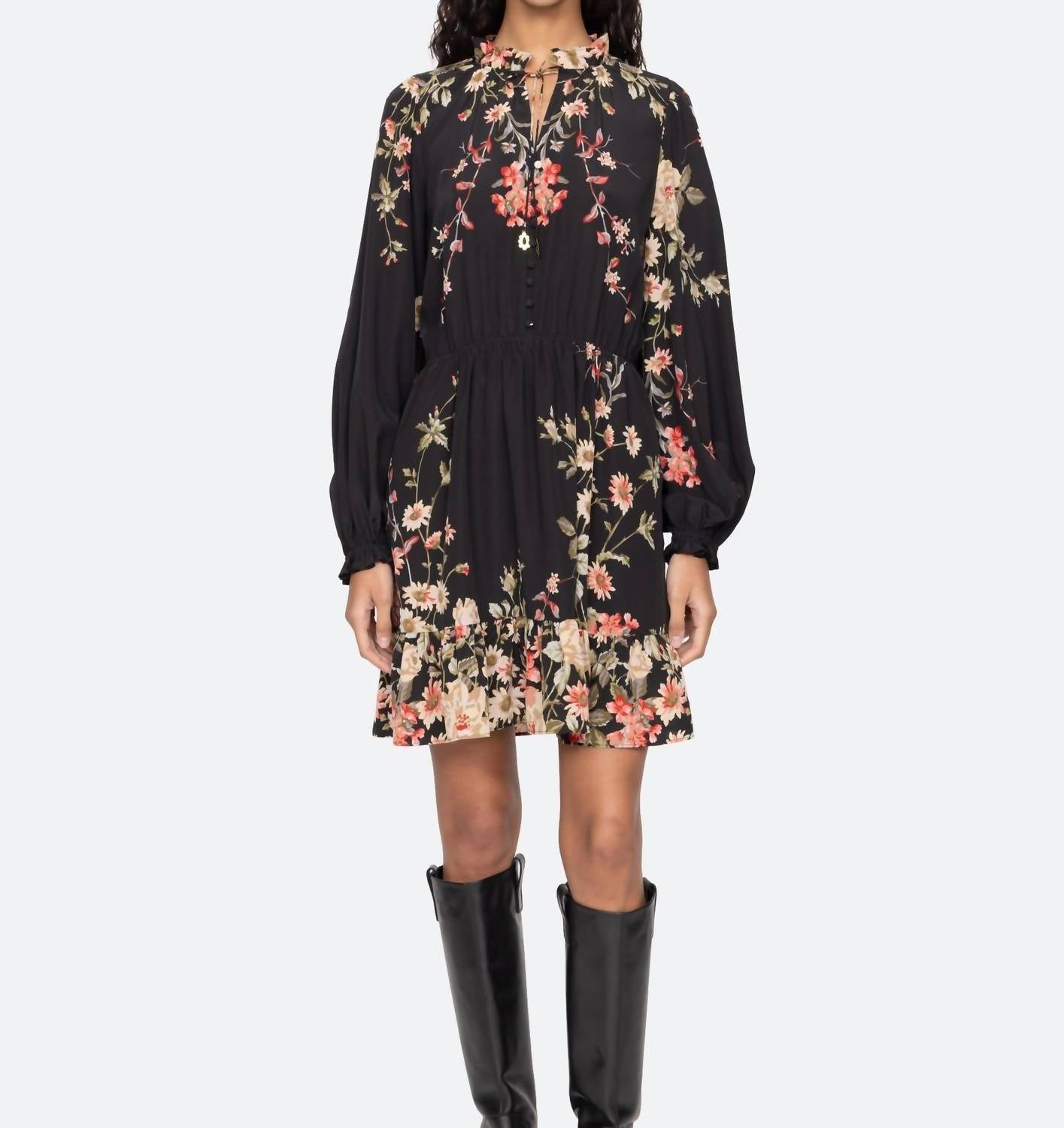 The kind of easy and flattering dress you'll be reaching for all season long. Introducing the Jolie Print Long Sleeve Mini Dress by SEA, an elegant black floral piece perfect for both day and night occasions. This dress is crafted from a luxurious blend of 65% viscose and 35% silk, with a 100% viscose lining that ensures a smooth fit. Designed in a flattering mini length with long puff sleeves and a vintage-inspired silhouette, it features a button front closure with a charming front tie accented by tassel charms. Care for this boho chic design by following its machine wash instructions.