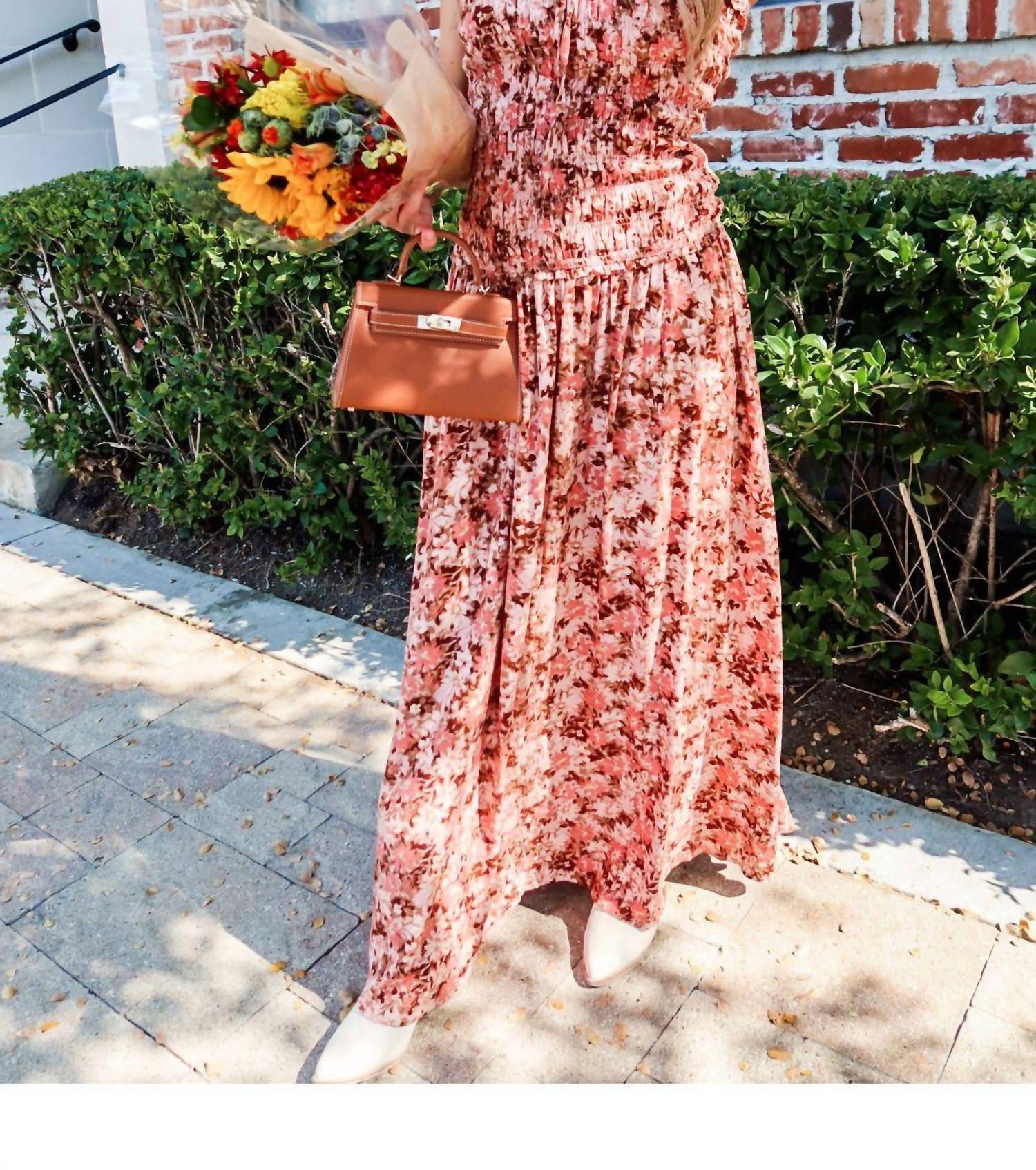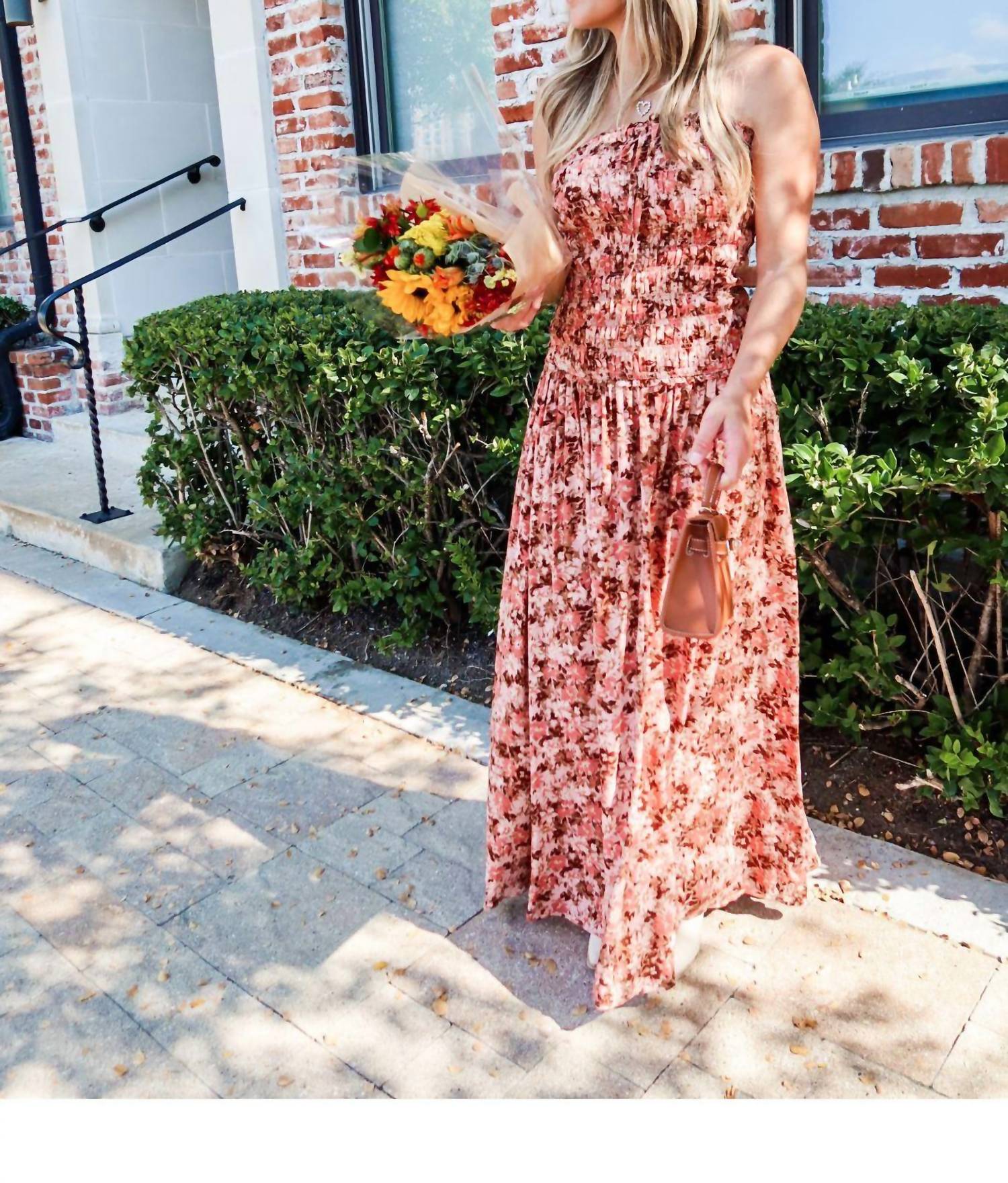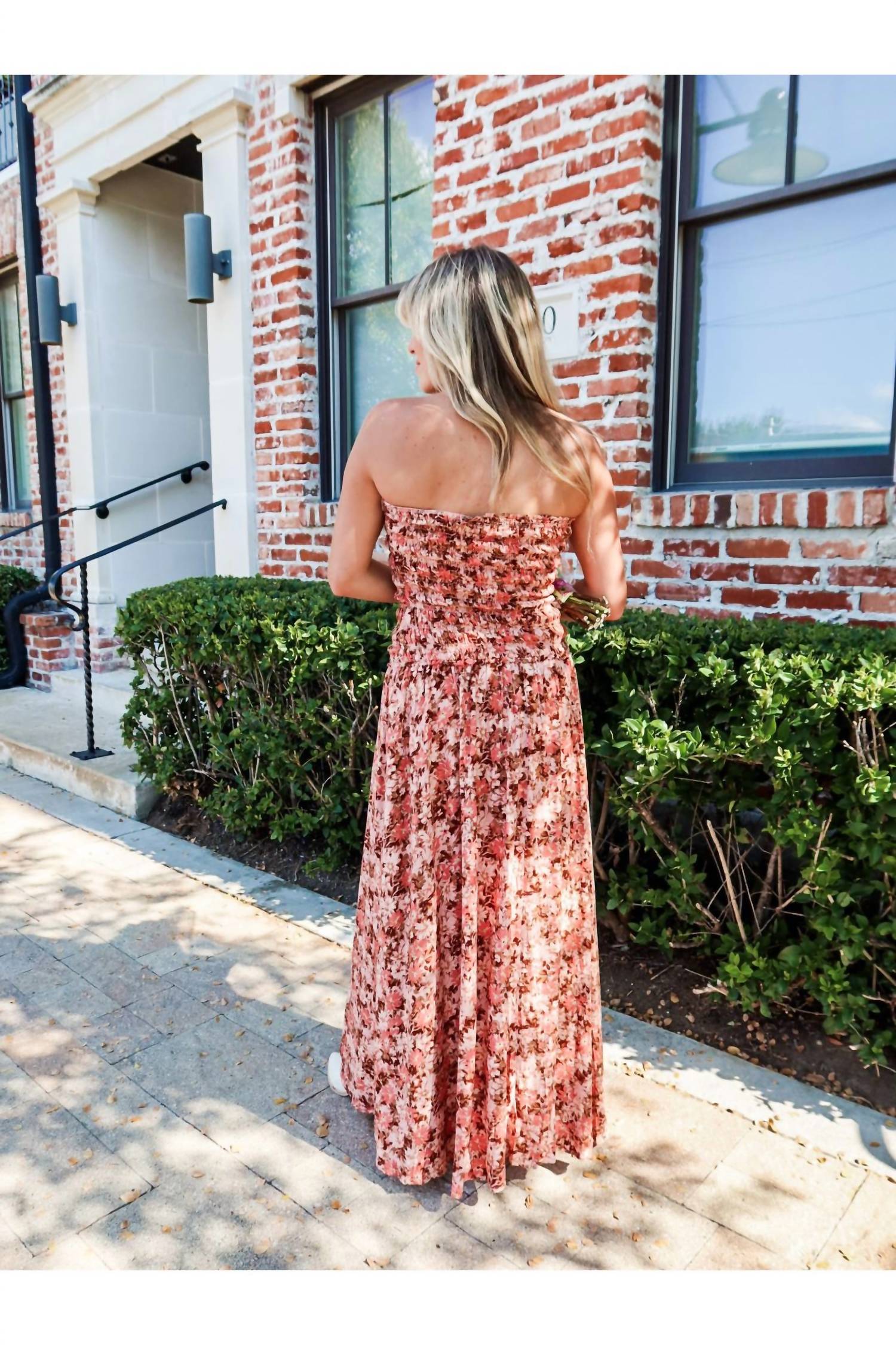 Style this maxi with your favorite statement necklace and sandals for the perfect look. Introducing the Sunset Sonata Maxi Dress by Sky to Moon, a quintessential piece for your fall wardrobe. This strapless dress, crafted from polyester, features a romantic floral print in warm shades of dark coral, soft pinks, and earthy browns. Designed for ease with a pull-on closure, the fitted bodice seamlessly flows into a tiered ruffle skirt, highlighting the A-line silhouette. Care is simple with hand wash cold and lay flat to dry instructions. The dress fits snugly through the bust with sizes ranging from Small (22" bust, 51.5" length) to Large (25" bust, 55.5" length). The model is 5'4" and wearing a size small. 95% Polyester, 5% Spandex