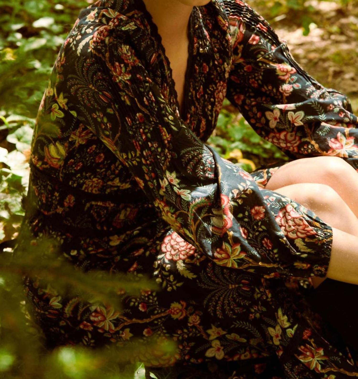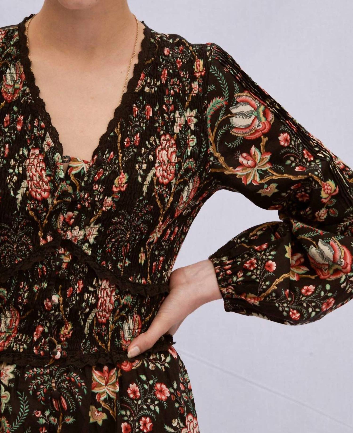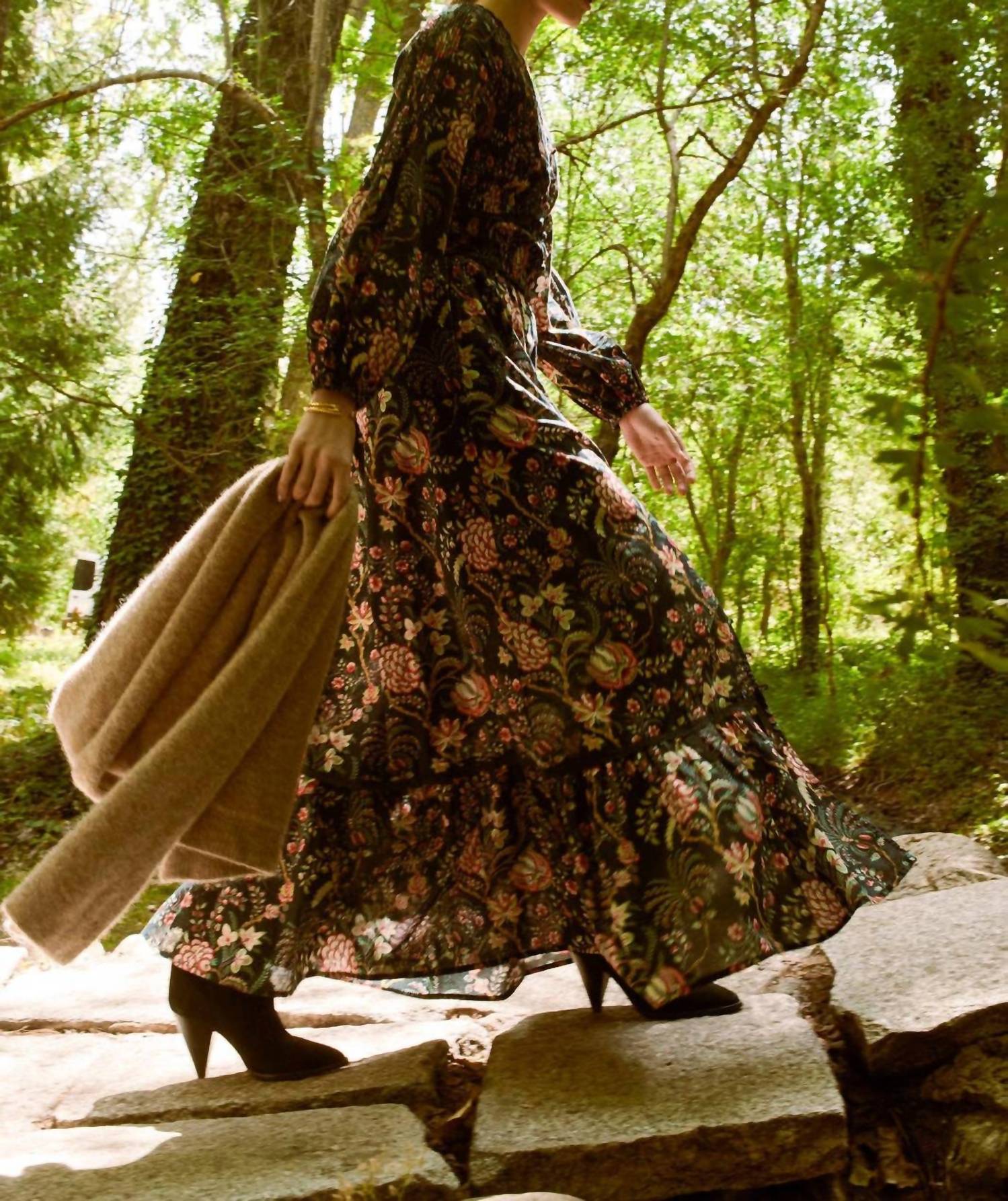 Who doesn't love a good maxi dress? This one you'll be reaching for season after season. Introducing the Women's Valery Dress by Sonmer, designed in a vibrant Brown Multi floral pattern for a touch of effortless charm. This dress features three-quarter sleeves and is crafted from soft, organic cotton, ideal for vacation occasions during the spring season. It boasts a flattering V-neckline with a fitted smocked bodice and a voluminous A-line silhouette, complete with a playful ruffle hem.