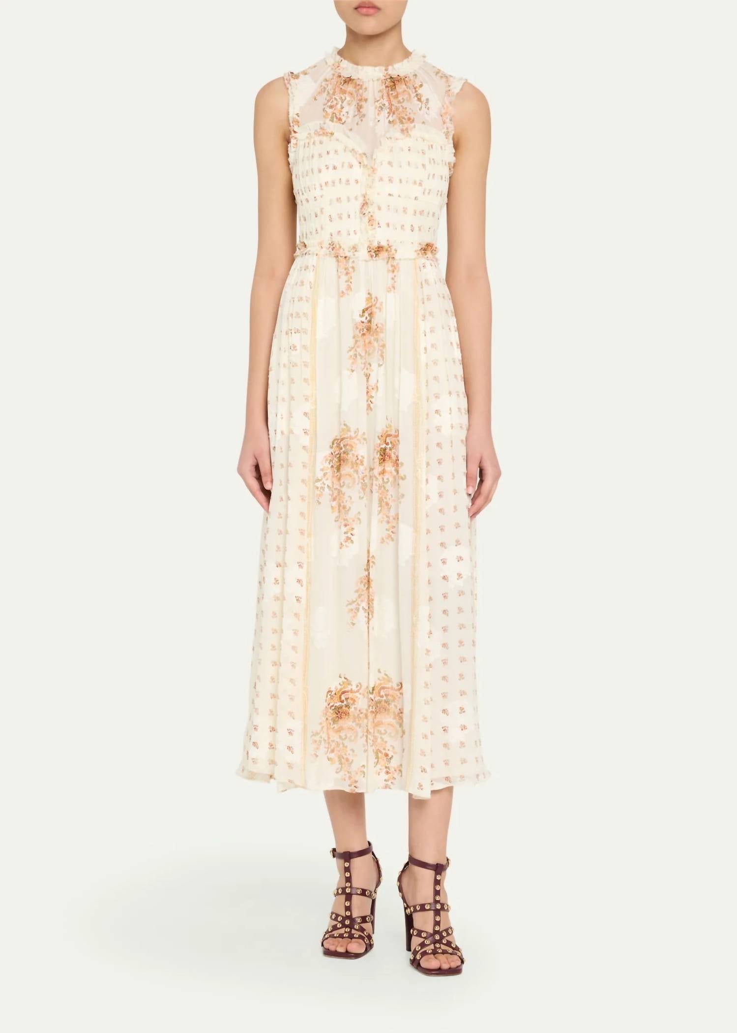 A midi dress so versatile, your options for wearing it are endless. The Ulla Johnson Kasia Sleeveless Midi Dress in Alabaster is an exquisite option for your next Thanksgiving holiday party. Crafted from a luxurious silk blend, this dress showcases a romantic floral pattern with a boho chic vibe. It features a classic crewneck and a flattering shift silhouette, offering a sophisticated and effortless style. With a convenient zip closure, this dress is designed for ease and elegance, though specific care instructions are not provided.