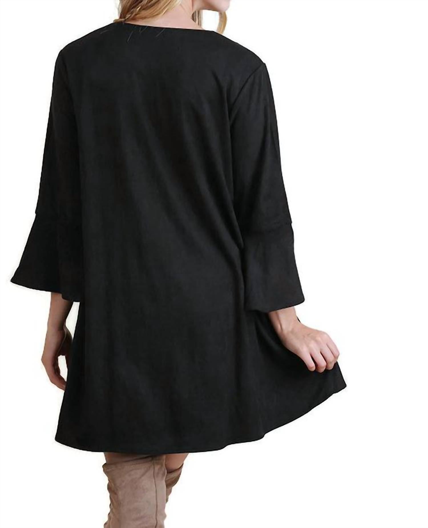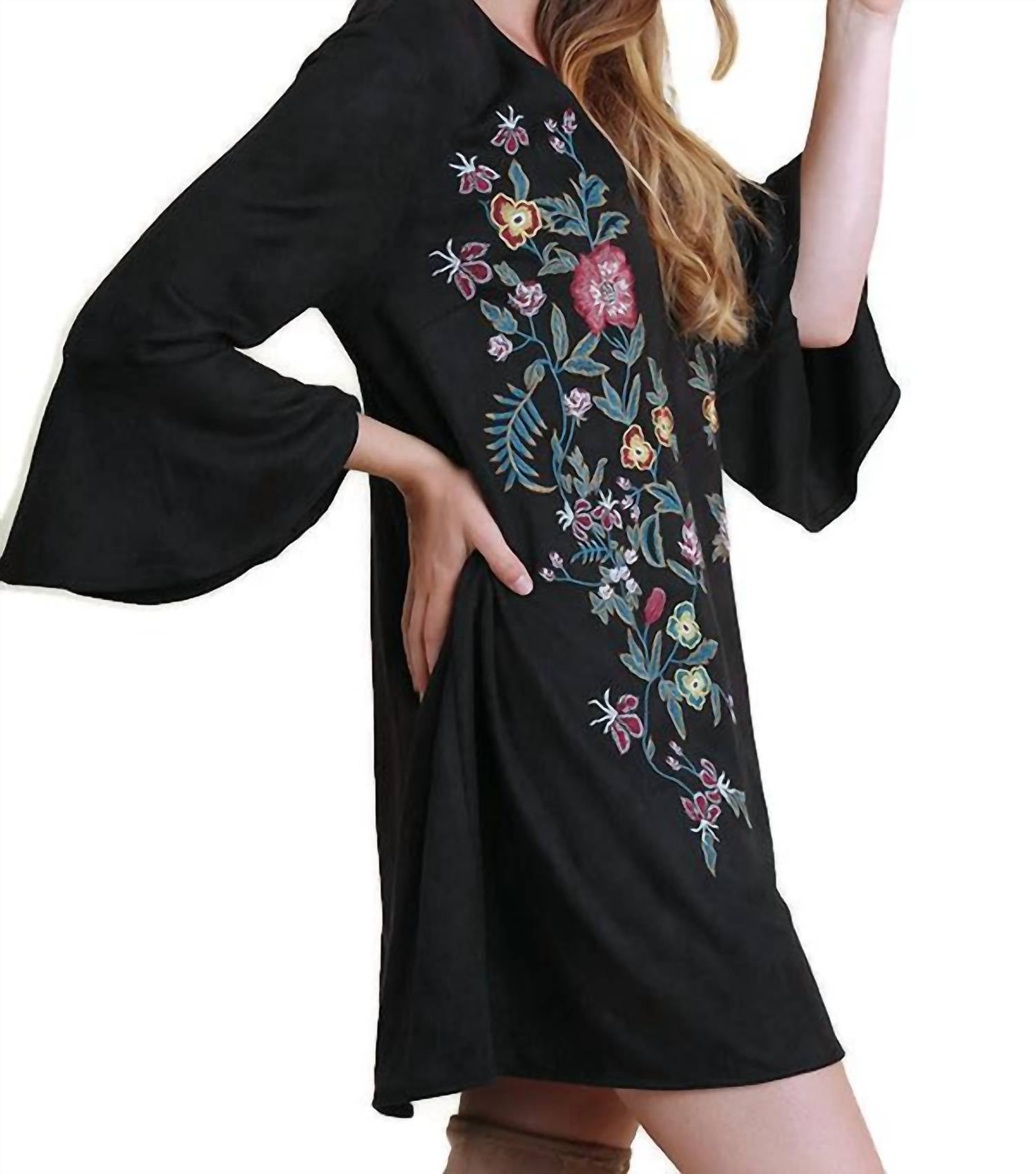 A short and breezy dress for those warmer days. Introducing the Umgee Floral Embroidered Bell Sleeve Dress, an enchanting piece in classic black perfect for a boho-chic summer look. This dress showcases three-quarter bell sleeves and an intricate floral pattern, crafted from a comfortable cotton blend with a suede-like texture for a medium-weight feel. The A-line mini silhouette measures 32 inches in length and features a v-neckline for a flattering fit. Closure: Pull-on style. Care: Hand wash cold or dry clean. Available sizes include Small (Bust 40", Length 32"), Medium (Bust 42", Length 32"), and Large (Bust 44", Length 33").