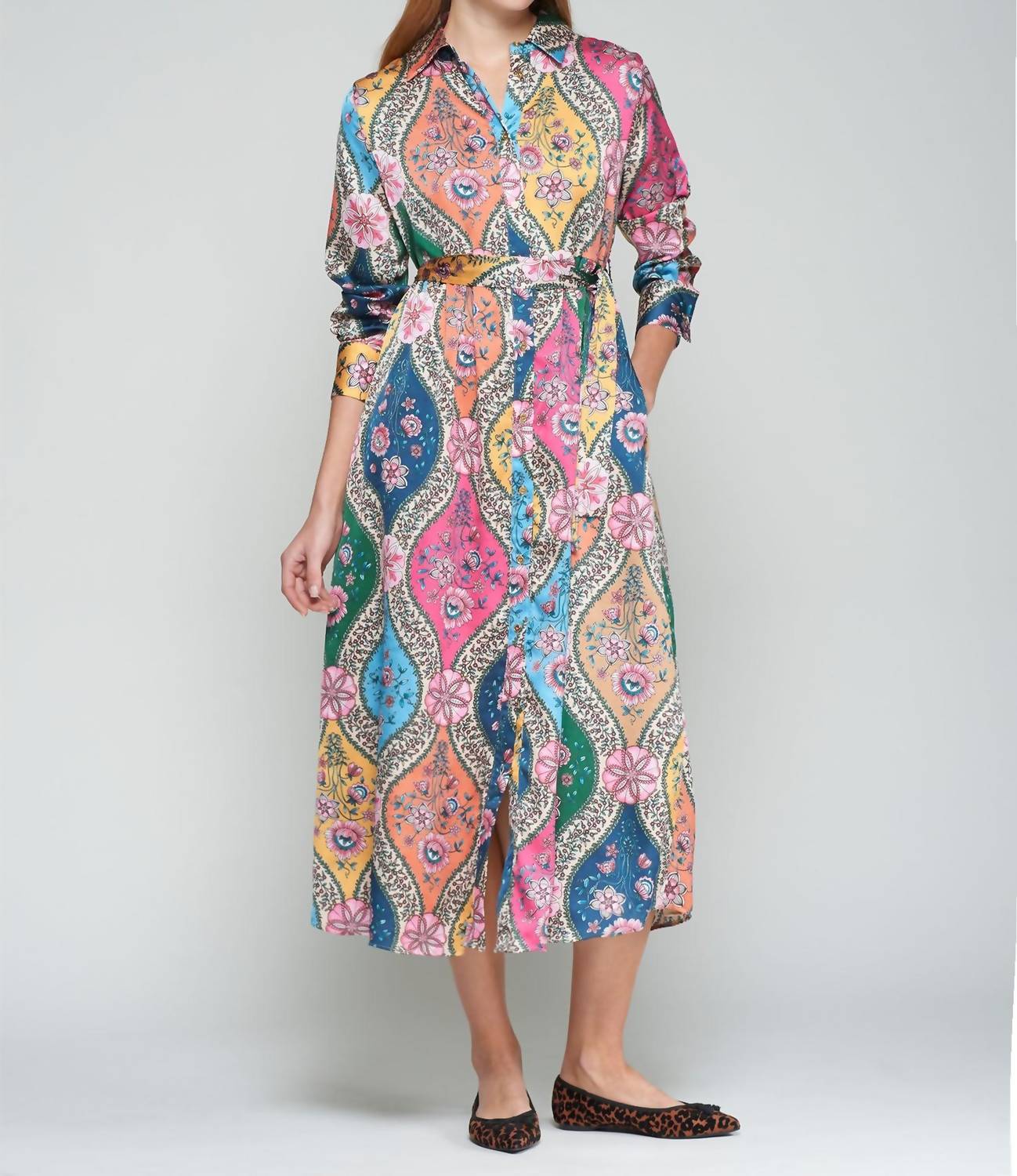 Just add slides or mules and you are good to go. Introducing the Floral Midi Dress by Vilagallo, a vibrant addition to your spring wardrobe. Featuring long sleeves and an A-line silhouette, this multi-color dress offers a boho-chic flair with a floral pattern and collar neckline. Made from 100% polyester, it includes practical pockets and a button closure for easy wear. Care for this standout piece with a machine wash for effortless maintenance.