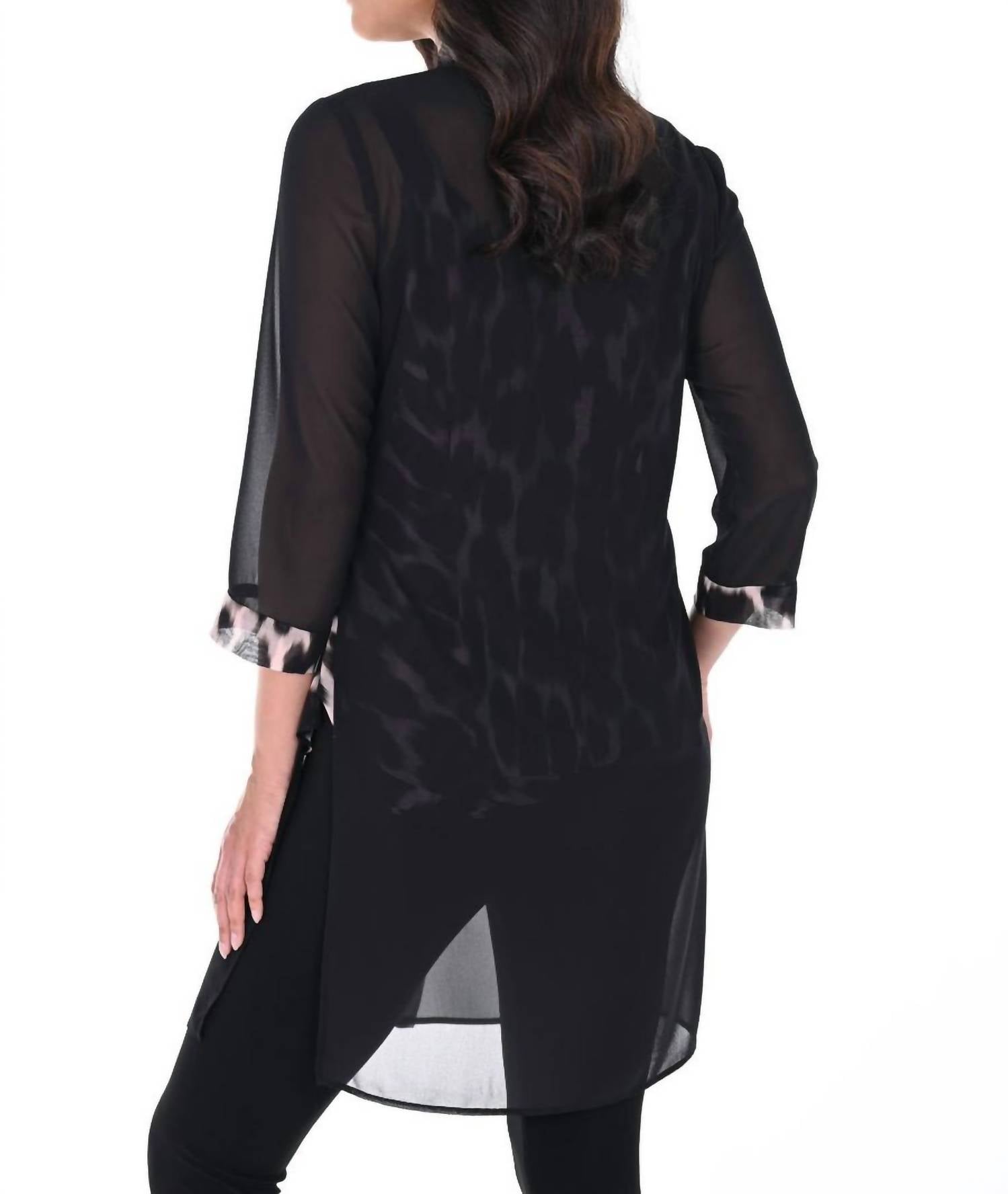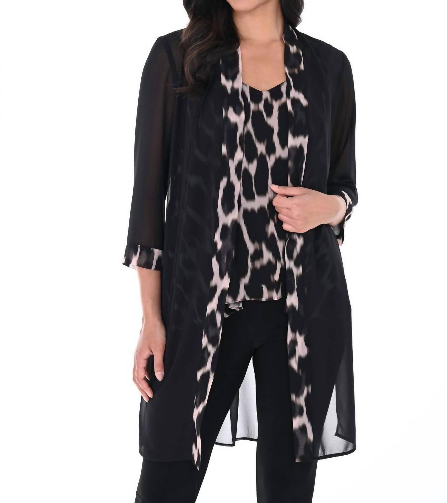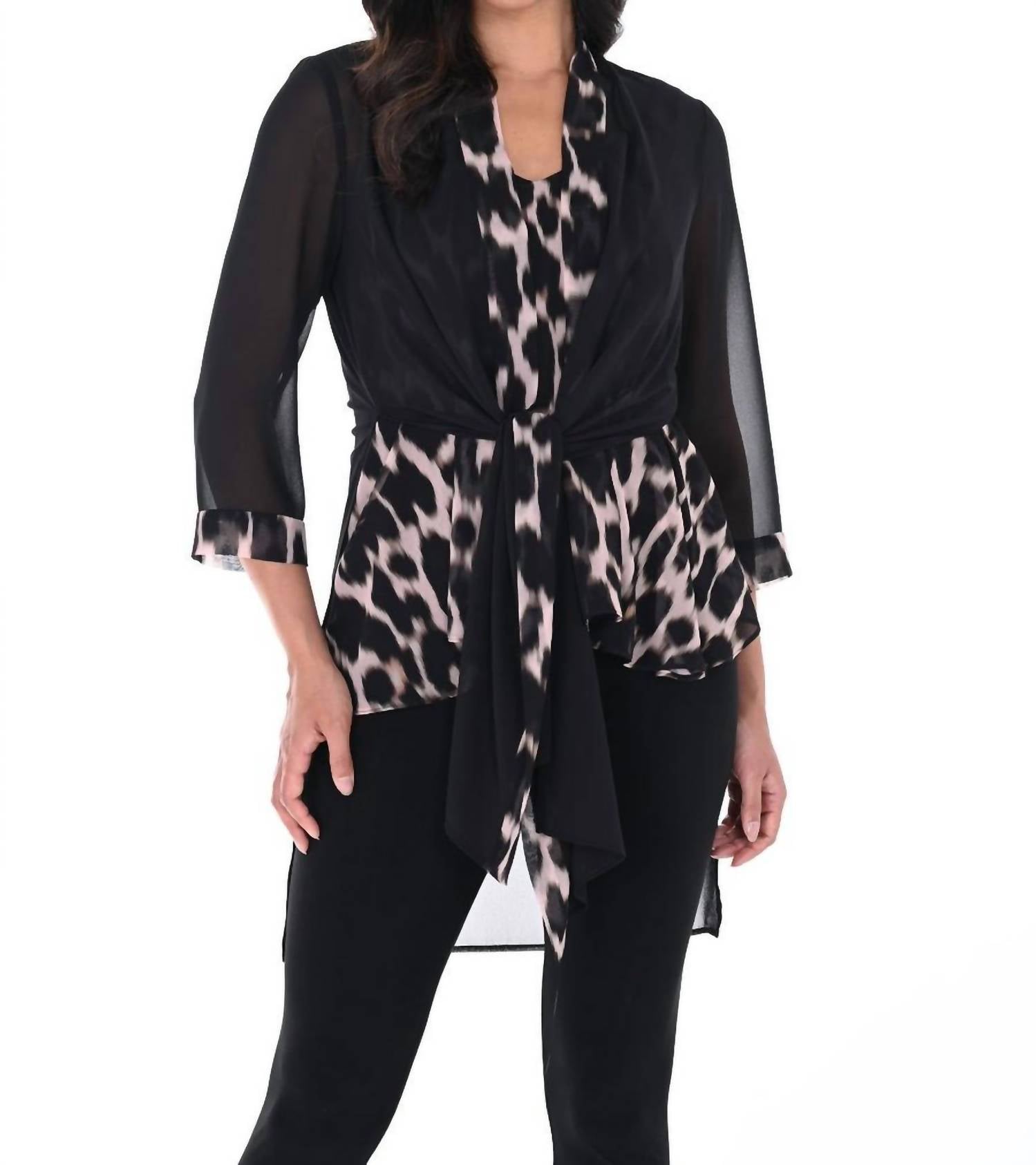 Throw this adorable cardigan over any cami or tank top. Introducing the Woven Cover Up by Frank Lyman, a stunning cardigan in an elegant mix of black and blush with an eye-catching animal print trim. This sophisticated piece is designed for the fashion-forward woman who loves to make a statement. Material: 100% Polyester. Care: Hand wash and line dry.