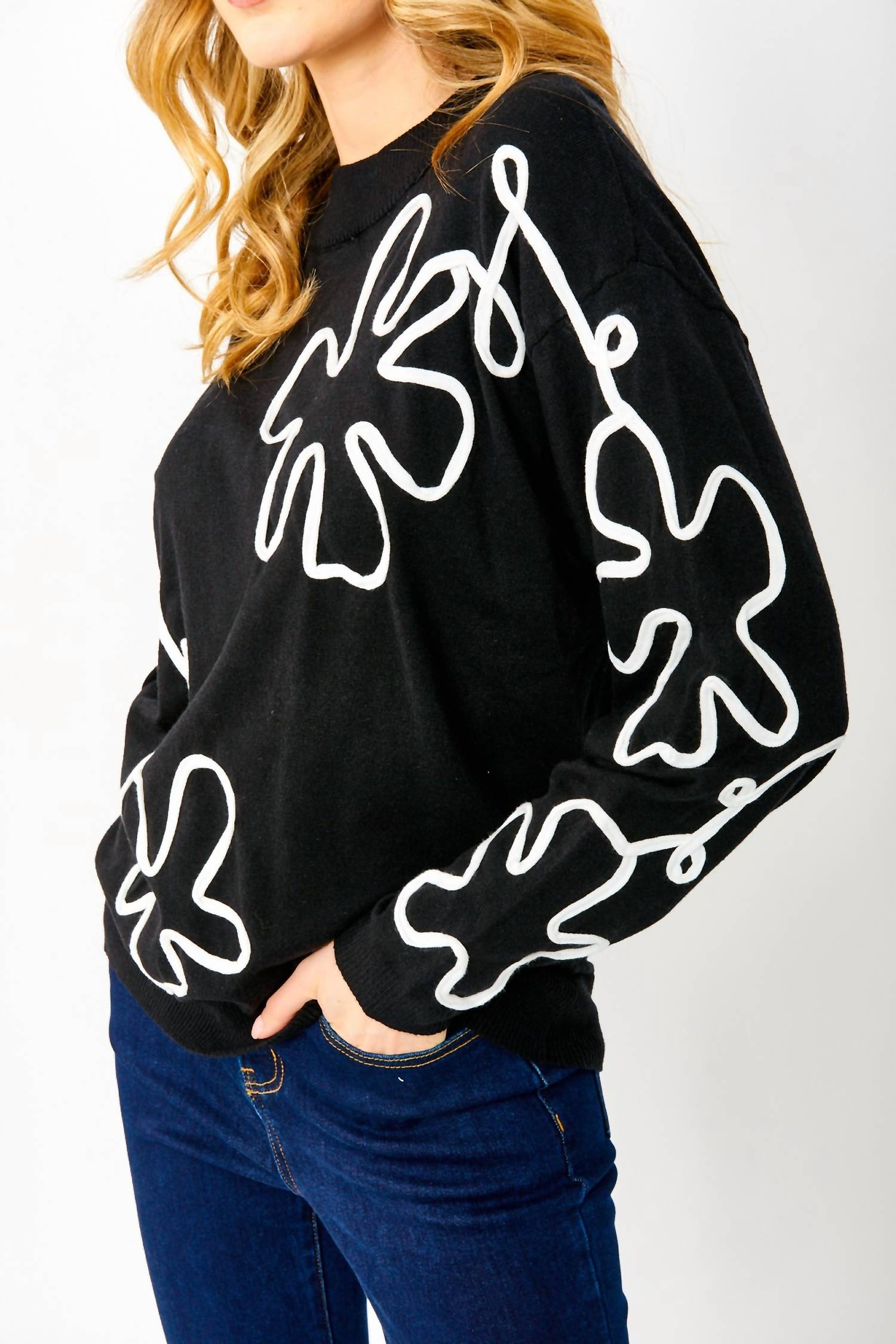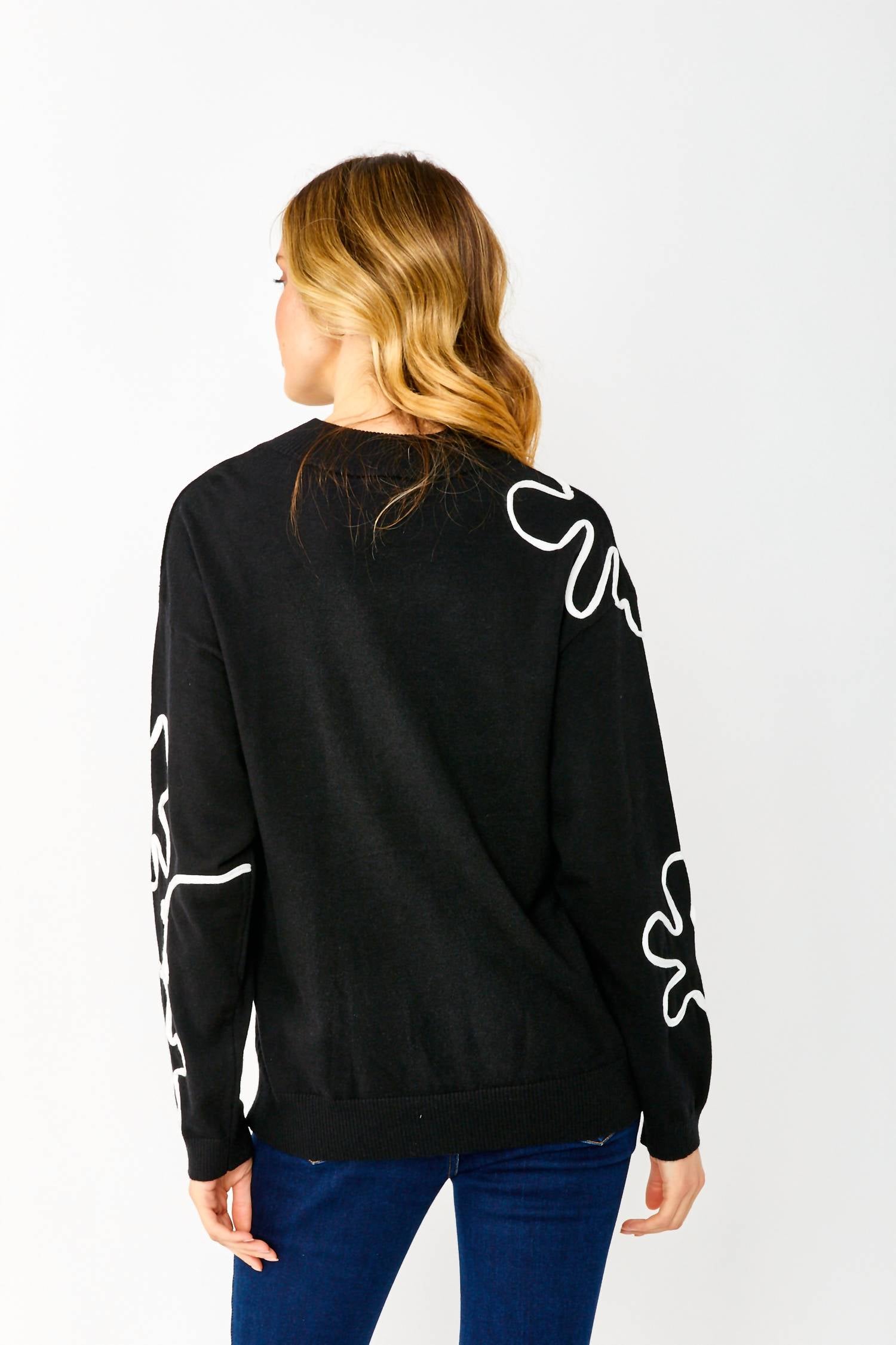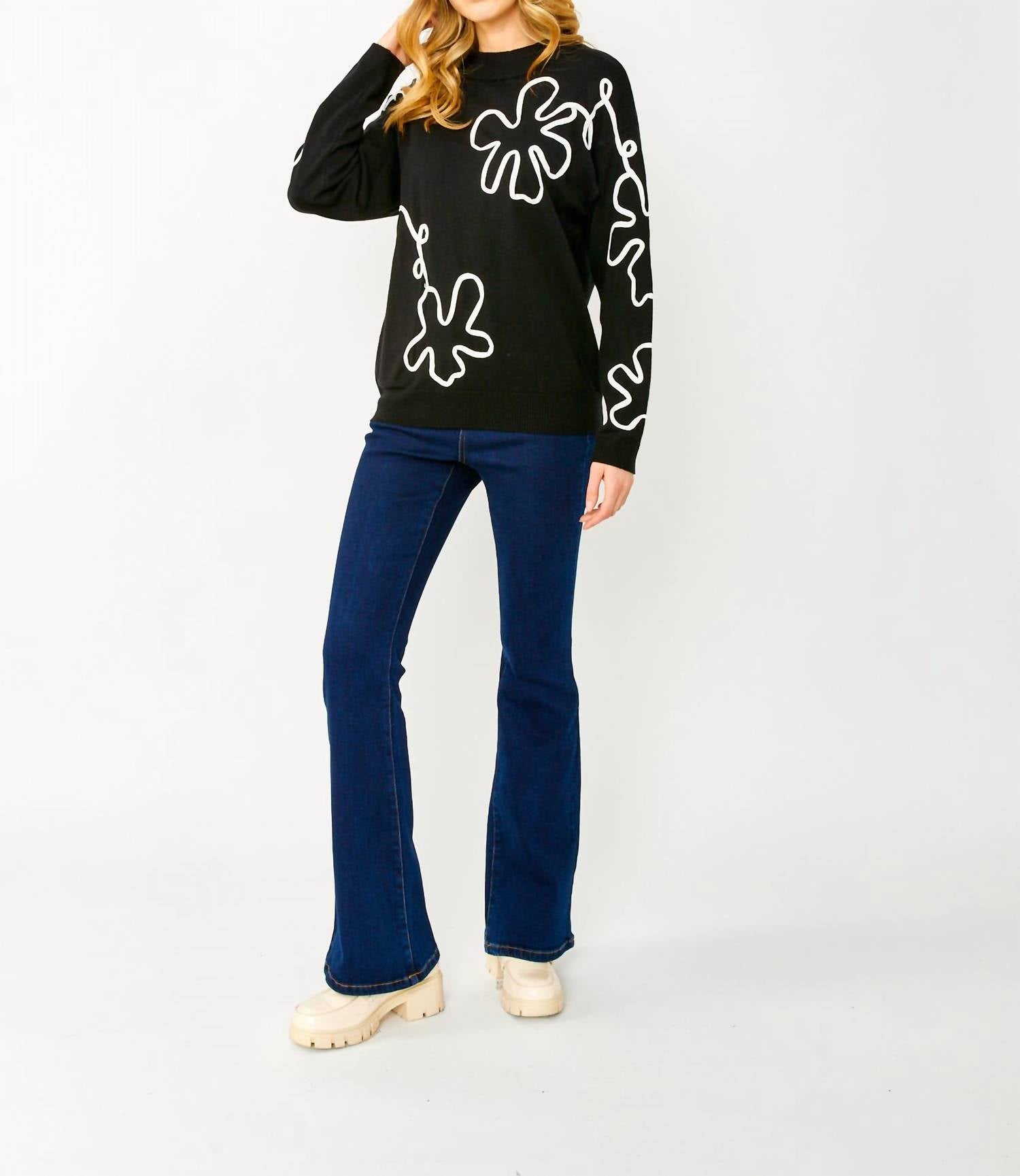 Stay warm and stylish in this versatile and effortlessly cool knitwear staple. Wear it alone or layered, it's the perfect sweater for the season and you'll wish you had it in every color. Elevate your fashion collection with the Abstract Knit Sweater by Frank Lyman, featuring an artistic white abstract design on a timeless black backdrop. This piece is crafted with long sleeves and a crew neckline, making it adaptable for any occasion. The sweater is constructed from a blend of 51% rayon, 28% polyester, and 21% nylon, ensuring a comfortable and durable fit. Closure: Pull on. Care: Hand wash and lay flat to dry. Approximate length for size 12 is 27" (69 cm).