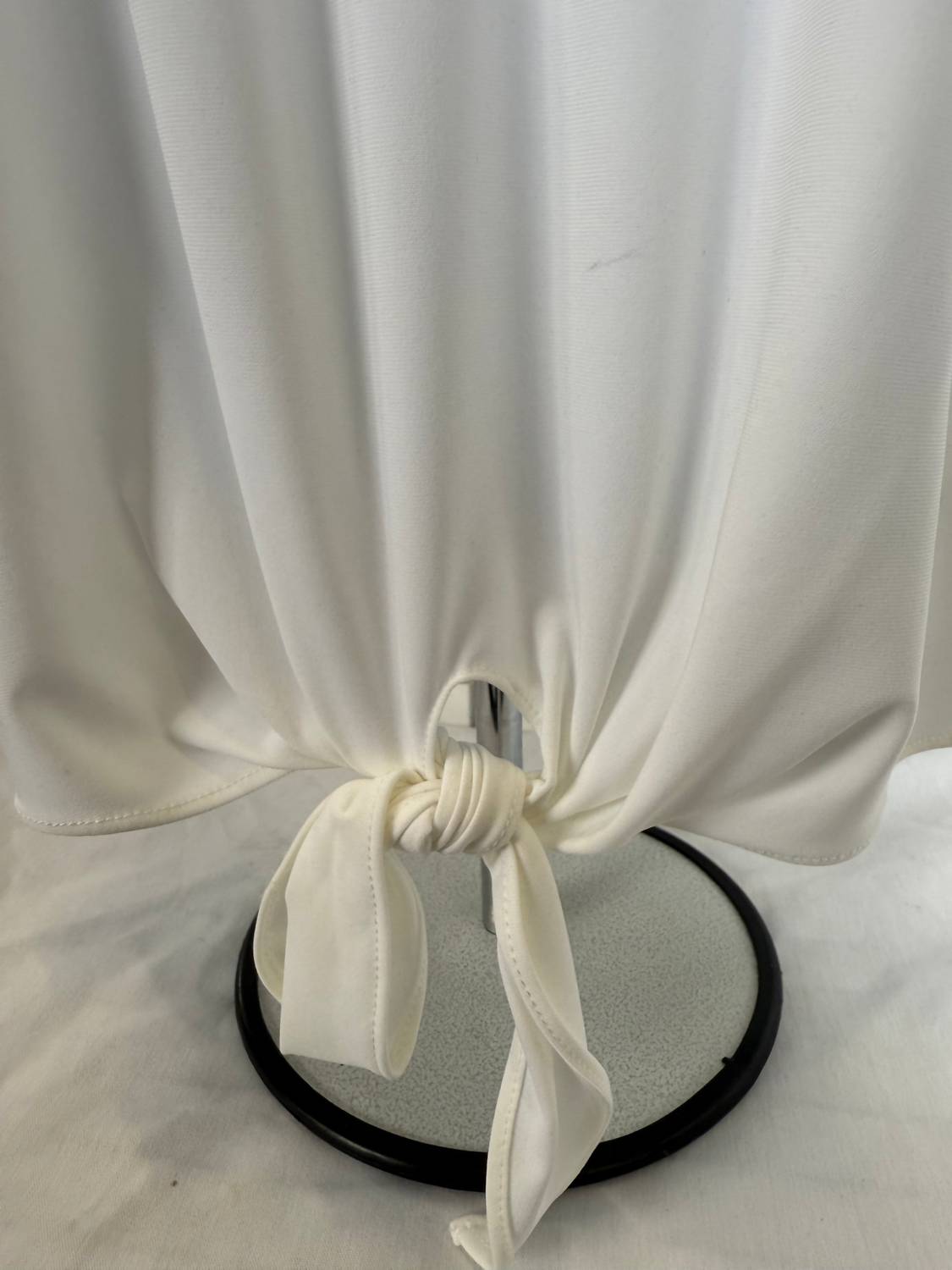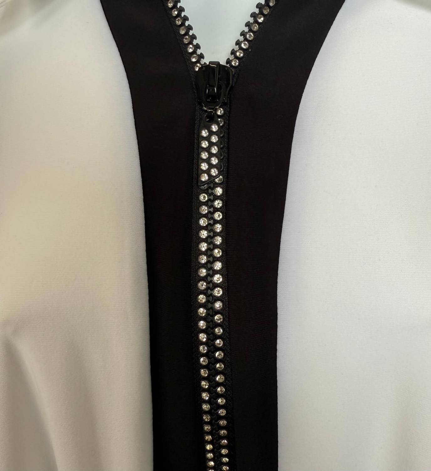 This classic, short sleeve tee will be your go-to staple this season and beyond. Elevate your wardrobe with the Frank Lyman Short-sleeved Top, a chic addition for any occasion. Crafted in a solid white hue, this piece features short sleeves and boasts rhinestone detailing complemented by a stylish black zip closure. The design is finished with a knot tie at the waist for added flair.