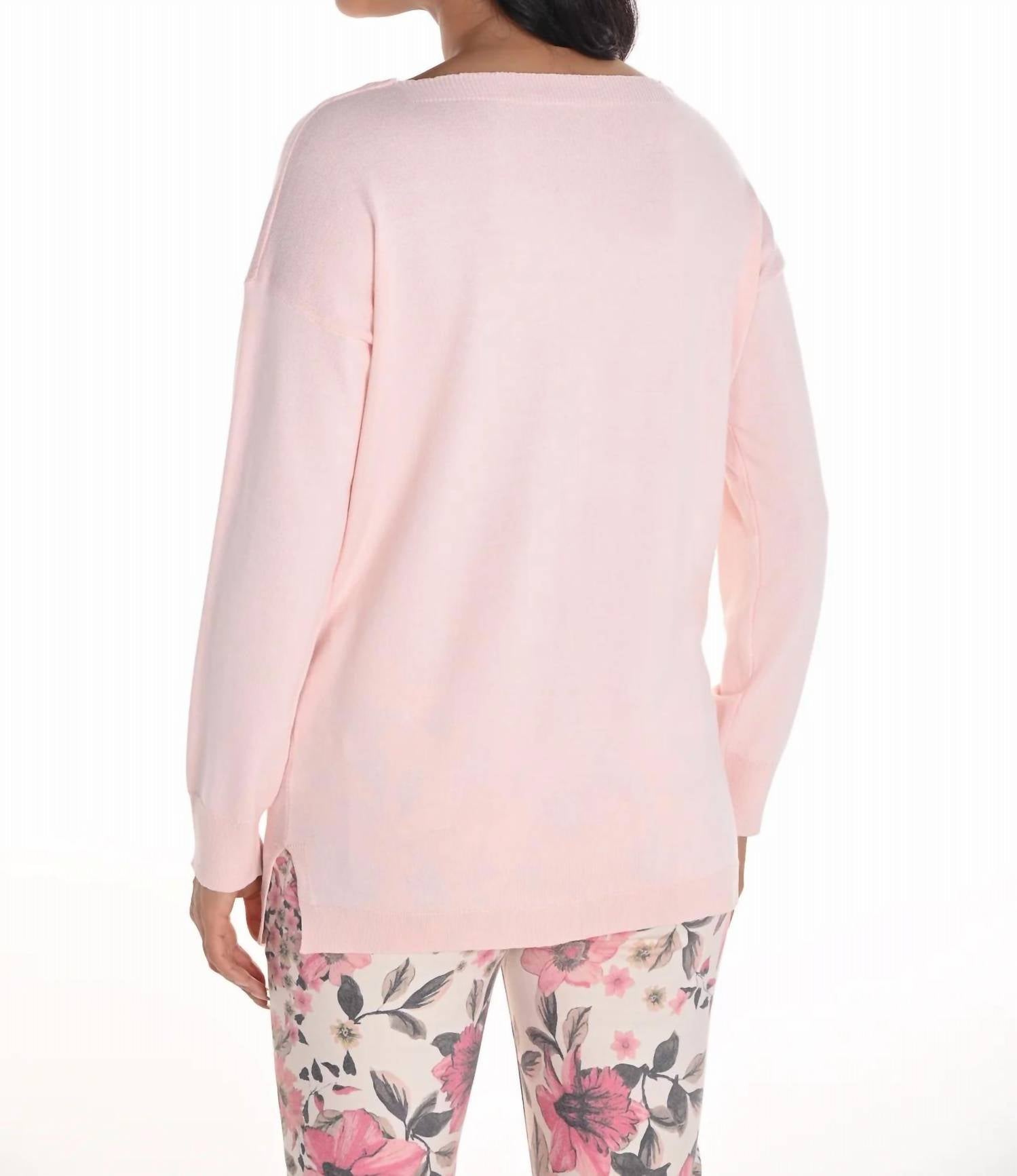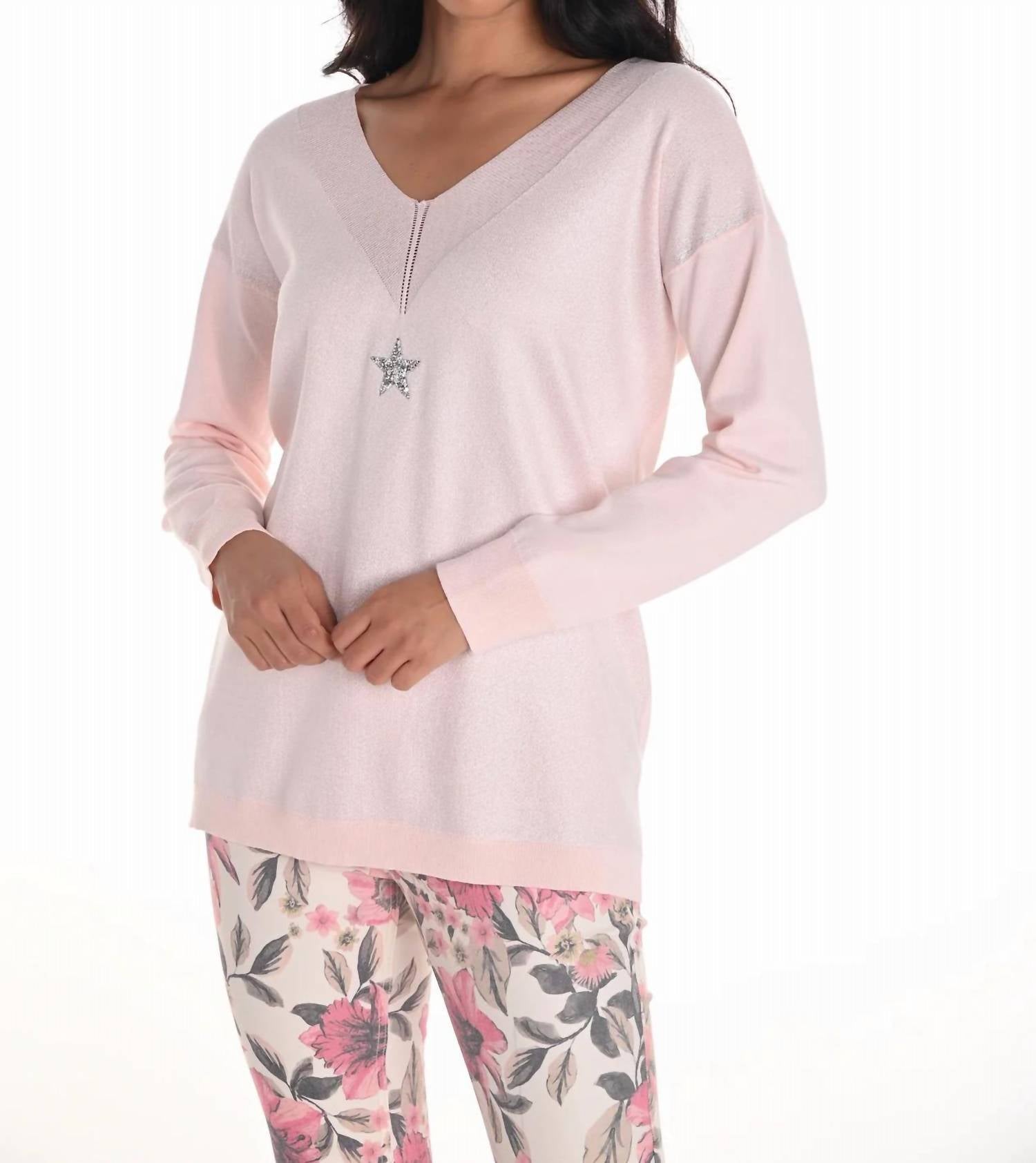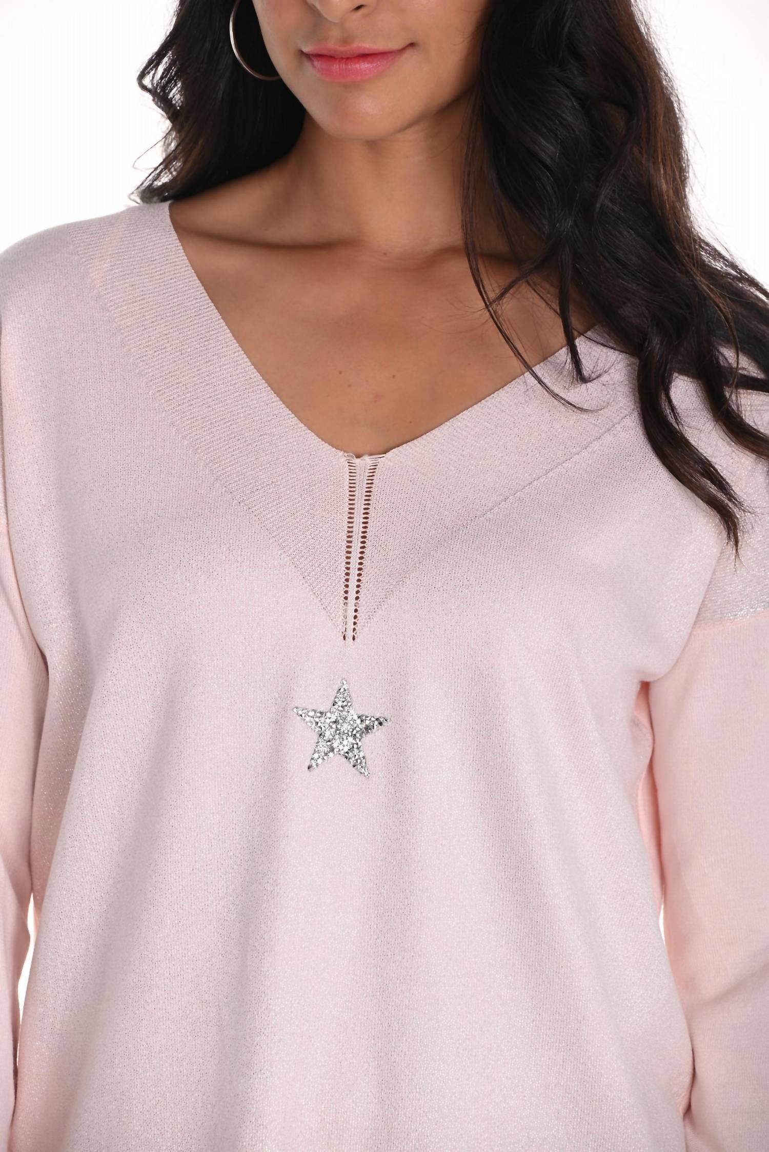 A timeless v-neck sweater that works season after season. Introducing the Frank Lyman Embellished Knit Top in a delicate blush hue, designed for the modern woman with a minimalist style. This v-neck top features long sleeves and is crafted from a blend of 69% Rayon and 31% Polyester, ensuring comfort and elegance. The hip-length design is distinguished by jewel and star embellishments at the neckline, perfect for both casual outings and evening events. Closure is pull-on, and care involves hand washing and laying flat to dry. Approximate length for size 12 is 25" or 64 cm.