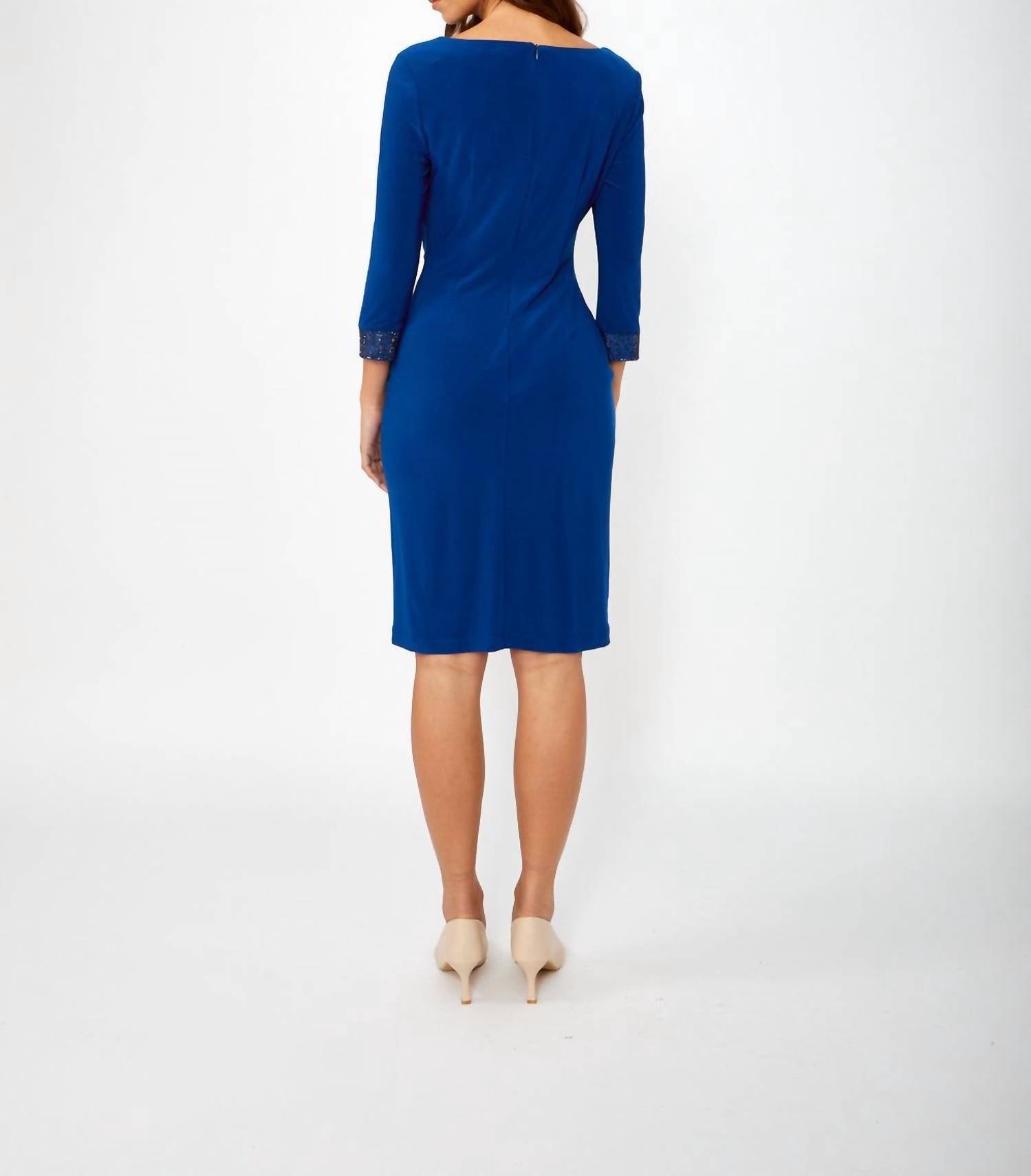 The kind of easy and flattering dress you'll be reaching for all season long. Discover the timeless elegance of the Sheath Knee-length Dress in Night Blue by Frank Lyman, perfect for any fall wedding or formal occasion. This sophisticated garment features three-quarter sleeves and a flattering boat-neck neckline, enhanced by embellished cuffs for added allure. Crafted from 95% Polyester and 5% Elastane, it offers comfortable stretch and is lined for a smooth fit. With a sleek back zip closure, this dress is designed in Canada and is best cared for by hand washing and laying flat to dry. Garment length: 40 inches.