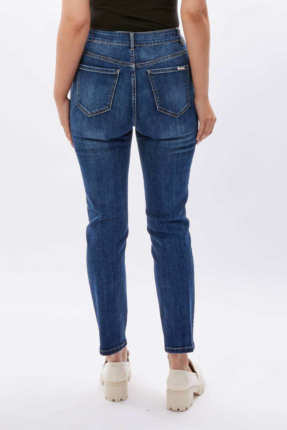 The perfect cropped jean for those transitional seasons. Introducing the High Waisted Ankle Length Jean by Frank Lyman, a delightful blend of style and comfort in a striking dark blue denim. These high-rise trousers offer a slim fit and a straight leg style, with a practical zip closure for functionality. Crafted from a mix of 73% Cotton, 23% Poly, 3% Rayon, and 1% Elastane, they feature convenient side pockets for added utility. With an approximate inseam length of 28" (71 cm), these medium wash jeans should be hand washed and line dried for optimal care.