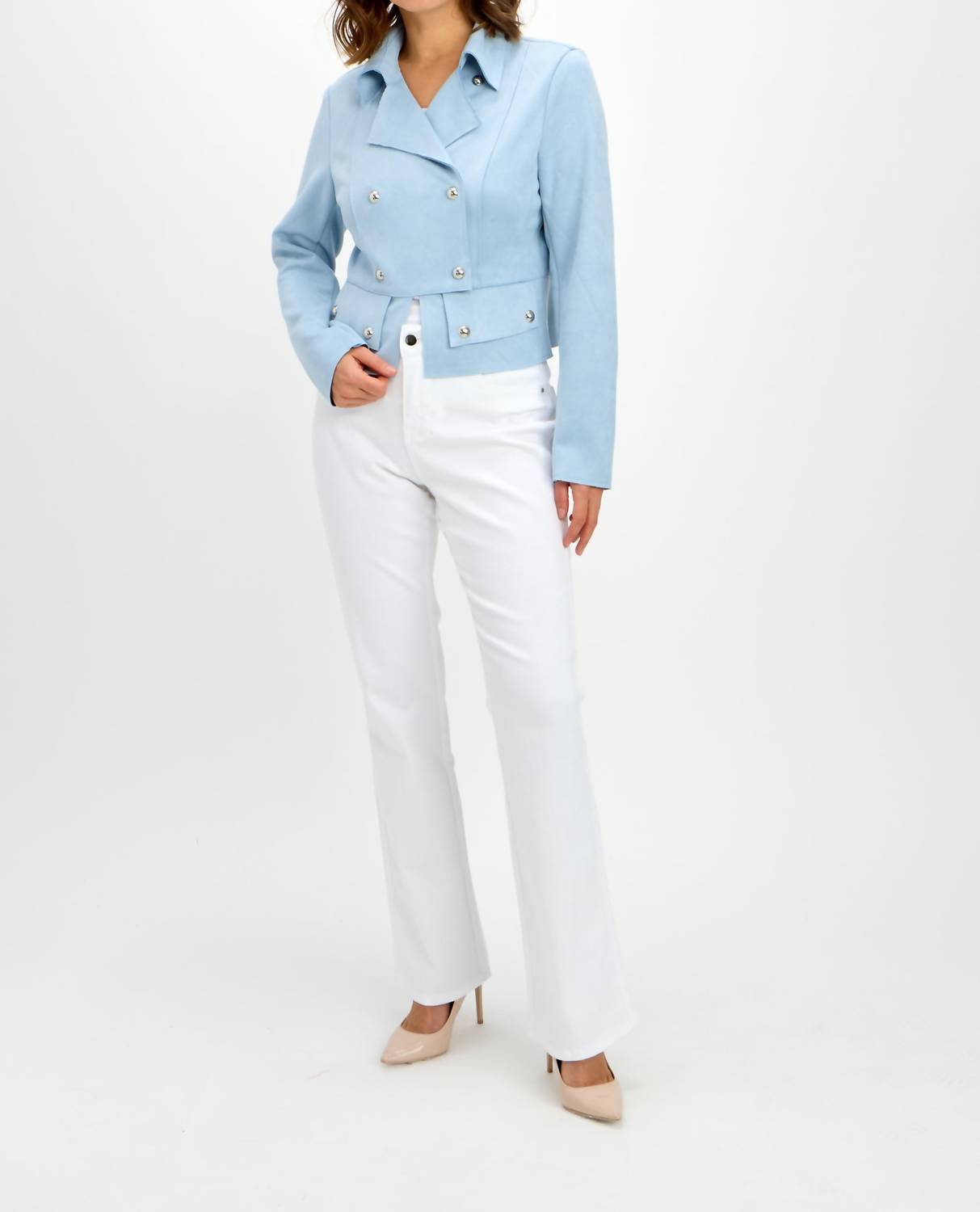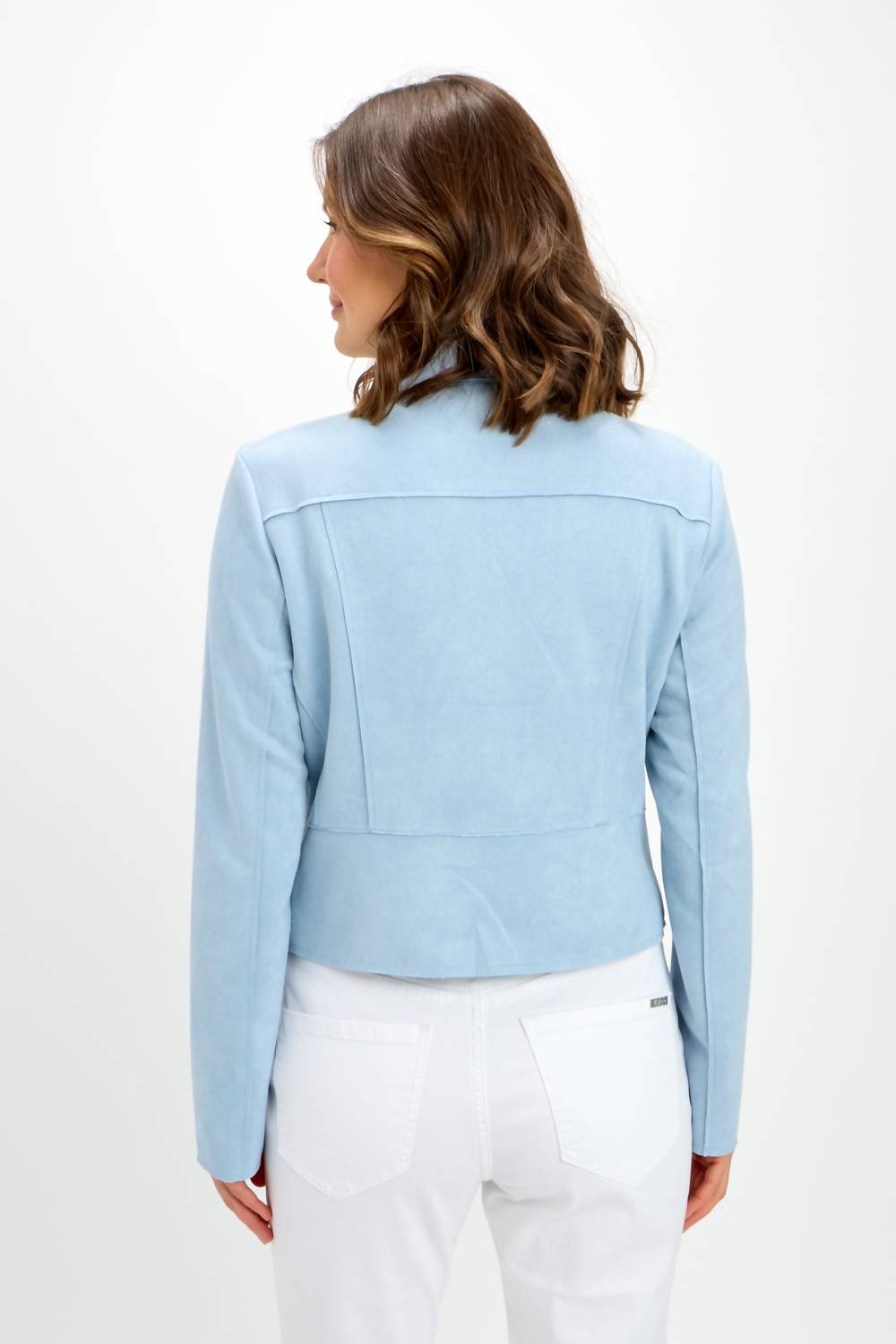 An elevated version of your favorite classic blazer. Elevate your workwear collection with the Frank Lyman Waist-length Knit Jacket in a sophisticated Pale Blue. This long-sleeve jacket is expertly crafted from an 88% polyester and 12% elastane blend, offering a comfortable and flexible fit. Featuring a classic notched lapel and button closure, it is an excellent choice for everyday elegance. With an approximate length of 24 inches, this garment is perfect for fall, and its solid pattern ensures timeless appeal. Care instructions include hand washing and line drying to maintain its pristine condition.
