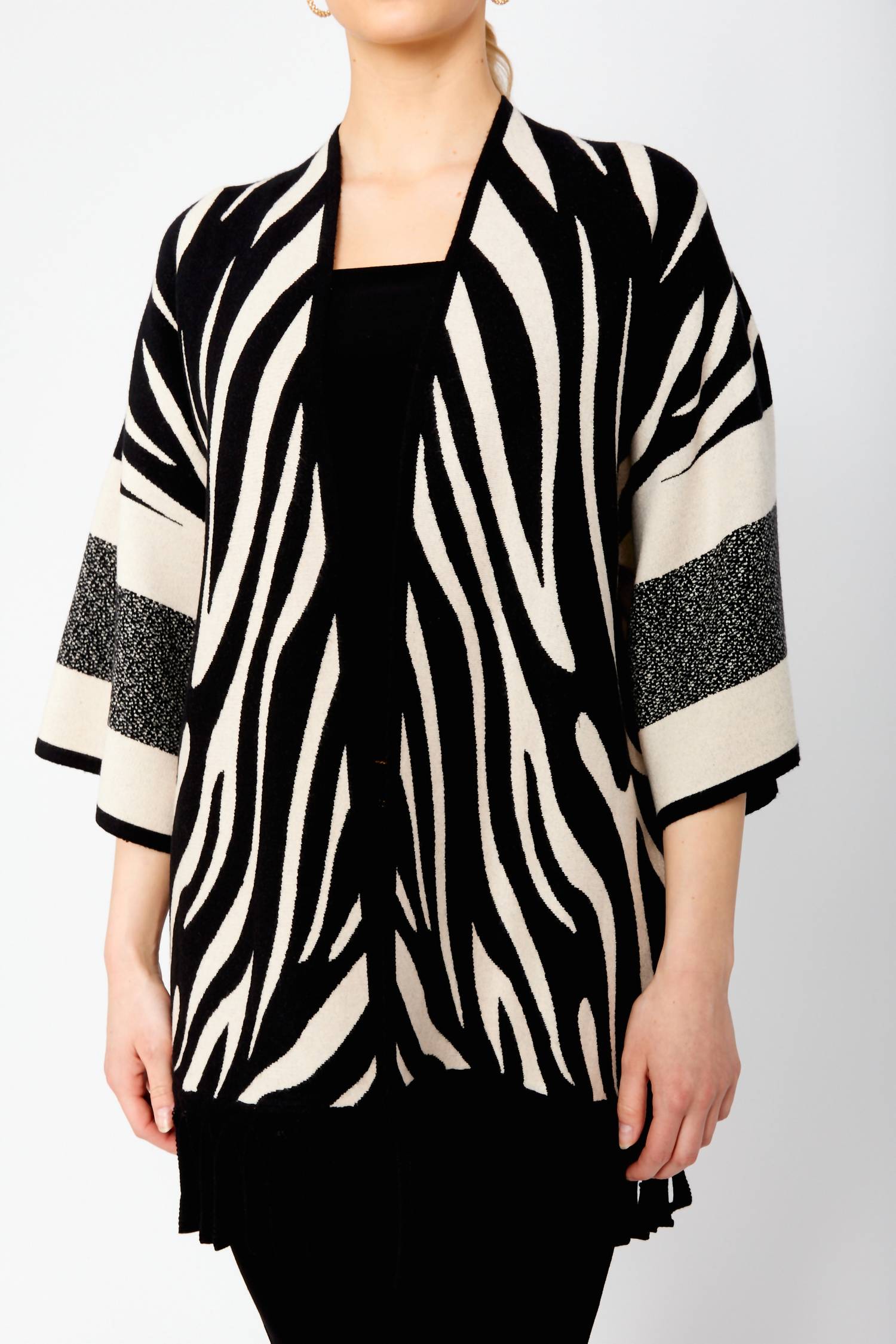 A classic fit that works just as good buttoned as it does left open. Embrace bohemian style with the Knit Throw Over by Frank Lyman, featuring a chic zebra pattern in black and tan. This open-front kimono offers a relaxed fit and long length, approximately 31 inches, with wide three-quarter sleeves and fringe details for added flair. Crafted from a blend of 52% Rayon, 28% Polyester, and 20% Polyamide, it offers a balance of comfort and elegance. Designed with a pull-on closure, it is easy to care for by hand washing and laying flat to dry.
