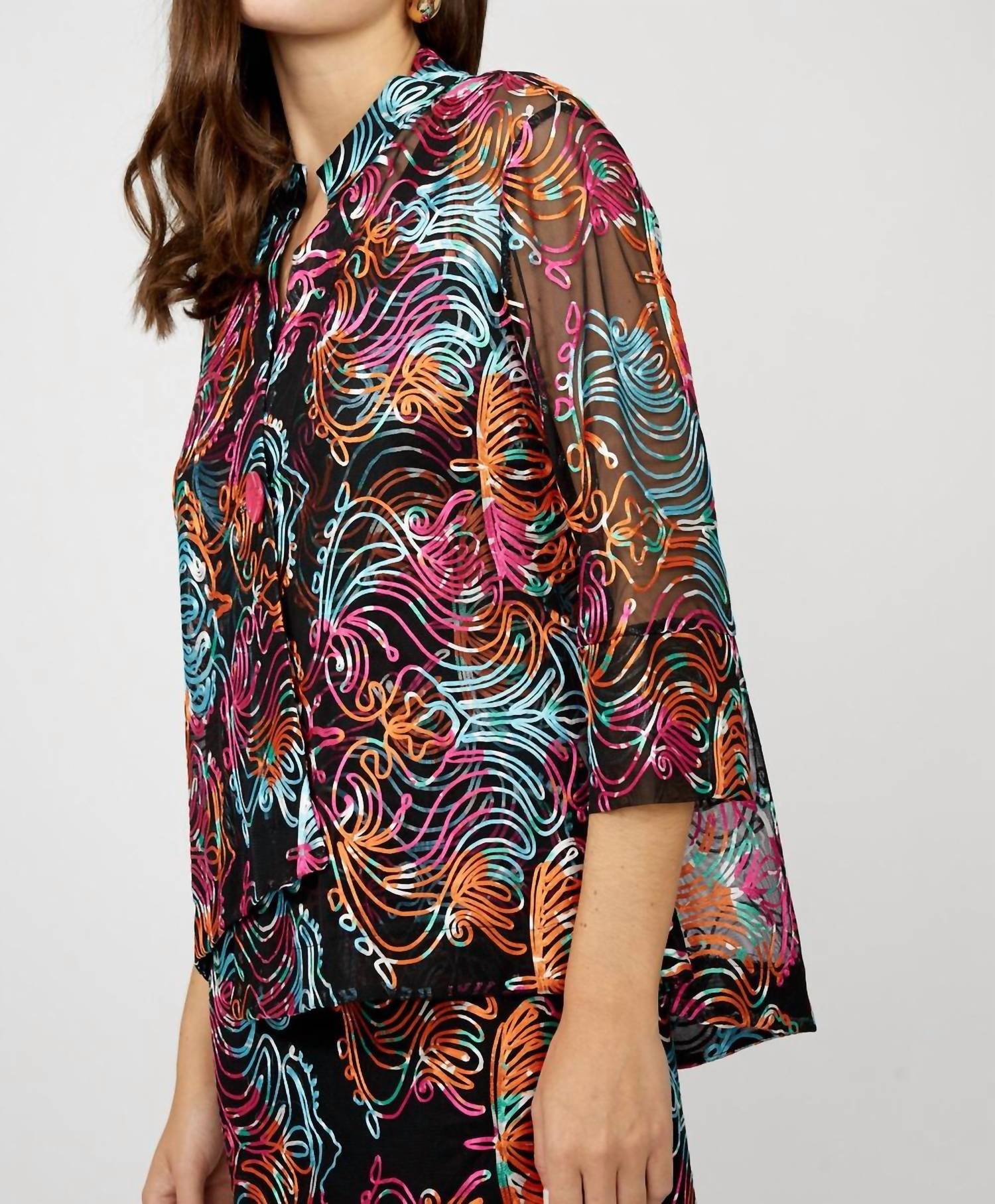 A jacket so versatile you can literally wear it with anything. Discover the Floral Embroidered Hip-length Jacket by Frank Lyman, an exquisite blend of art and elegance with its multi-colored abstract embroidery design on a lightweight black mesh base. This jacket features three-quarter length sleeves, offering a flattering flared silhouette with an asymmetric hemline. Crafted from 100% polyester, it boasts a unique stand-up collar with a notch neckline, and a single button front closure, making it a striking addition to any wardrobe. For added care, hand wash and lay flat to dry to maintain its intricate detail. Total length: 22'' at the shortest point, extending to 27'' at the longest point.