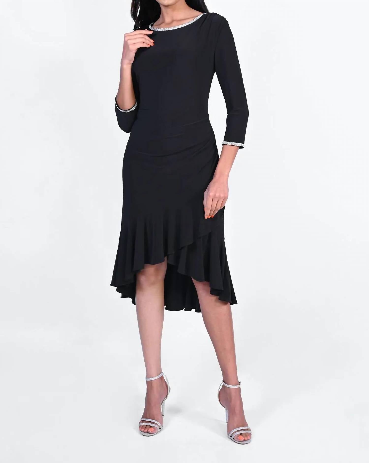 A cool twist on a classic style dress. Introducing the Layered Frill Hem Knit Sparkle Dress by Frank Lyman, a stunning choice for evening events. This black asymmetrical dress features three-quarter sleeves and a round neckline with embellishments on the neckline and cuffs. The dress is crafted with 95% polyester and 5% elastane, with a comfortable 100% polyester lining. Designed with a ruched detail across the tummy and an A-line silhouette, it promises a flattering fit for any occasion.