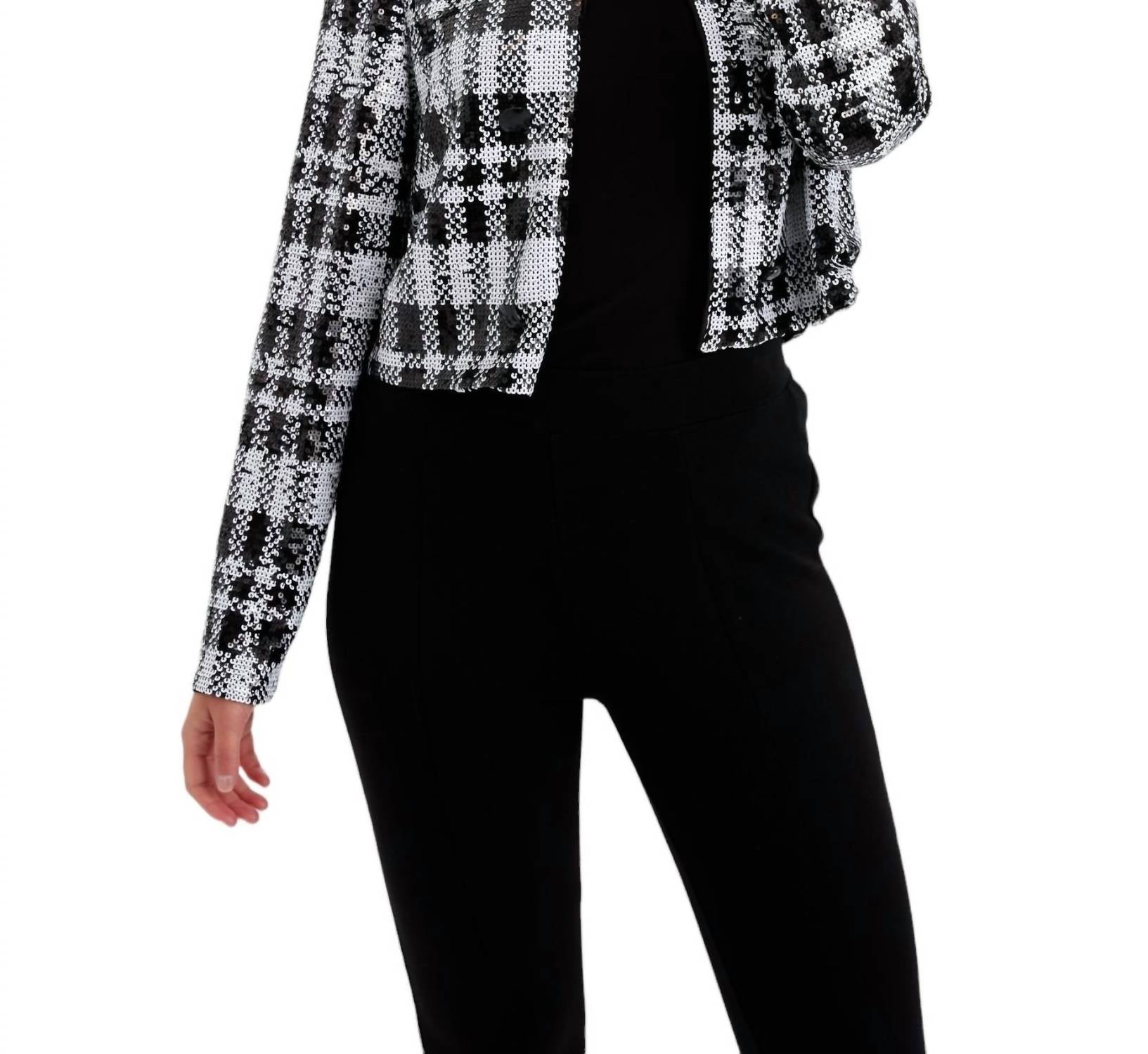 Features a classic silhouette with a tailored fit that enhances the figure. Crafted from 100% polyester, recommended to hand wash cold. The model, standing at 5'9" (175 cm) tall, wears a size 6, showcasing its flattering fit. The approximate length of the jacket in size 12 is 26 inches (66 cm).