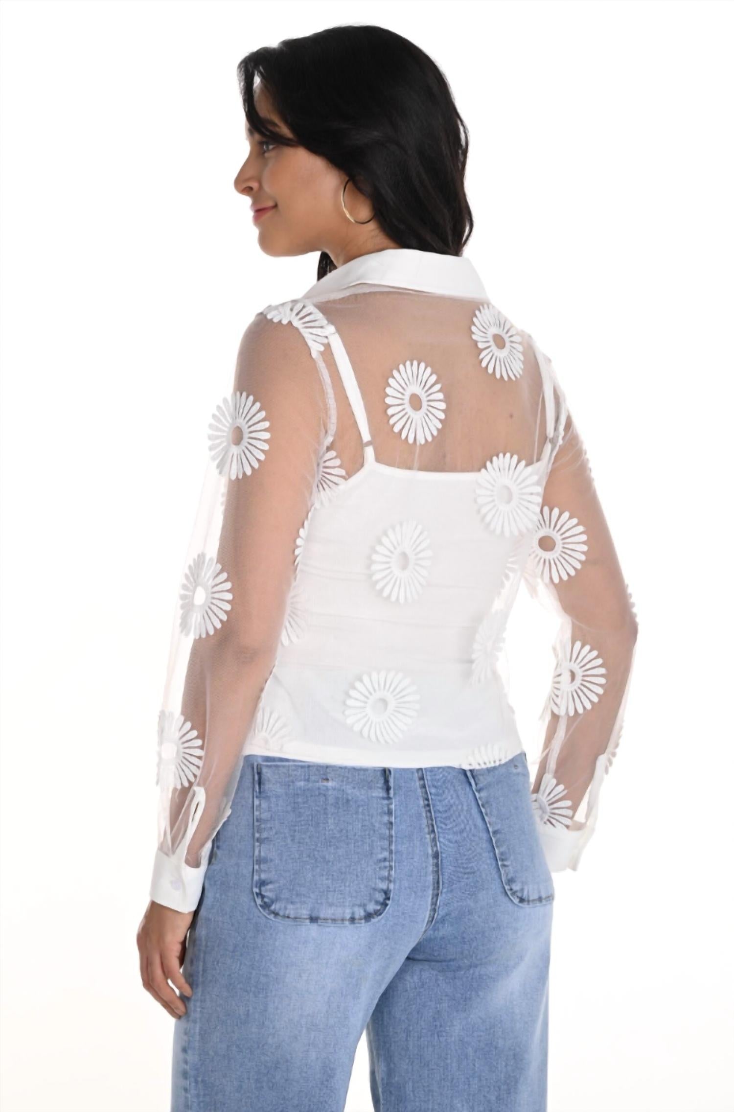 A versatile blouse that works from desk to dinner! This elegant white button-up blouse redefines modern femininity with its sheer, embroidered floral sleeves. The classic collared design is paired with a semi-sheer bodice featuring delicate daisy appliqués for a fresh, romantic look. Crafted from lightweight mesh fabric, the voluminous sleeves add a touch of drama, while the crisp white cuffs and button placket keep it polished. Perfect for both casual and dressy occasions, pair this blouse with denim for a chic daytime ensemble or tailored trousers for a sophisticated evening outfit.