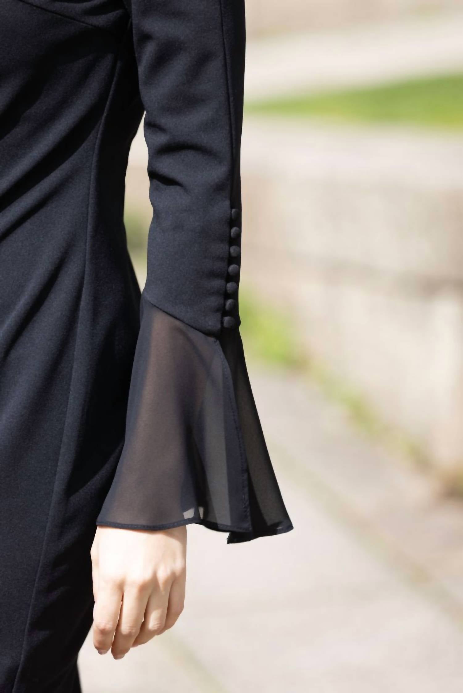 This elegant black dress boasts a boat neckline, long sleeves with added chiffon and adorned with intricate button detailing, adding a touch of sophistication to its timeless design. Its graceful silhouette effortlessly combines modern style with classic charm.
