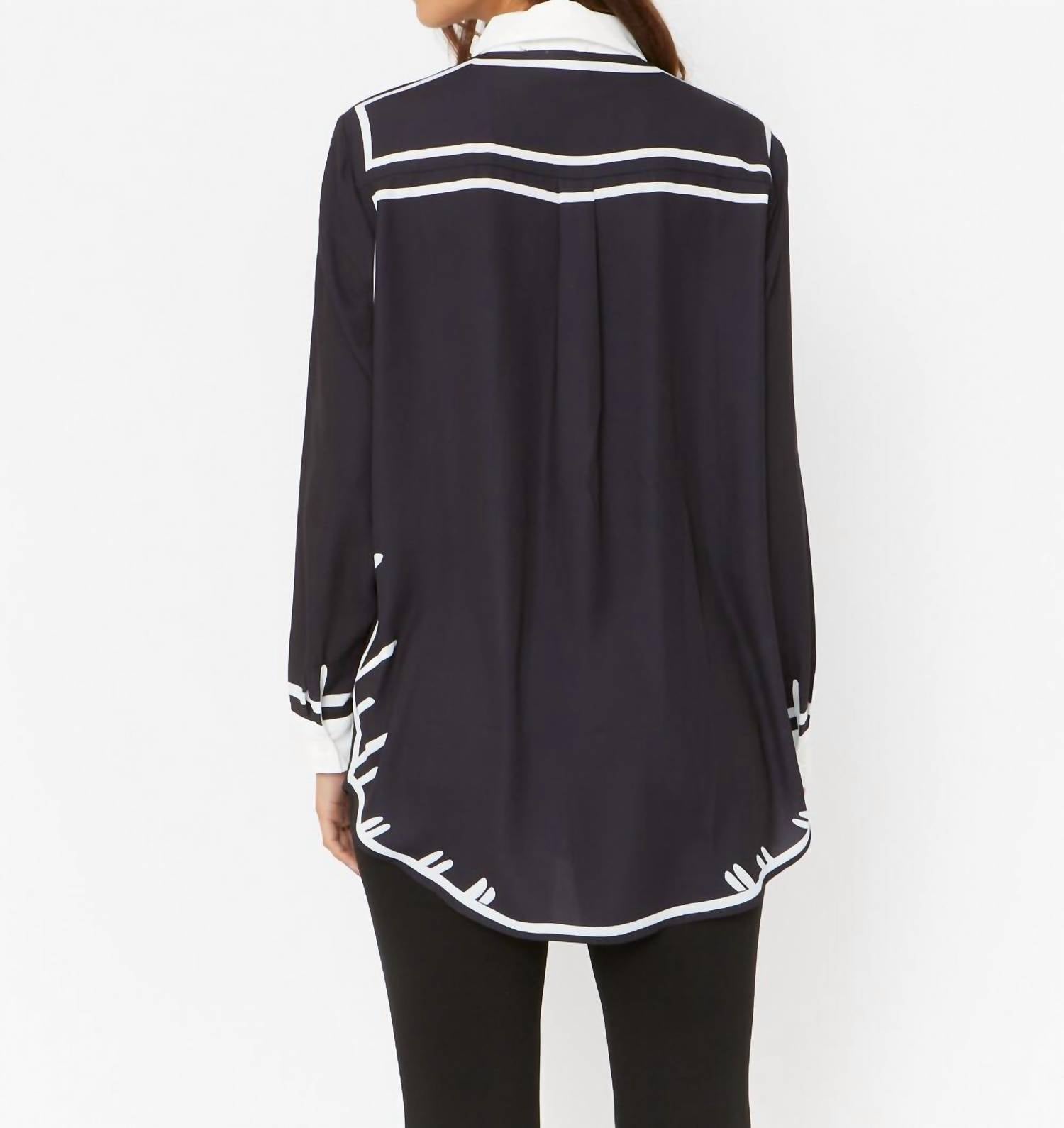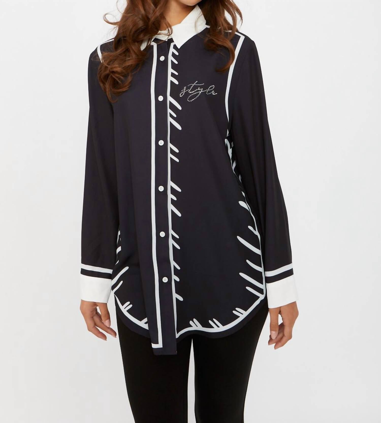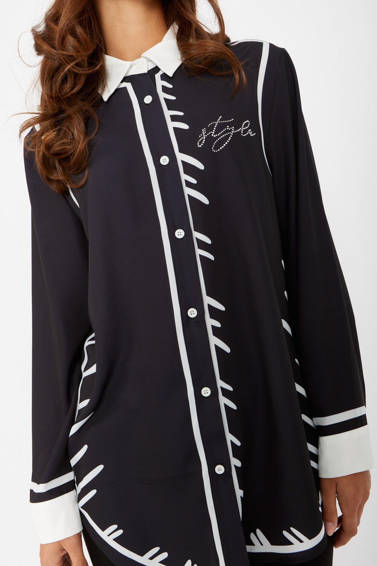 This button down shirt is comfortable yet polished. Discover the perfect blend of chic and minimalistic style with this hip-length, regular fit top from Frank Lyman. Featuring a sophisticated collar and button closure, this long-sleeve piece is adorned with jewel embellishments and an abstract striped pattern, making it ideal for both casual and office settings. The buttoned details add an extra touch of elegance to your everyday wardrobe. 100% Polyester No pockets No zipper Our model is 5'9"/175 cm and wears a size 6. Approximate length (size 12): 31" - 79 cm