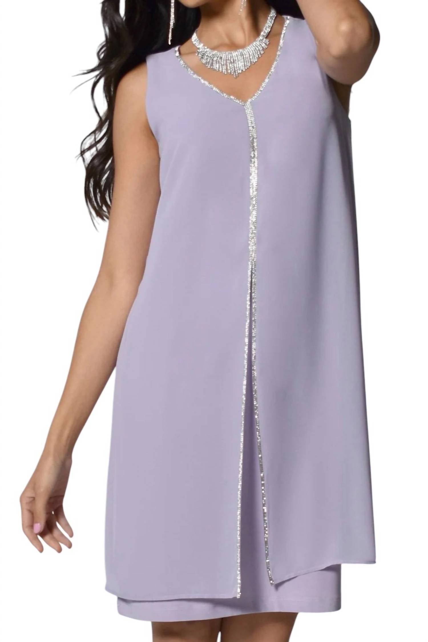 Discover the elegance of the Frank Lyman Silky Knit Cocktail Dress in a captivating iris shade. This sleeveless, mini shift dress features a flattering attached sheer overlay with a silver-embellished front and a V-neckline. Made from a blend of 95% polyester and 5% elastane, it measures approximately 37 inches long with an additional 2 inches on the shoulder. Proudly made in Canada, this dress offers easy wear with its pull-on style and requires hand washing in cold water.