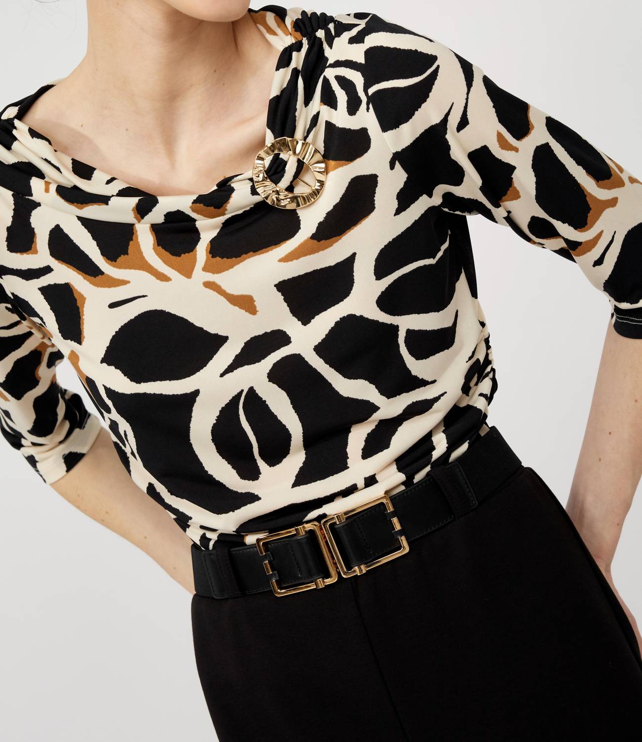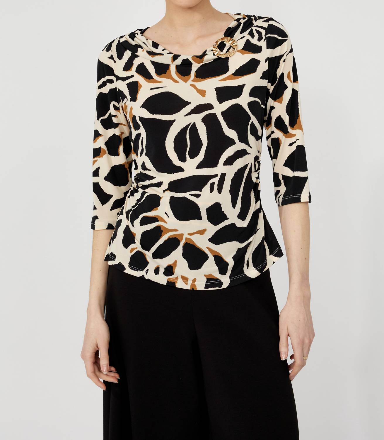 Fit to perfection and effortlessly chic. Elevate your style with the Frank Lyman Cowl Neck Abstract Pattern Pullover, a piece that artfully blends chic and sophistication. Crafted with three-quarter sleeves and featuring a pull-on design, this regular-fit top is made from 95% Polyester and 5% Elastane, ensuring a comfortable yet flattering silhouette. Ideal for spring outings or dinner parties, its abstract black and beige pattern adds a contemporary touch. Length: Approx. 26" (66 cm) for size 12. Care: Hand wash only. Model is 5'9" and wears a size 6.