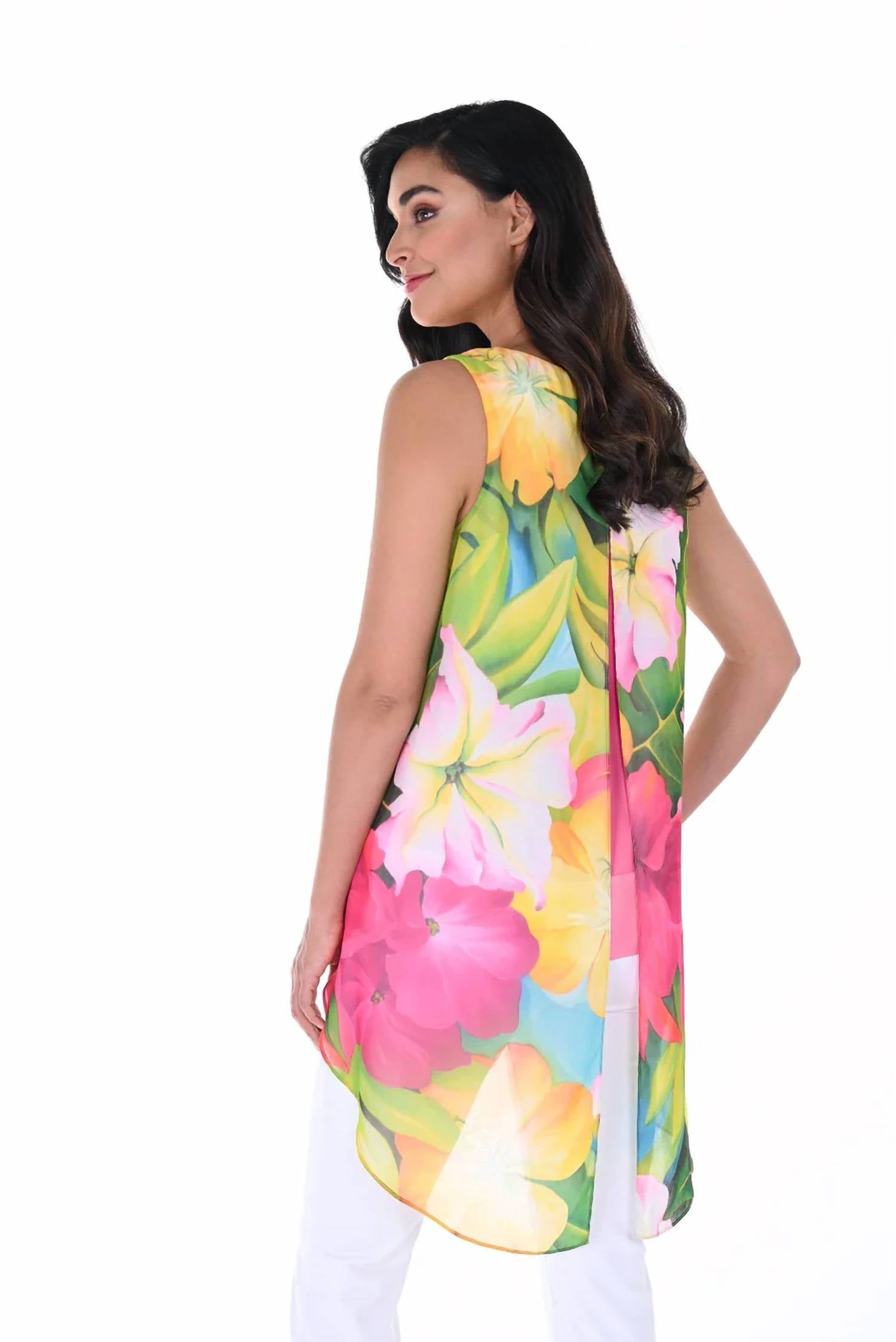 Discover the versatile charm of this tunic blouse, designed with both layering and standalone wear in mind. Its flattering silhouette and stylish details make it a closet essential. Introducing the Frank Lyman Floral Print Woven Tunic, a must-have for your summer wardrobe. This exquisite sleeveless tunic is crafted from lightweight chiffon with a pull-on closure, featuring a beautiful floral pattern in vibrant fuchsia and green. The high-low hem and split back detail add a touch of elegance, while the design offers a relaxed fit perfect for evening events. Made from 100% polyester, it’s easy to care for with hand wash and line dry instructions. Total length: 26" at the shortest point, 39.5" at the longest point.