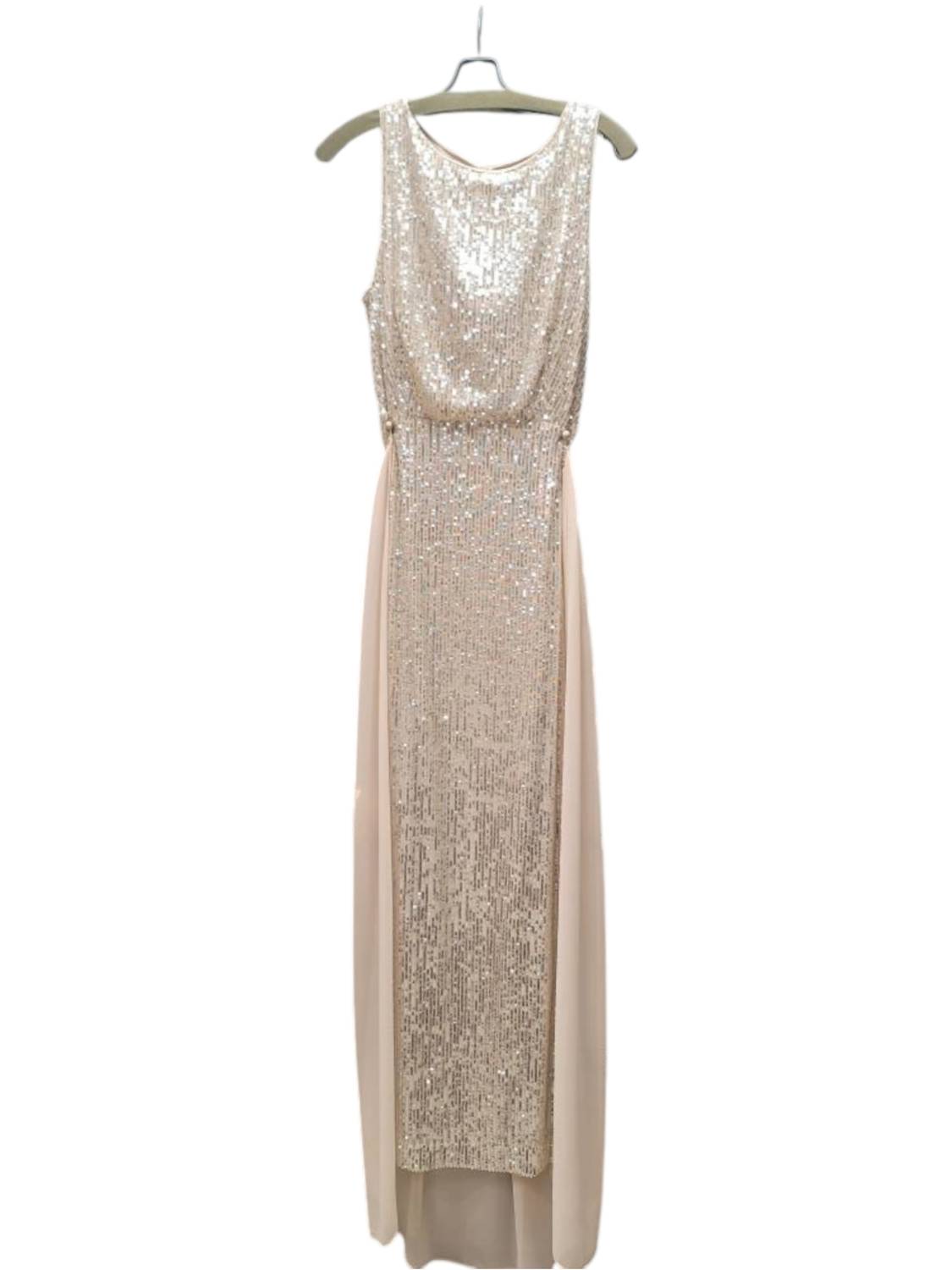 Designed for the bride who values understated elegance. Its classic design and perfect fit make it the ideal choice for your special day. Say yes to the dress! Introducing the Women's 2 Piece Sequin Gown With Overskirt by Frank Lyman, crafted for exceptional evening elegance in Nude/Silver. This sleeveless gown showcases a textured sequin design with a classic scoop neckline, and an A-line silhouette that embodies quiet luxury. Suitable for weddings or New Year's Eve, it's the perfect choice for fall occasions.