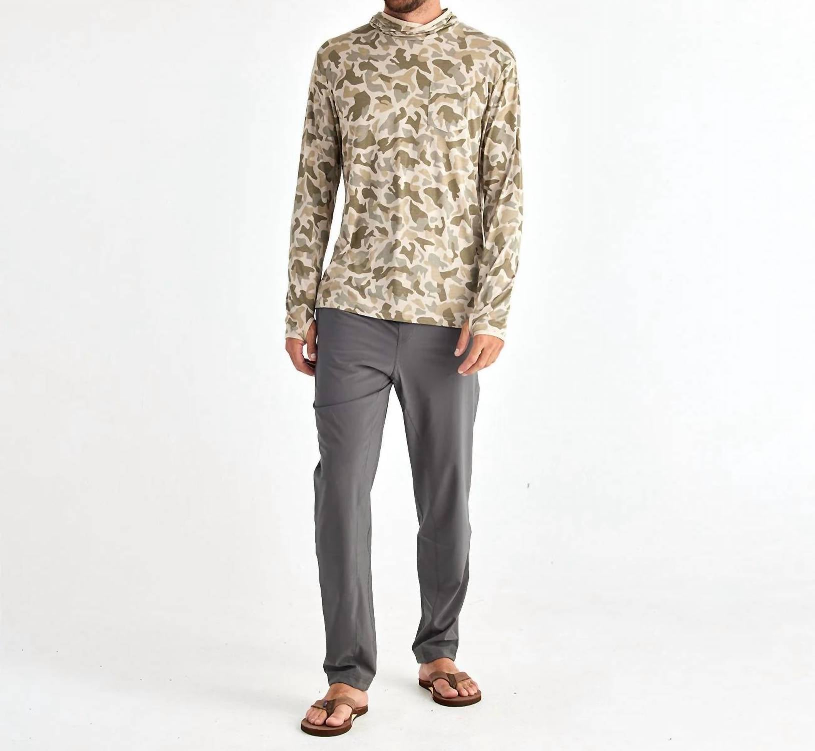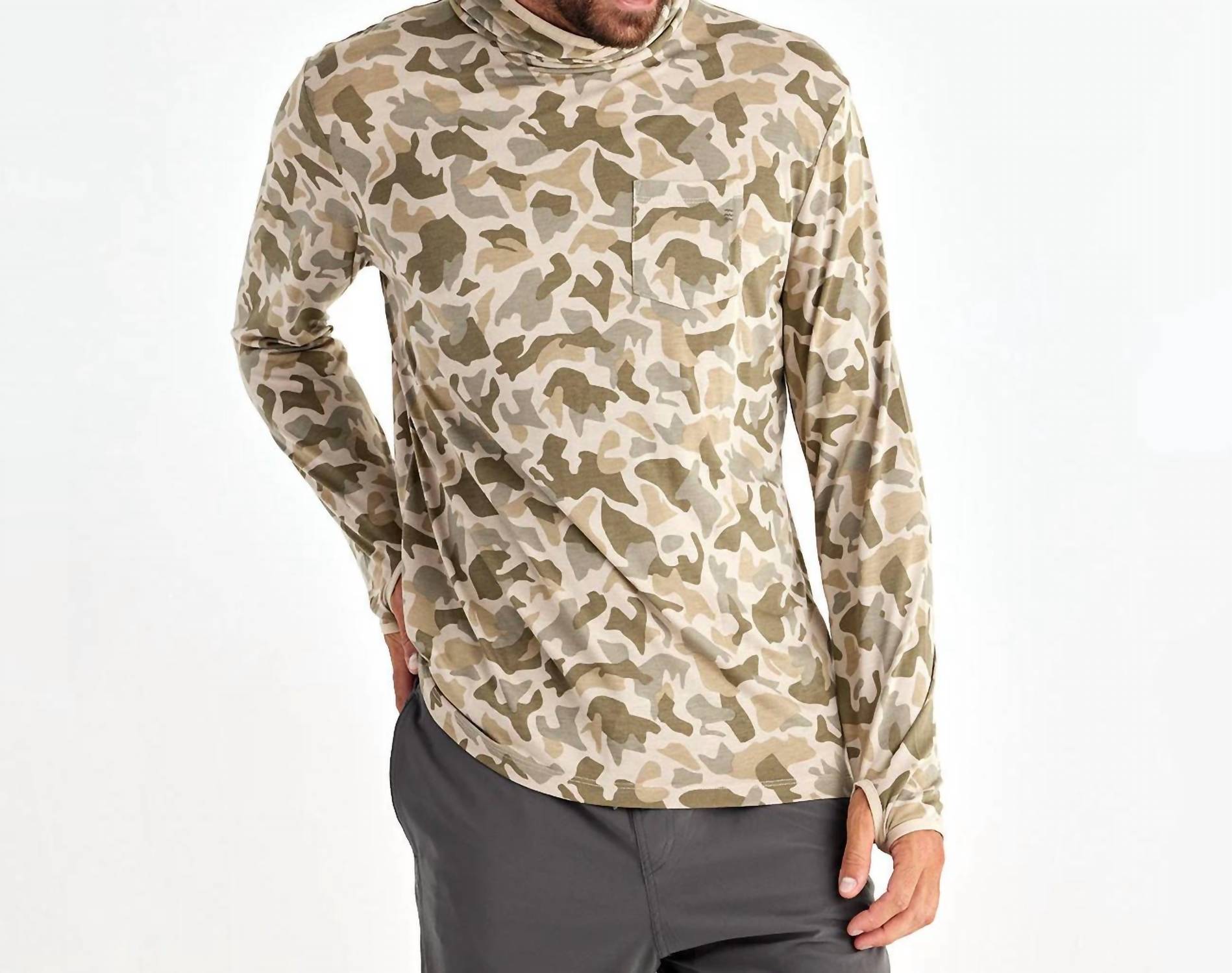 Whether you're running around town or lounging at home, this sweatshirt works for both. Discover the Lightweight Hoodie by FREE FLY, a men's streetwear essential in a trendy Vintage Camo pattern. This ultra-lightweight design with long sleeves offers breathable comfort and UPF 20+ sun protection, ideal for summer travel. The pull-on style includes a versatile crossover hood, thumbholes to keep sleeves in place, and a convenient left chest pocket. Perfect for those seeking both functionality and style in their activewear collection.