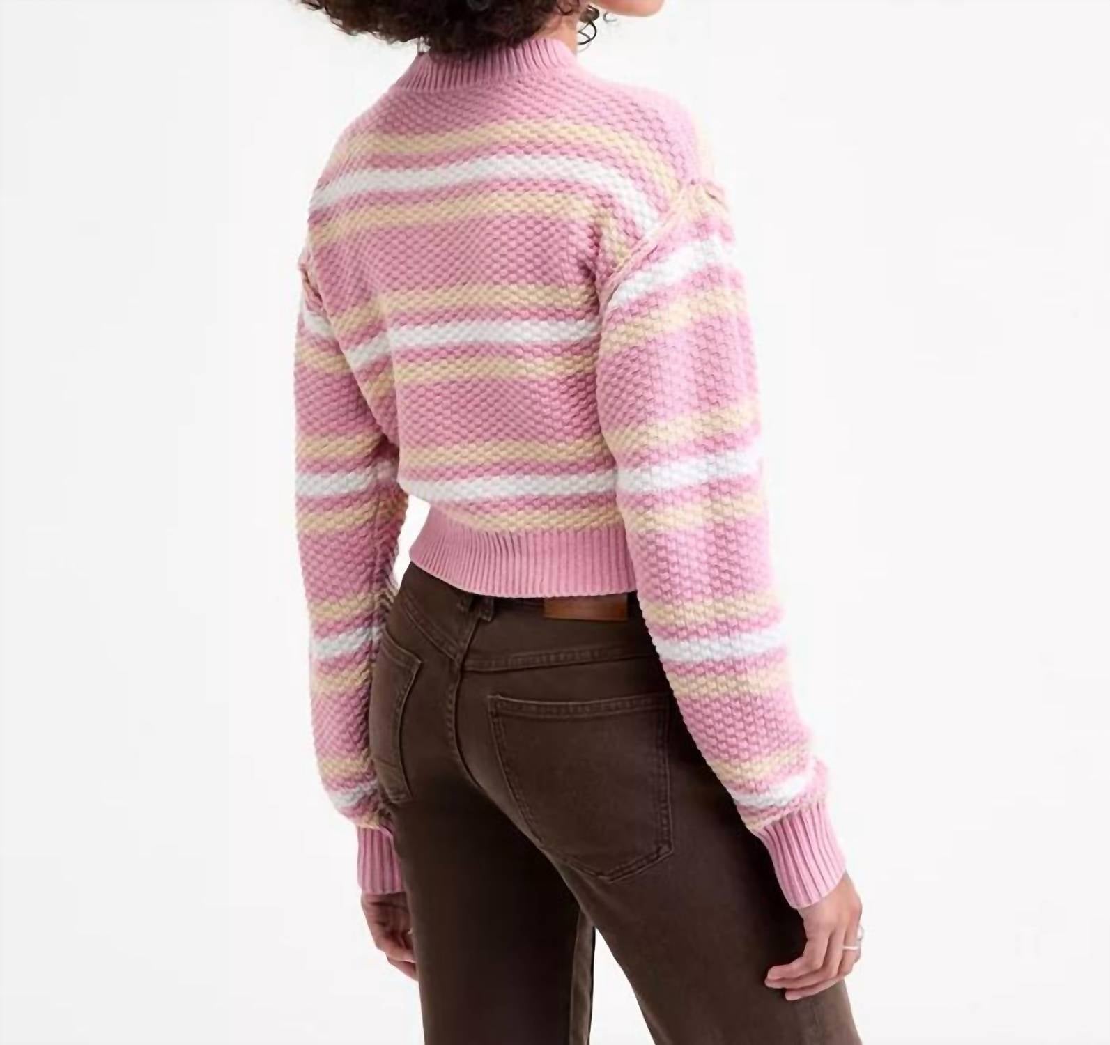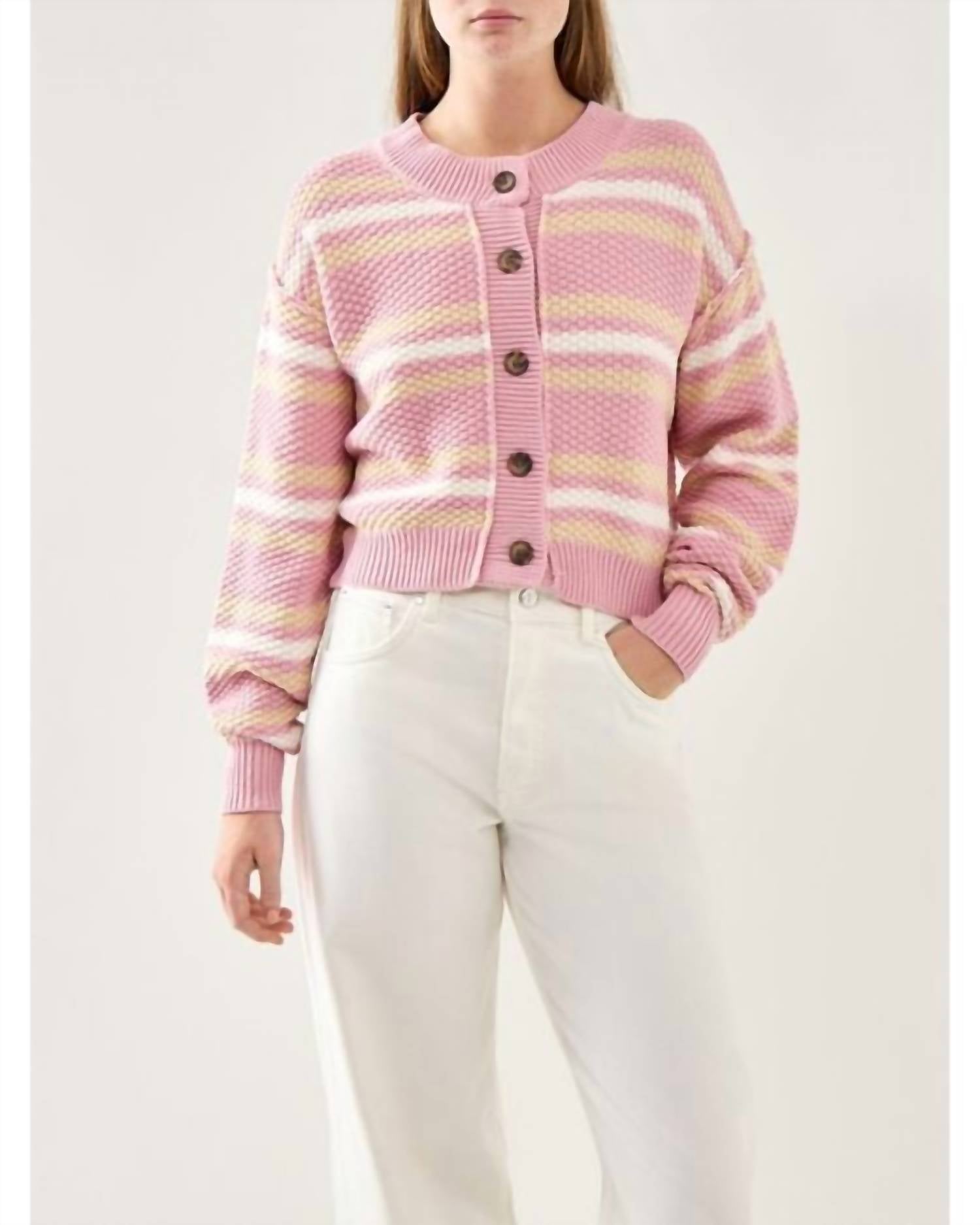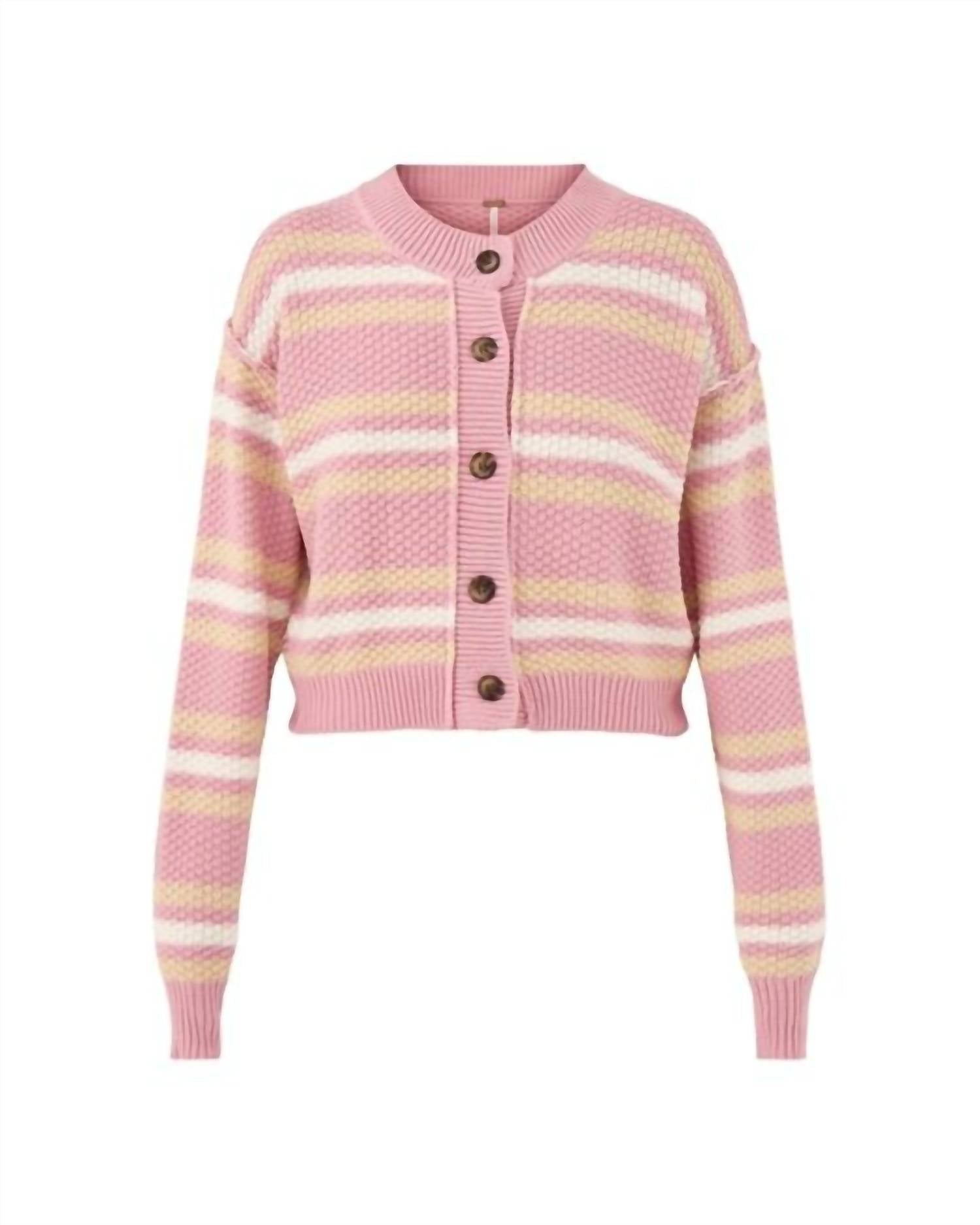 This cardigan will be a sweater-rotation favorite. Meet the Lila Stripe Cardigan by Free People, an indispensable layering piece for any wardrobe. Featuring long sleeves and crafted from a cotton blend, this cardigan boasts a cropped 18.5" length and a playful stripe pattern in a Pink Combo hue. It comes with a crew neckline and a button closure for timeless appeal, making it perfect for Thanksgiving gatherings or holiday parties. Care instructions include hand washing to maintain its textured knit charm.