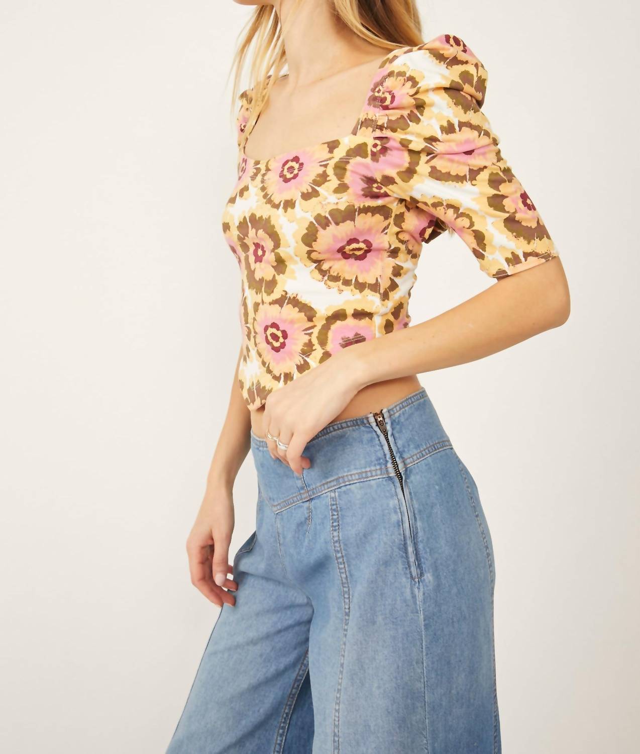 A super cute print crop top for Summer! It will work perfectly with your high rise flares or cutoffs! Strappy floral print cropped top. Bishop sleeves. Handkerchief hem. Bust measures 28" on size small. Body length 17" on size small.