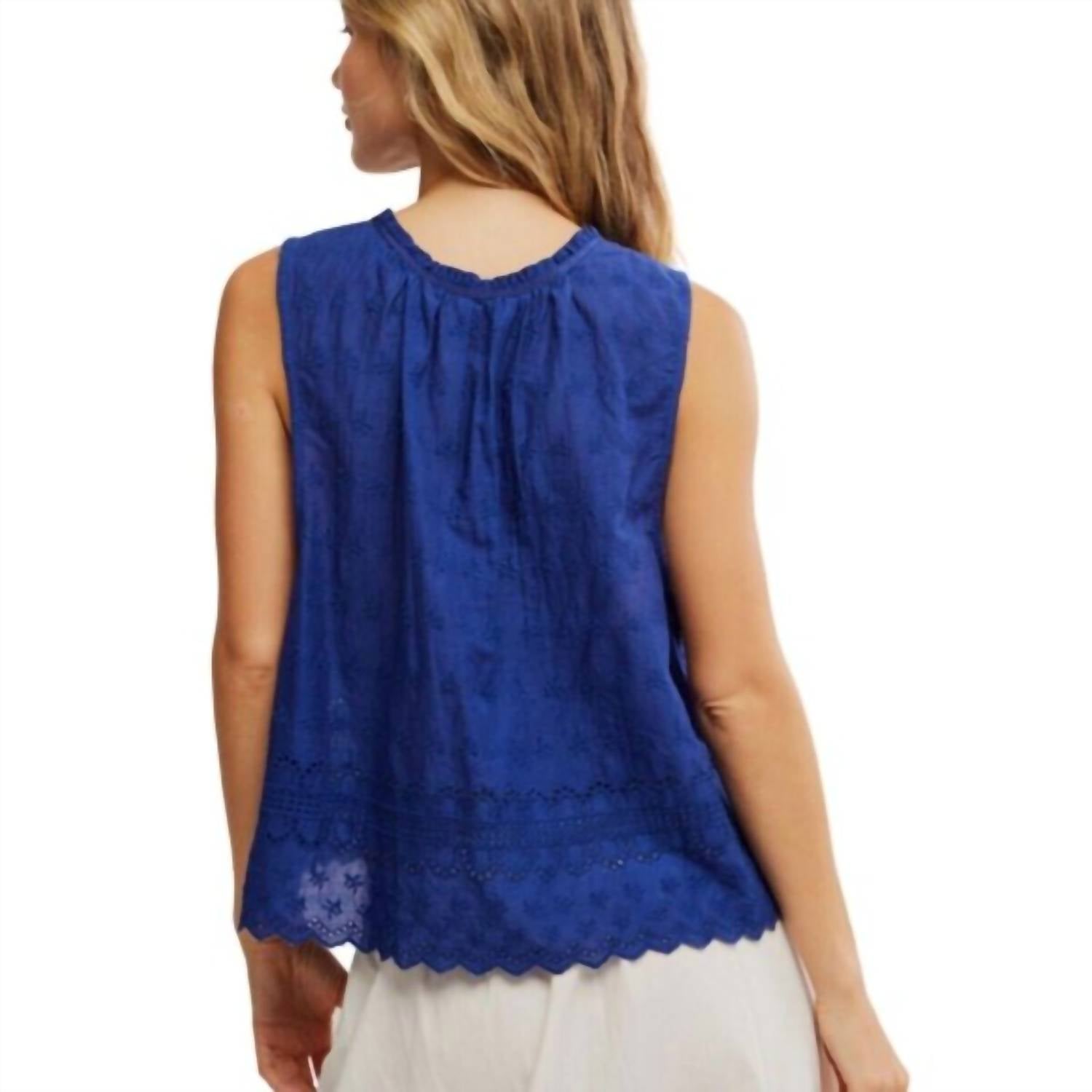 Fit, fabric and functionality. This tank top checks all the boxes. Introducing the Marina Eyelet Tank Top by Free People, a perfect vacation piece in Bellwether Blue for a minimalist and spring-ready style. This sleeveless top features intricate eyelet embroidery and playful ruffle details, with a classic scoop neck for added charm. Crafted from pure cotton, its pull-on closure ensures easy wear, while the comfortable loose fit measures 23 inches across the bust and 21 inches in length. Care for this solid pattern tank with a simple machine wash, making it an effortless addition to your wardrobe.