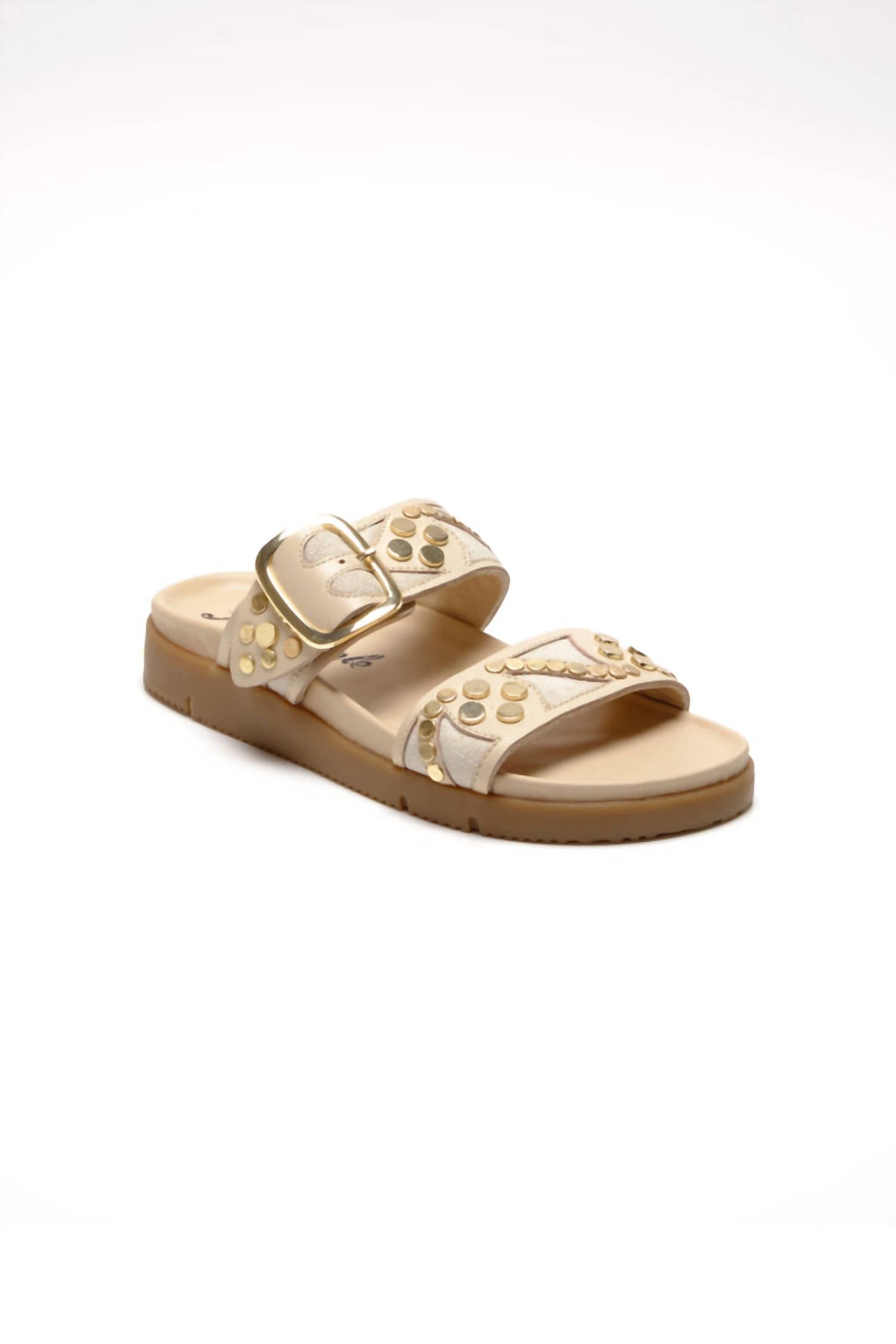 Flowy dresses, cropped pants, and even jumpsuits... this sandal works with them all! Step into casual elegance with the Women's Revelry Studded Sandal by Free People, perfect for a flexible fit. These sandals feature an open toe and a stylish buckled strap on the leather upper, accentuated with studded detailing. Made of leather upper and lining with a thermoplastic rubber (TPR) sole, they offer stability on any surface. Crafted in India, these slip-on sandals boast a 1.1" platform, blending comfort with contemporary style.