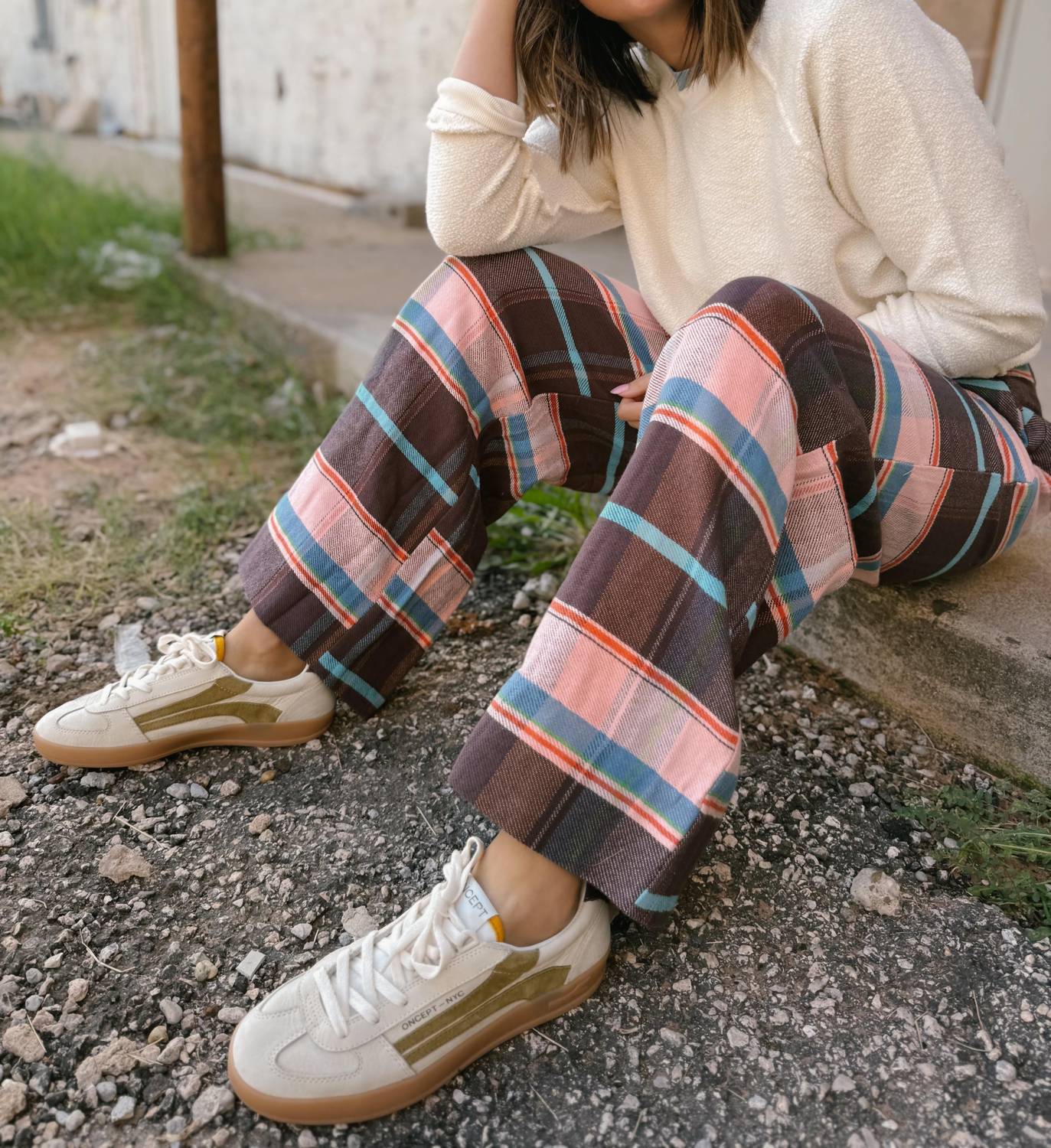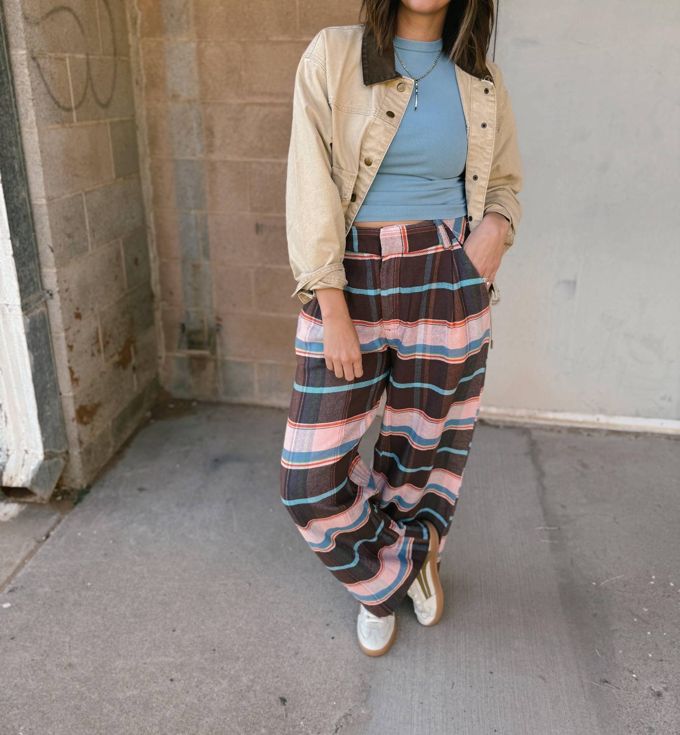 Elevate your wardrobe with Free People's Buckle Back Plaid Trousers, designed in a chic brown combo for a stylish look. These relaxed-fit, wide-leg trousers are made entirely from comfortable cotton and feature a mid-rise cut with an adjustable buckle tab at the back. Crafted for practicality, they come with a four-pocket design and are finished with a zip fly and hook-and-eye closure. Measurements for size 4 include a 14.5-inch waist and 40-inch length. Care instructions: Machine wash cold, tumble dry.
