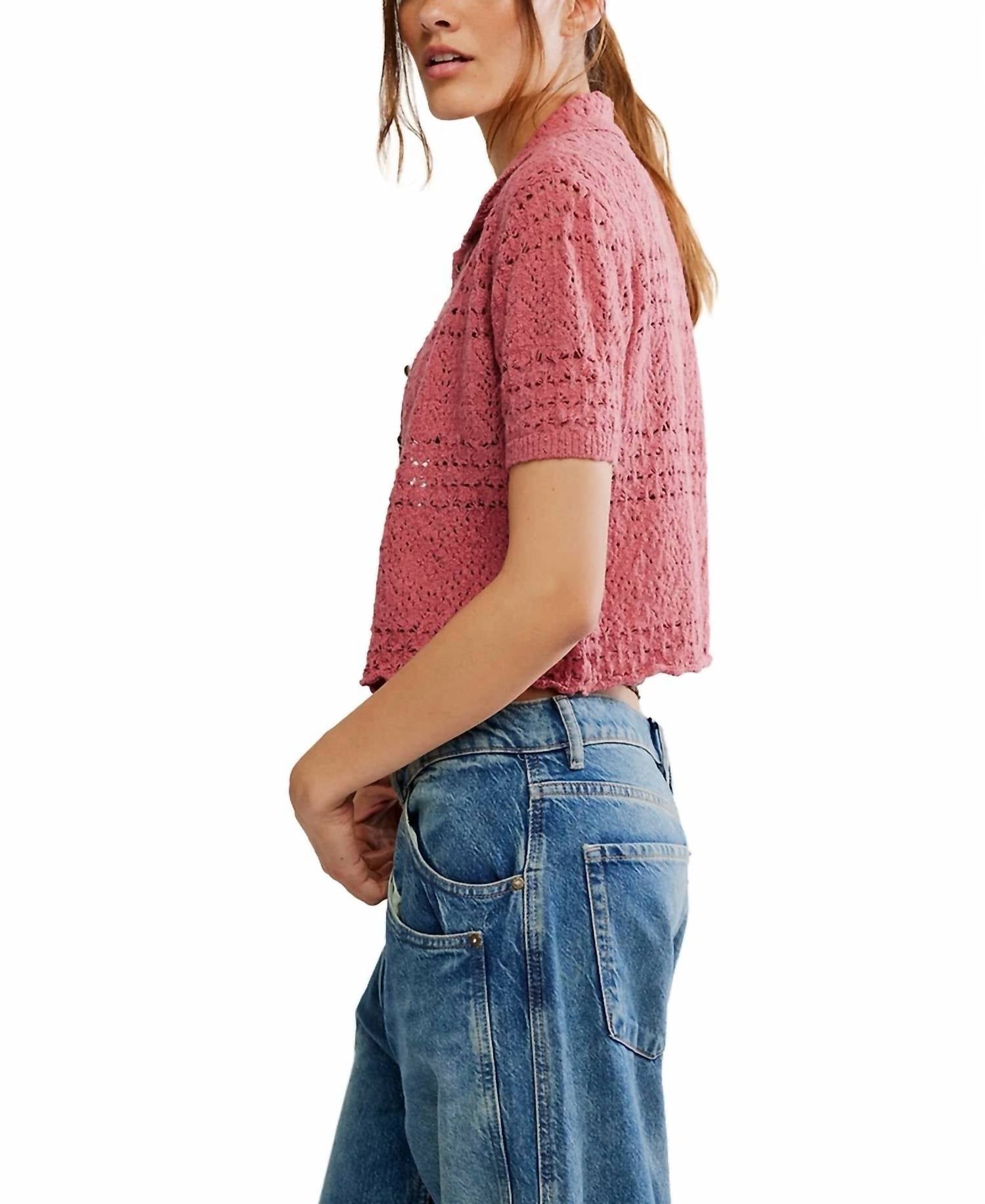 This cardigan will be a sweater-rotation favorite. Embrace effortless style with the Daylight Cardigan by Free People in a charming faded rose hue, perfect for any vacation occasion. This short-sleeve cardigan features a collared neck and textured crochet knit with a scalloped trim, delivering a boho chic vibe. Made from a soft cotton blend of 62% cotton, 24% polyester, and 14% viscose, it offers comfort and a relaxed fit, approximately 18.5 inches in length. Closure: Button closure. Care: Hand wash.