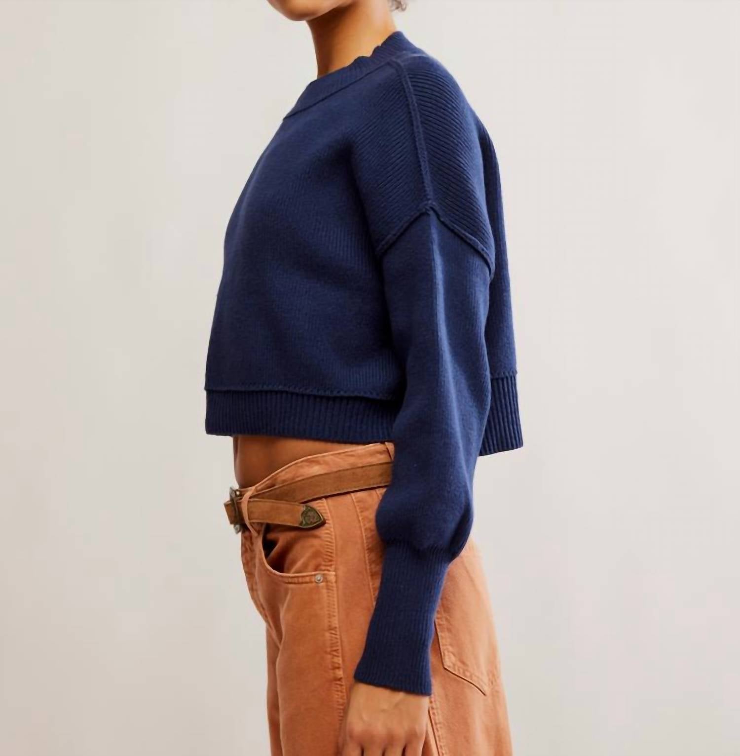 Stay warm and stylish in this versatile and effortlessly cool knitwear staple. Wear it alone or layered, it's the perfect sweater for the season and you'll wish you had it in every color. Elevate your wardrobe with the Easy Street Crop Sweater by Free People, a chic navy pullover in a solid monochrome look. Designed with long sleeves and a slouchy, cropped fit, this sweater features a mock neckline and defined seaming for a touch of sophistication. Crafted from a cozy cotton blend with 56% cotton, 37% acrylic, 6% polyamide, and 1% elastane, it ensures both comfort and style. Closure: Pull on. Care: Hand wash cold, lay flat to dry.