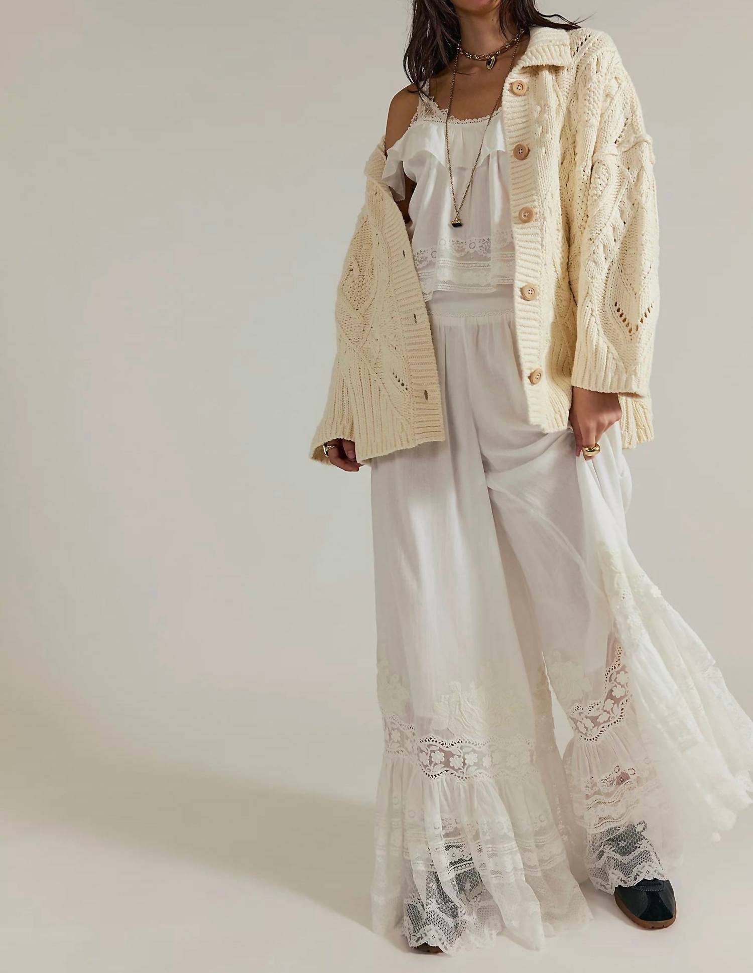 This cardigan will be a sweater-rotation favorite. Introducing the Heart You Cardigan by Free People, an oversized ivory cardigan perfect for sophisticated layering. This piece features long sleeves, a collared neckline, and cable knit details for added texture. Crafted from 100% cotton, it boasts a button closure and includes practical side pockets. Care: Hand wash cold. Measurements for size X-Small: Chest 26.5 in., Length 27 in. Alyssa is wearing an XS.