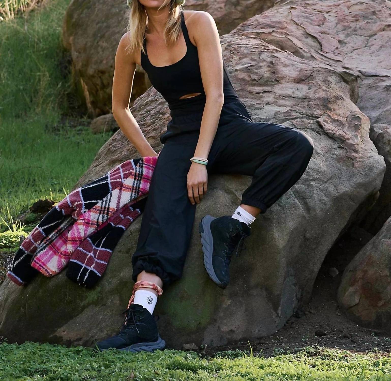 The perfect outfit choice when you you need something quick to throw on and still want to look efforlessly cool. Elevate your fitness wardrobe with the Righteous Sleeveless Onesie by Free People, a stylish blend of function and comfort in solid black. This athletic onesie features a scoop neckline, a fitted top with a front cutout, and crisscross backstraps, paired with a relaxed, ankle-length bottom. Crafted from 62% Polyamide and 38% Elastane for the top, and 100% Polyester for additional elements, it includes convenient pockets and a high rise for added comfort. Originating from international standards, it is suitable for machine wash, making it a versatile choice for your workout sessions. Measurements for size small: 28.5-inch inseam, 43-inch hips, 24.5-inch waist, 27.5-inch bust, and 12-inch rise.