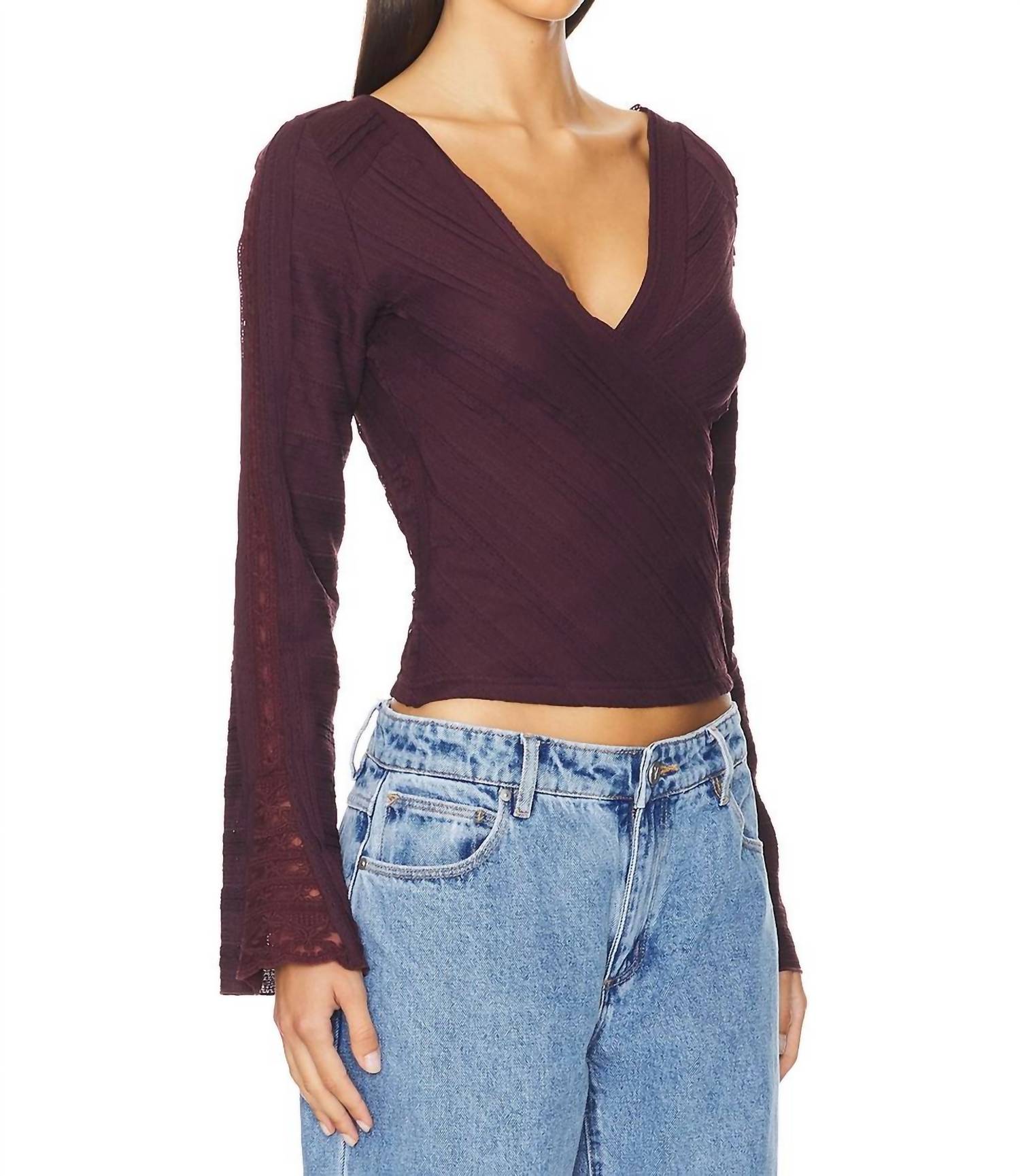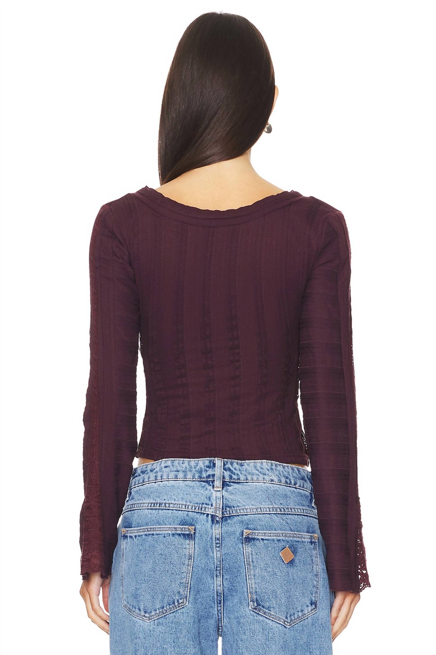 Great fit, cute design, soft fabric. You'll love everything about this long sleeve tee. Elevate your wardrobe with the Rocky Long Sleeve Top by Free People in a rich Wine Tasting hue. This women's top features long sleeves adorned with elegant lace trim and a reversible V-neck design with a slight scoop back, perfect for versatile styling. Crafted with a textured finish, it is composed of 99% Polyester and 1% Elastane, offering comfort and style. Hand wash. Imported.
