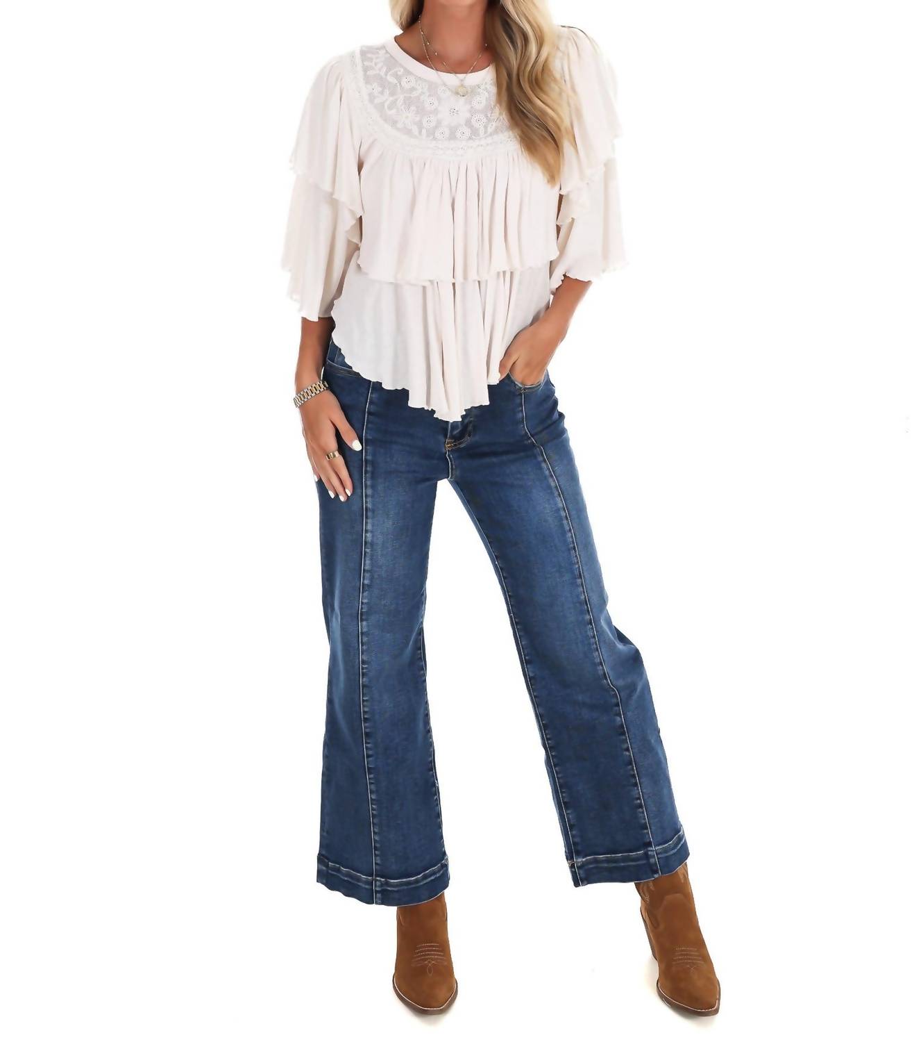 The short sleeve tee you'll want in every color. Discover the Rose Party Tee by Free People, an elegant addition to your summer wardrobe in the delightful color Sugar Swizzle. This tee features short ruffled sleeves and a unique tiered design crafted from 100% cotton, making it both stylish and comfortable. It boasts a charming cropped fit with a swingy, boxy silhouette and intricate embroidered mesh panels for added texture. Made in India, this pull-on style is easy to care for with machine wash instructions, ensuring you stay chic with minimal effort.